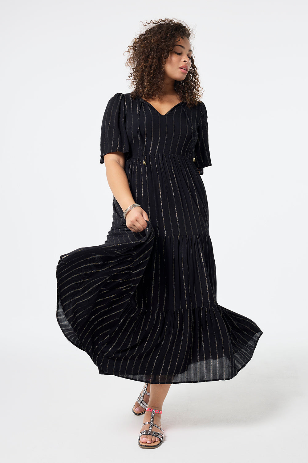 This shimmering maxi dress is destined to be a favourite in your wardrobe. Finished with ties at the neckline, a tiered skirt and angel sleeves, it makes the perfect plus one to all those parties you've got coming up...