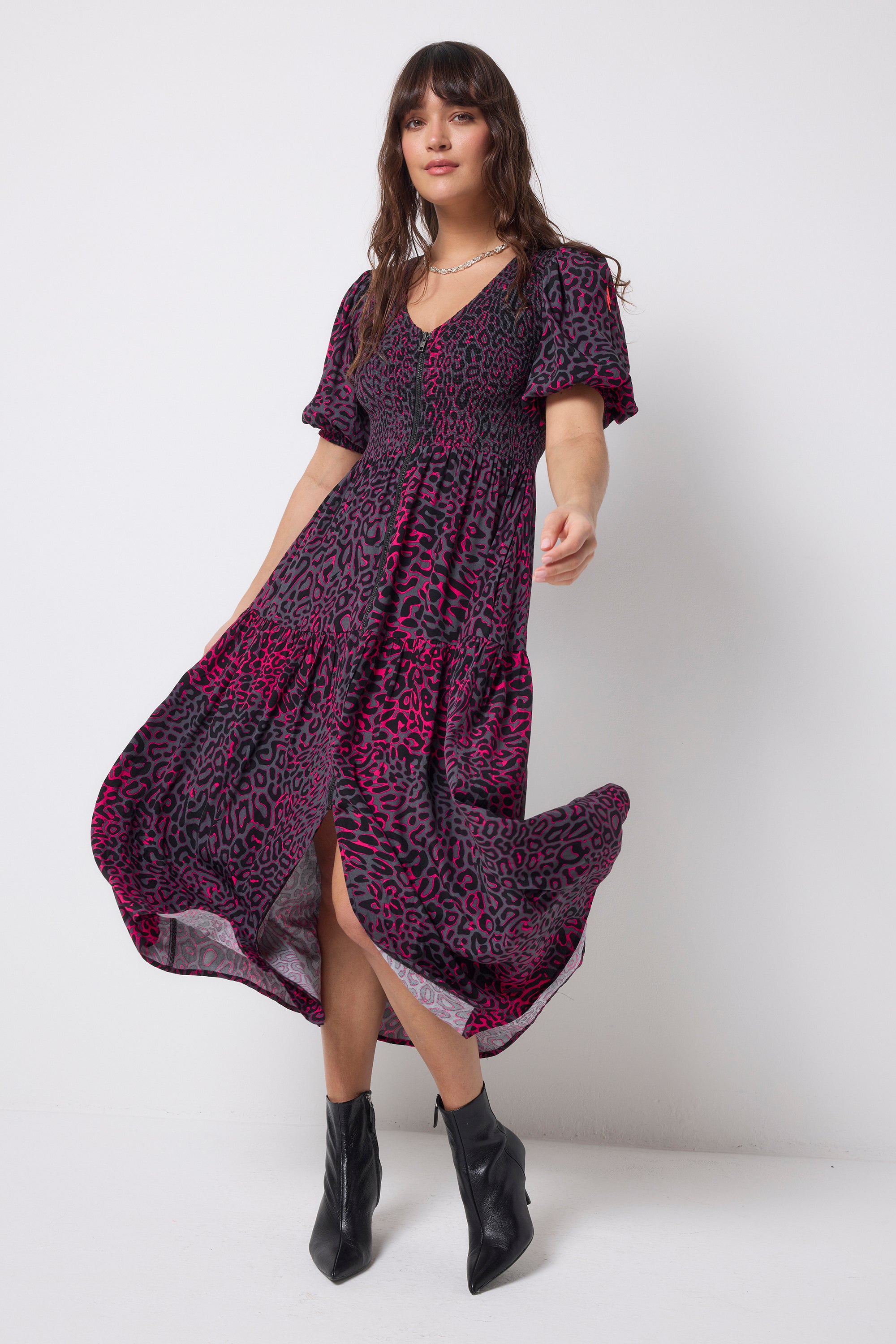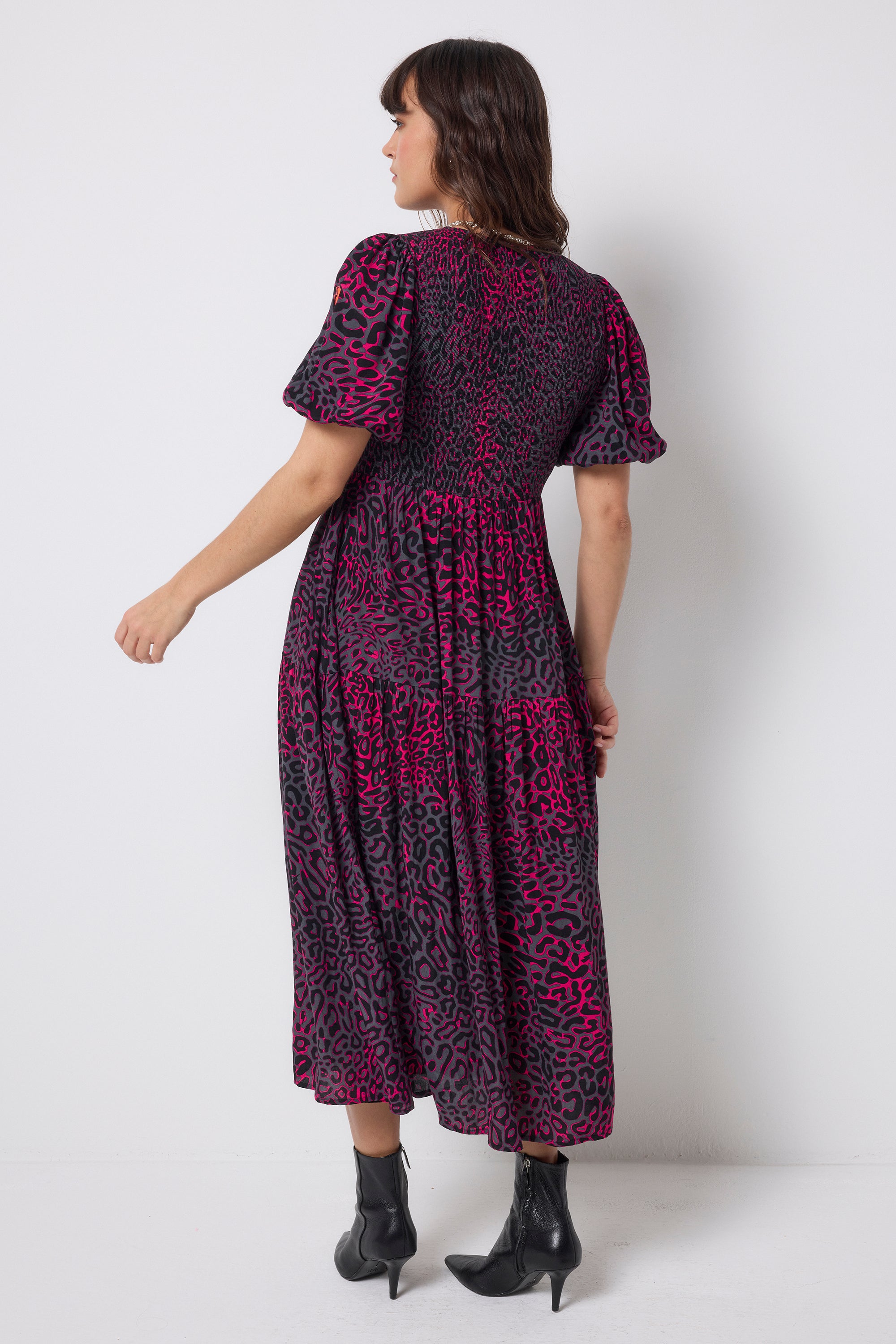 This grey with pink leopard ray and lightning bolt print midi dress is destined to be a favourite in your wardrobe. It's finished with pretty short puff sleeves and a tiered skirt for an added touch of style.