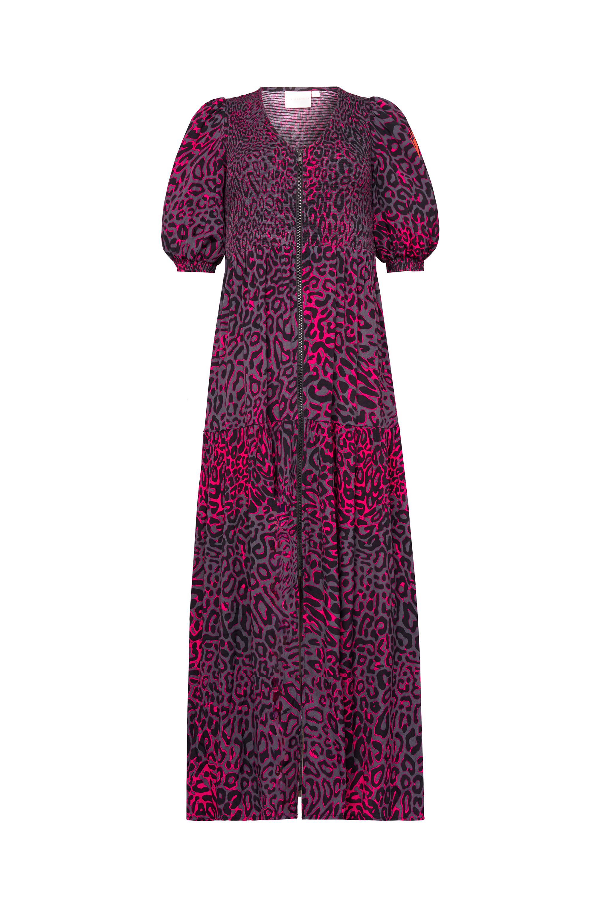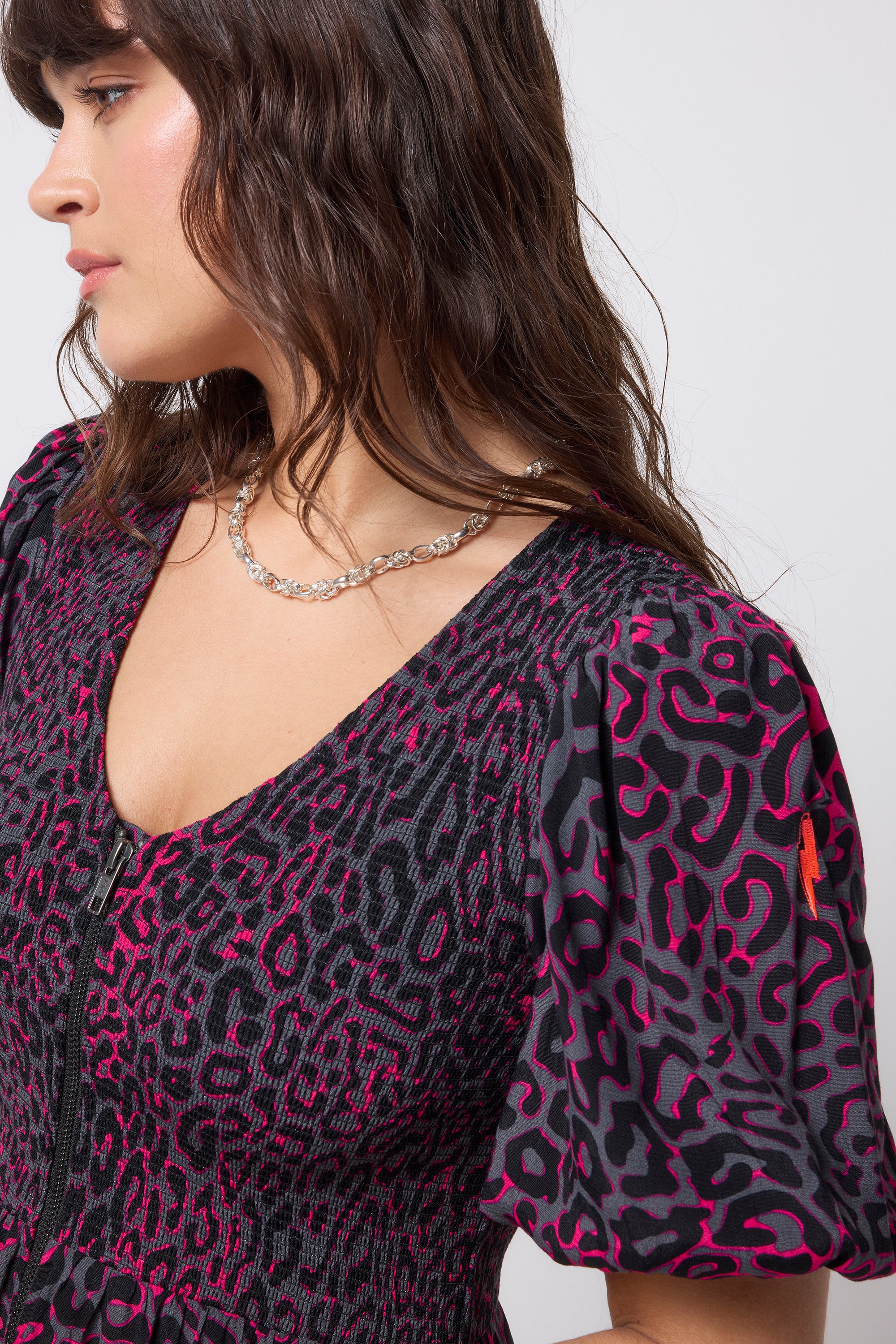 Grey with Pink Leopard Ray Shirred Zip Detail Midi Dress