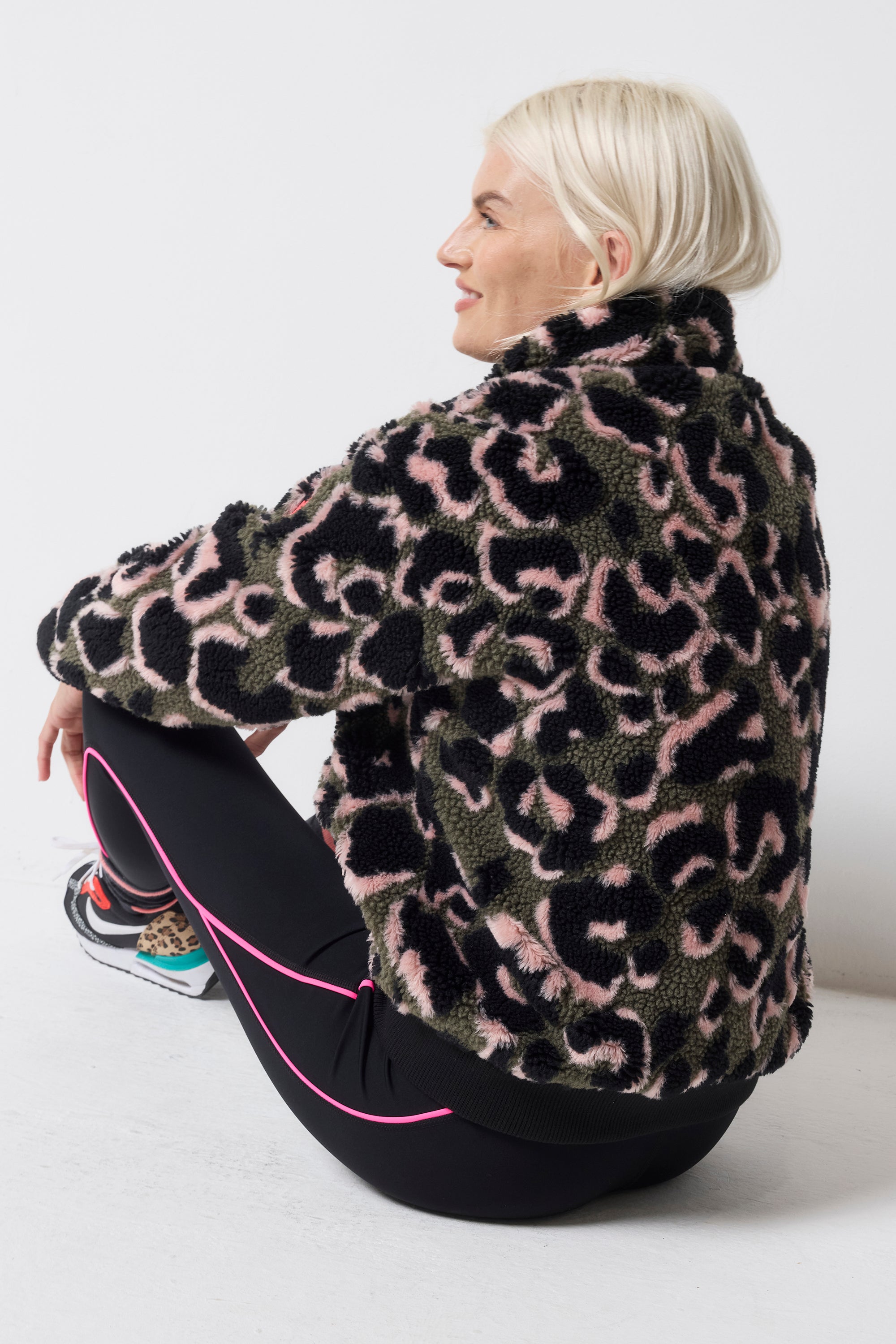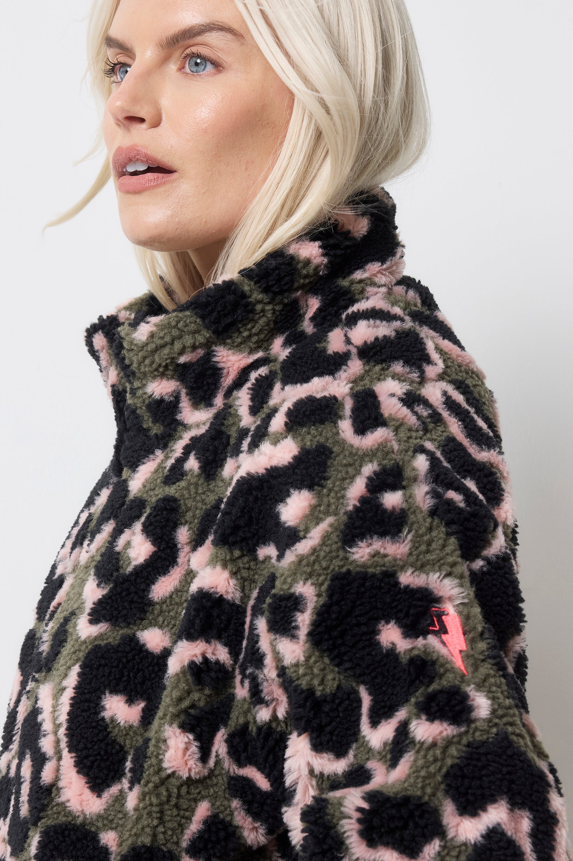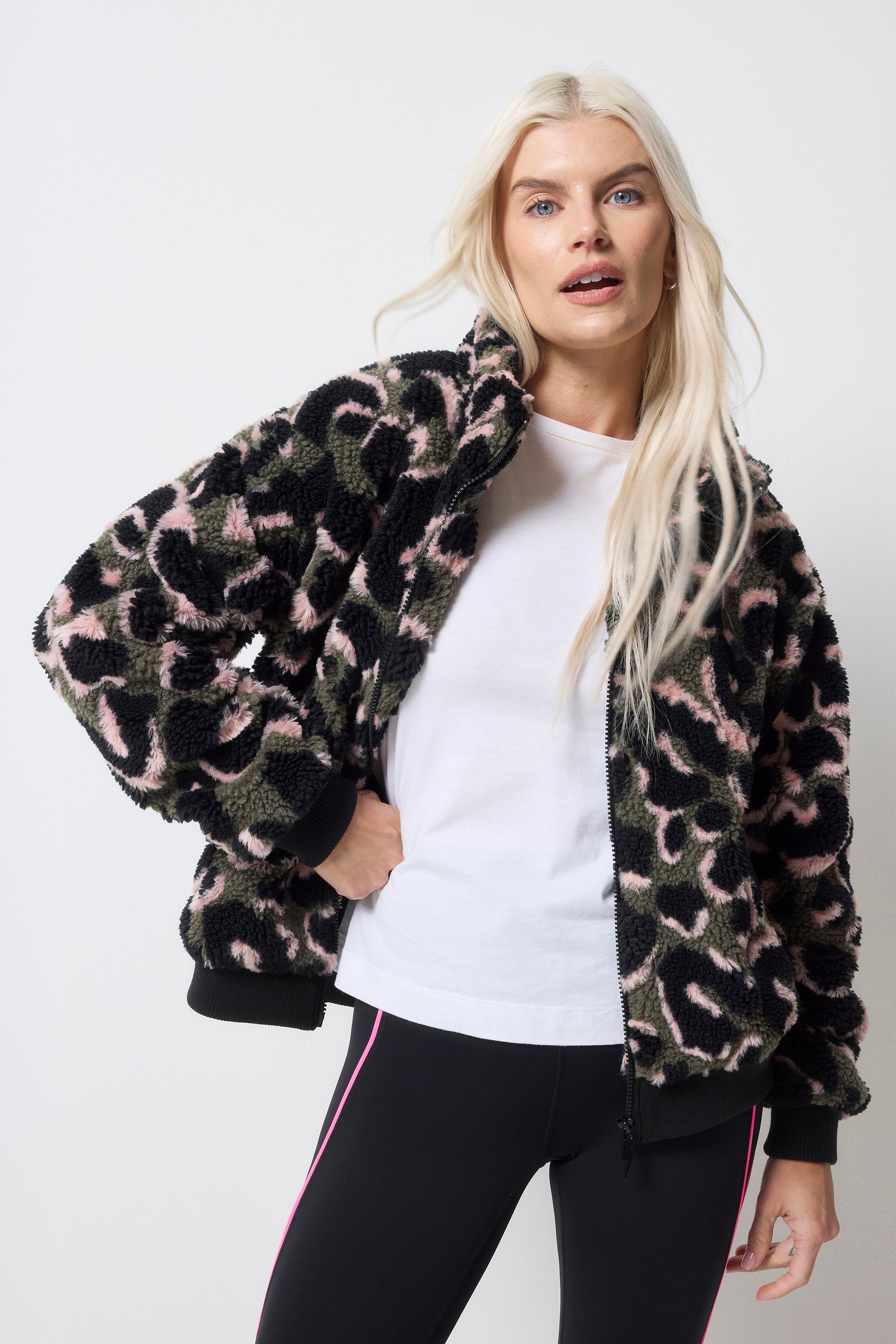 Stay snug in our cosy khaki leopard fleece bomber jacket. Two pockets add a practical finish. The versatile style is perfect for outdoor adventures or as an everyday stylish cosy layer.