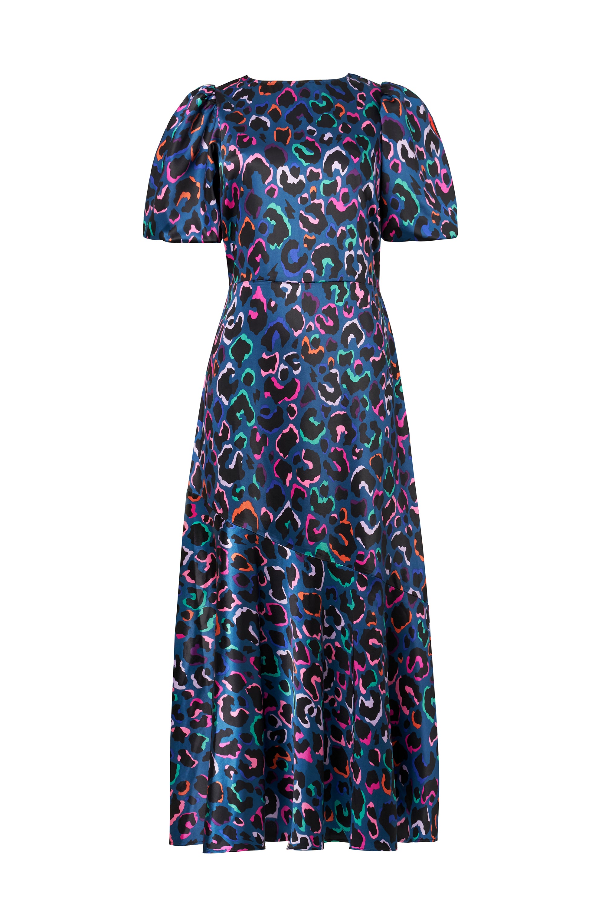 Bold and beautiful, this teal with rainbow shadow leopard and lightning bolt midi dress will make a joyful addition to your wardrobe. Made in a soft satin fabric, the midi length dress features a peplum hem skirt and short puff sleeves.