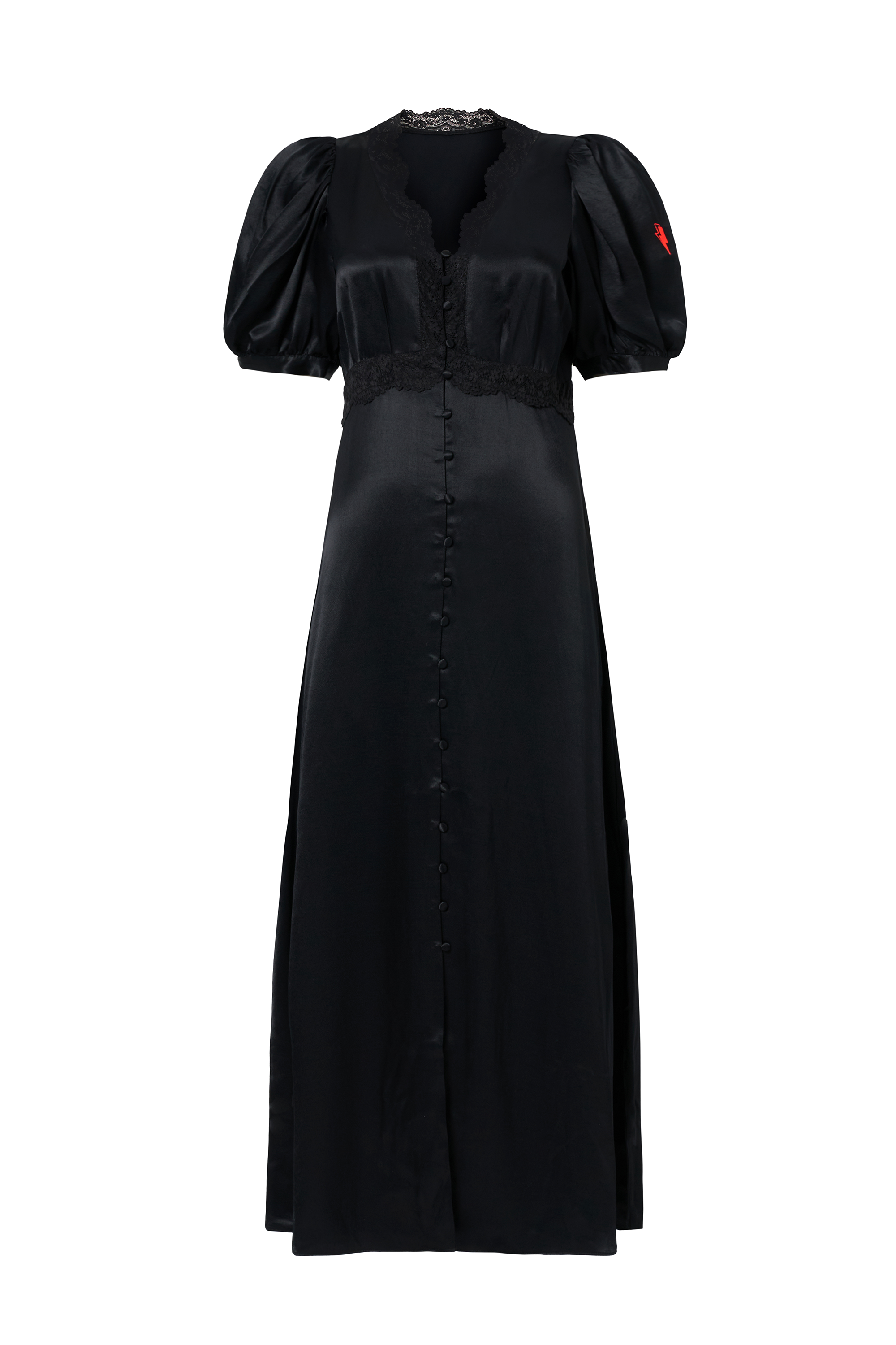 Black with Lace Trim Satin Puff Sleeve Midi Tea Dress