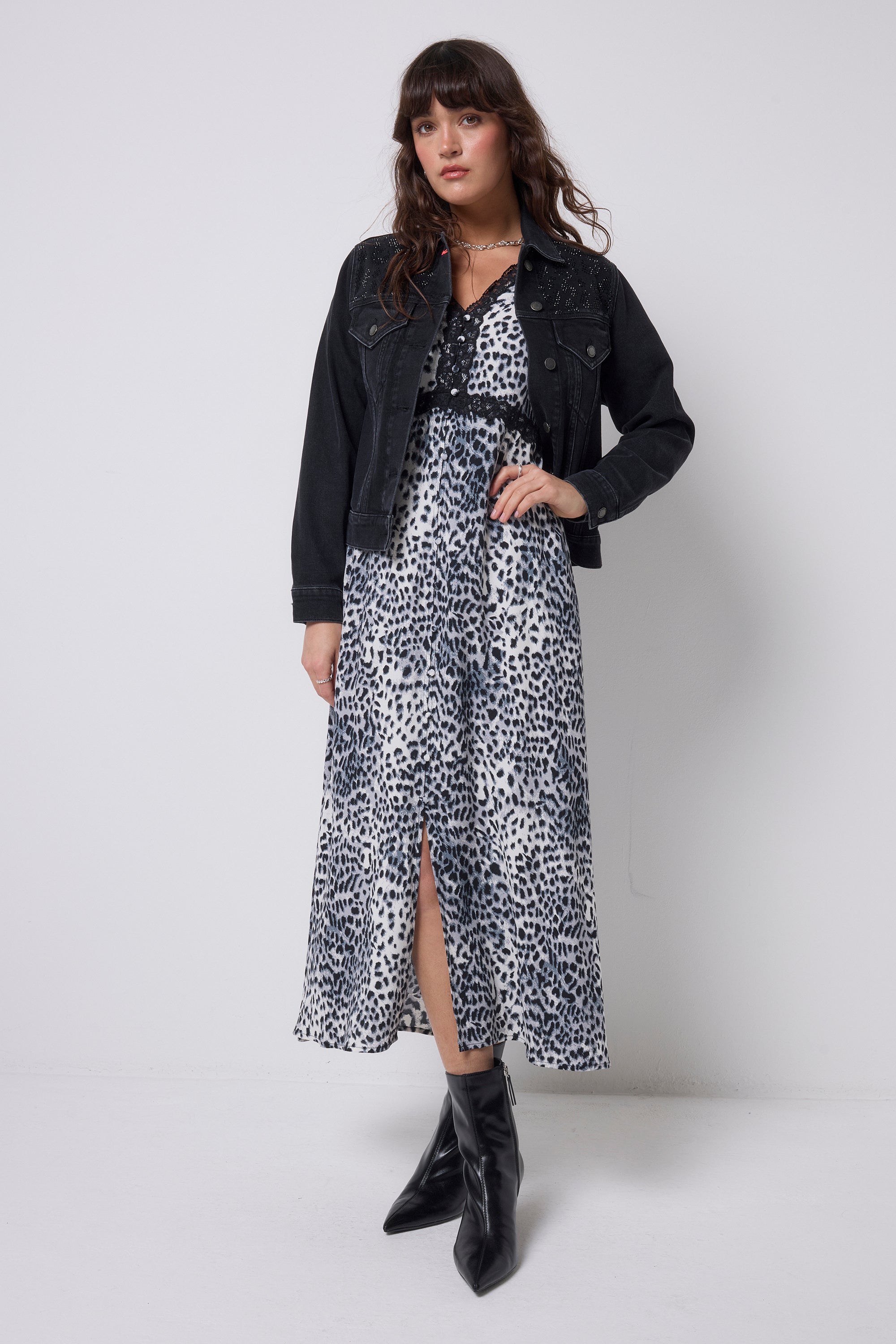 Bold and beautiful, this grey cheetah with lace trim dress will make a joyful addition to your wardrobe. Featuring a universally flattering V-neck, short puff sleeves and a classic midi length, style yours with trainers for the day and heeled boots for evening plans.
