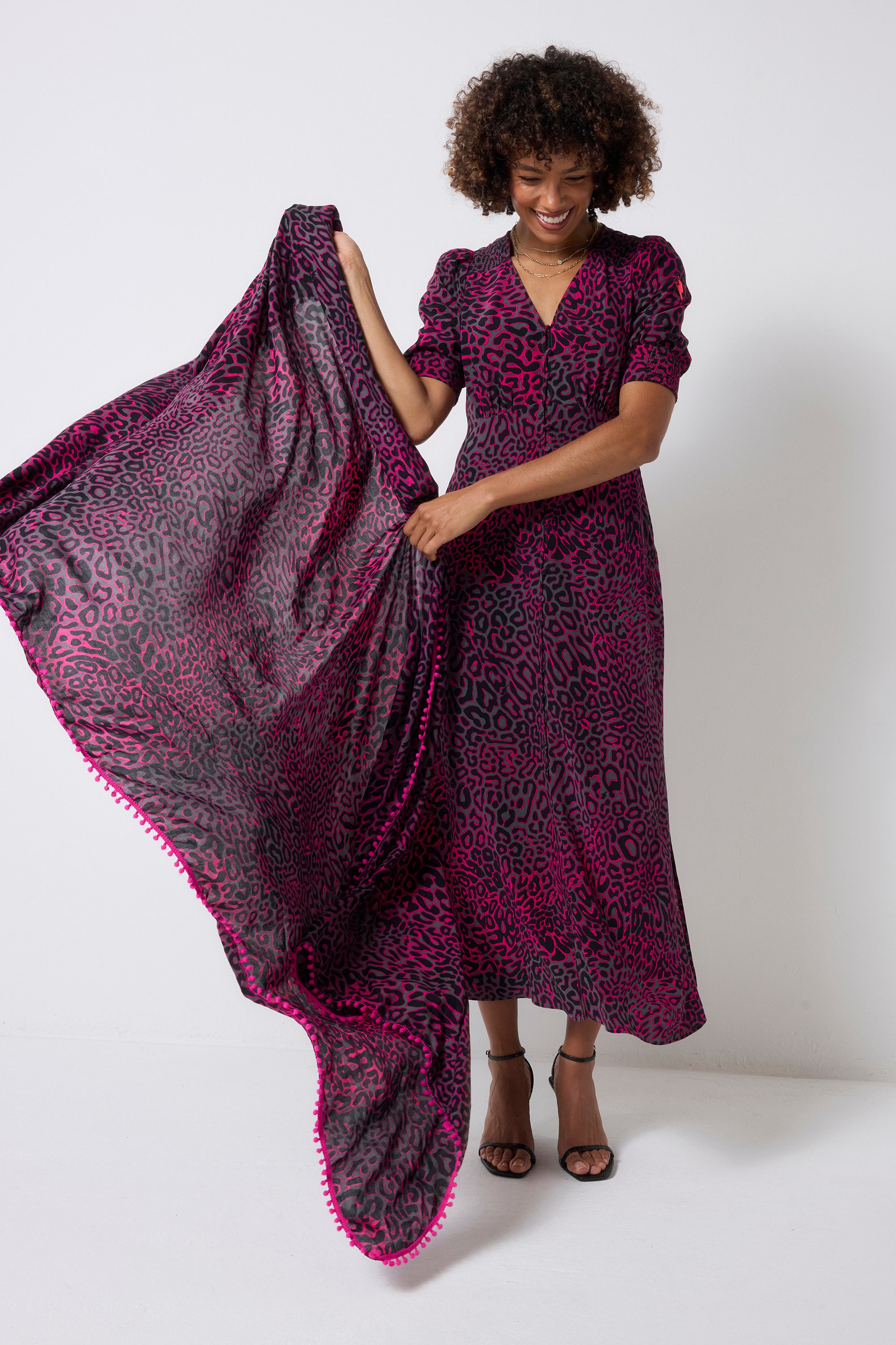 Our bold and brightly coloured grey with pink leopard ray and lightning bolt blouson sleeve midi tea dress is a must have this season. Made in a soft viscose crepe fabric, this versatile midi-length dress features a timeless V-neck. Team it with trainers for an easy everyday look and heels for an effortless evening outfit.
