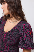 This grey with pink leopard ray and lightning bolt print midi dress is destined to be a favourite in your wardrobe. It's finished with pretty short puff sleeves and a tiered skirt for an added touch of style.