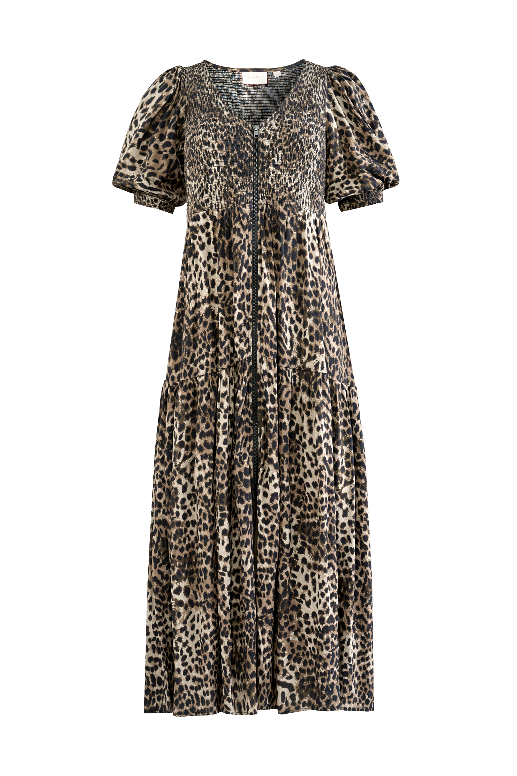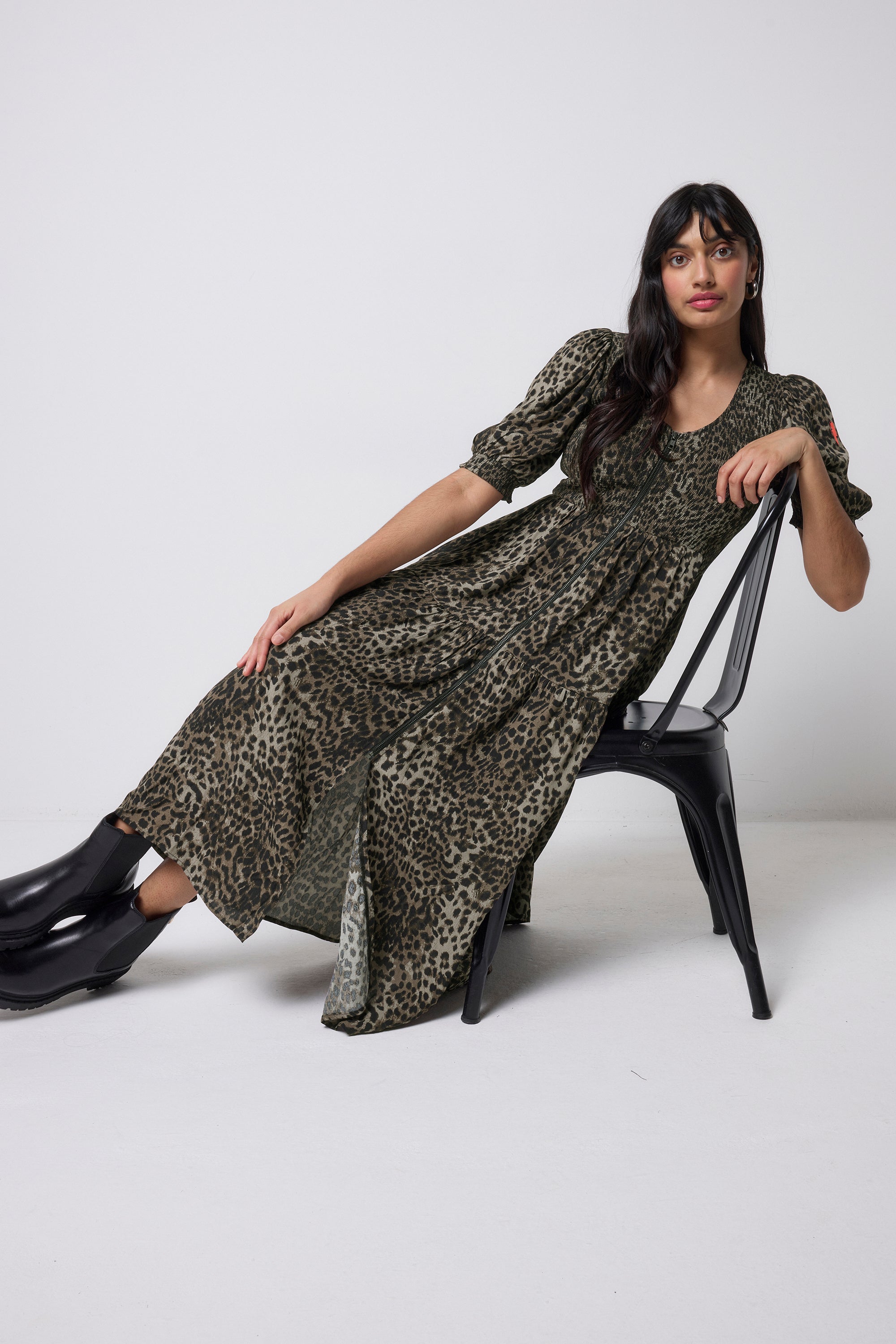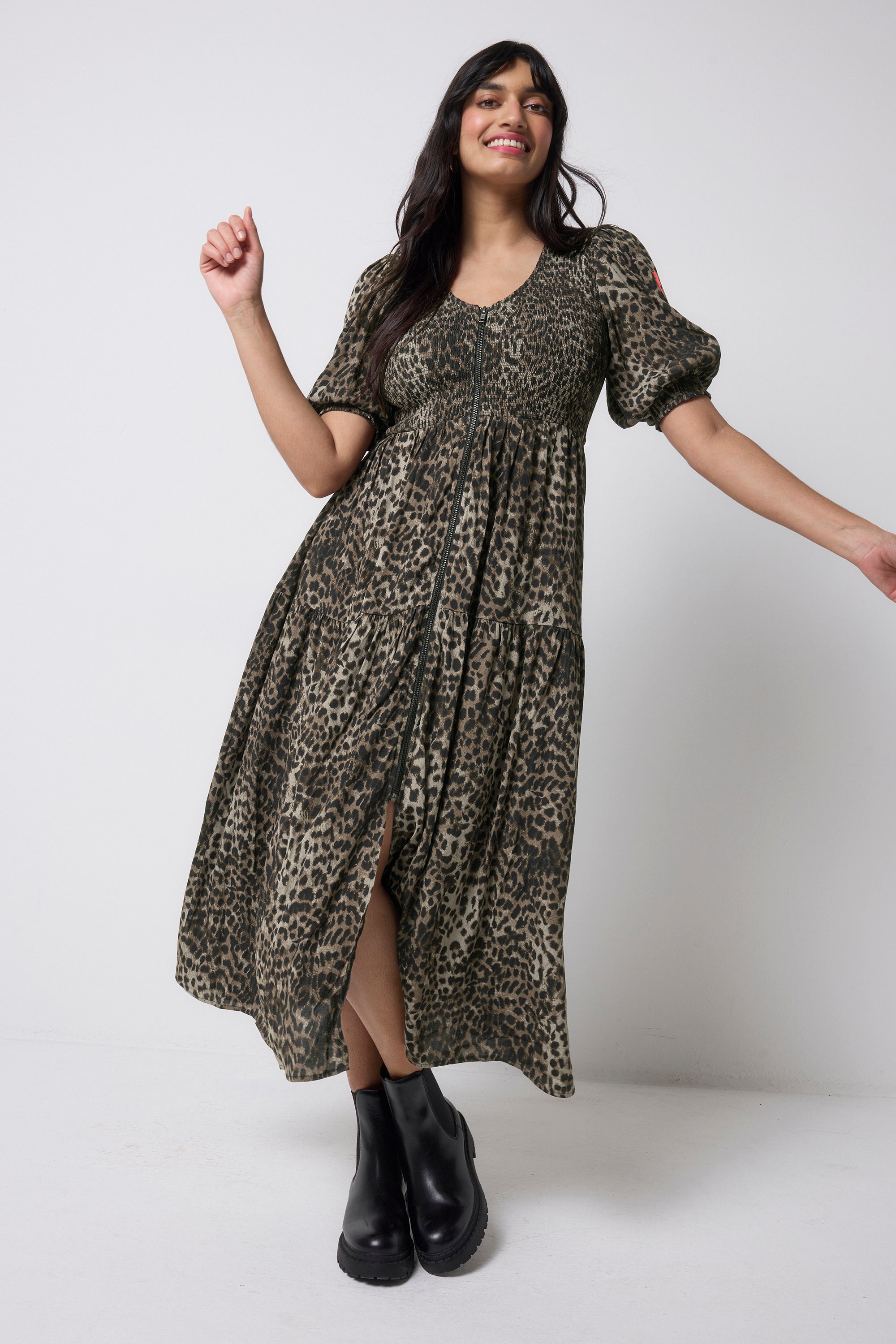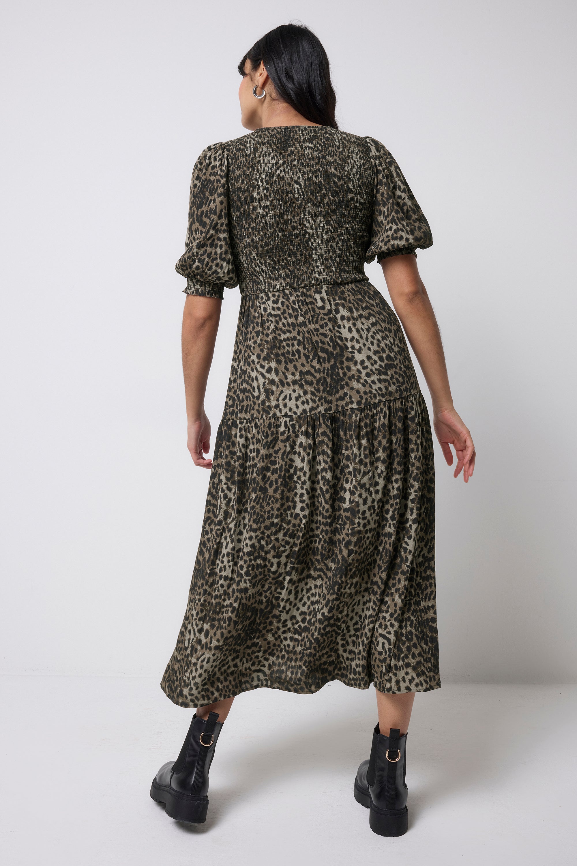 This khaki cheetah and lightning bolt print midi dress is destined to be a favourite in your wardrobe. It's finished with pretty short blouson sleeves and a tiered skirt for an added touch of style.