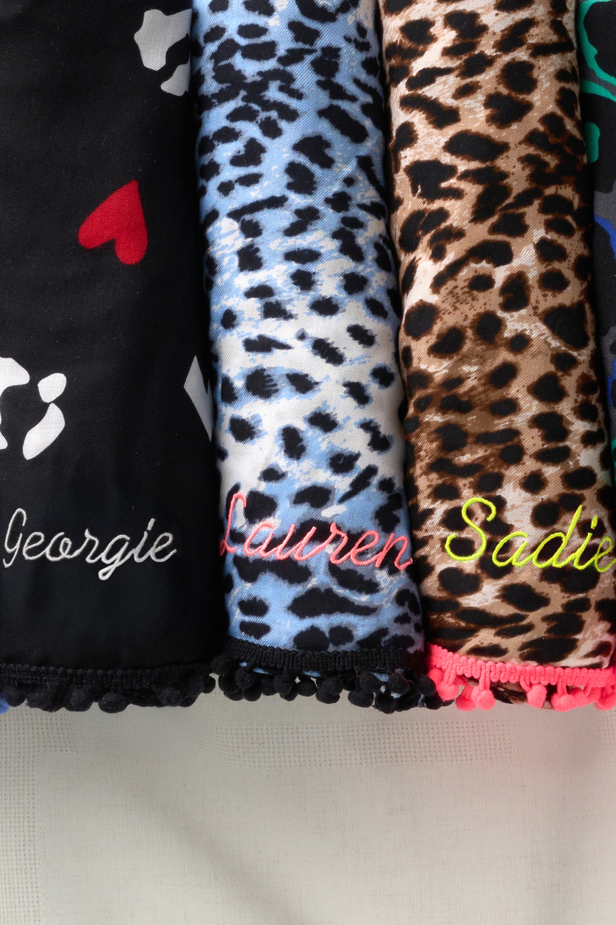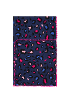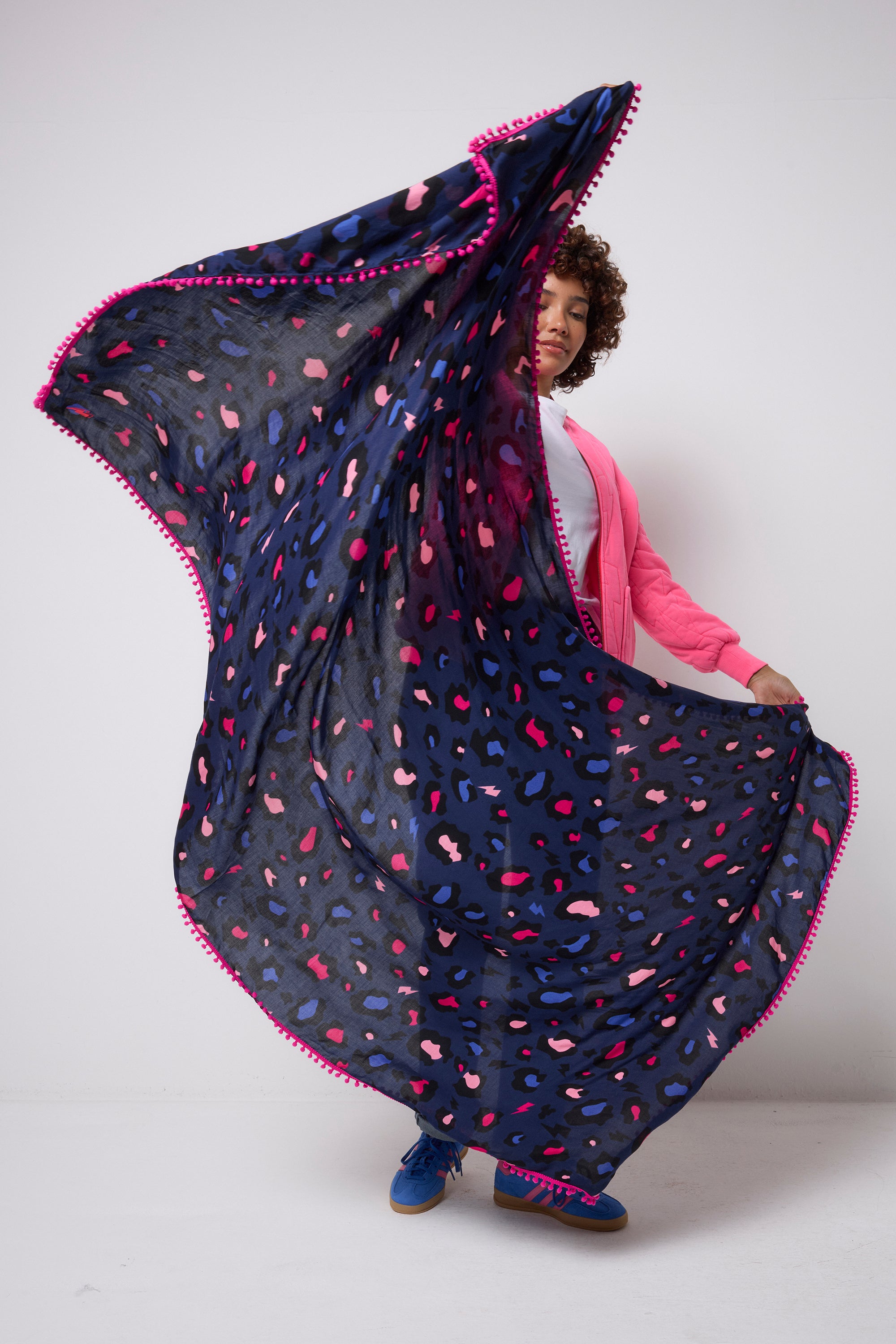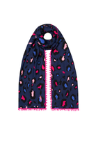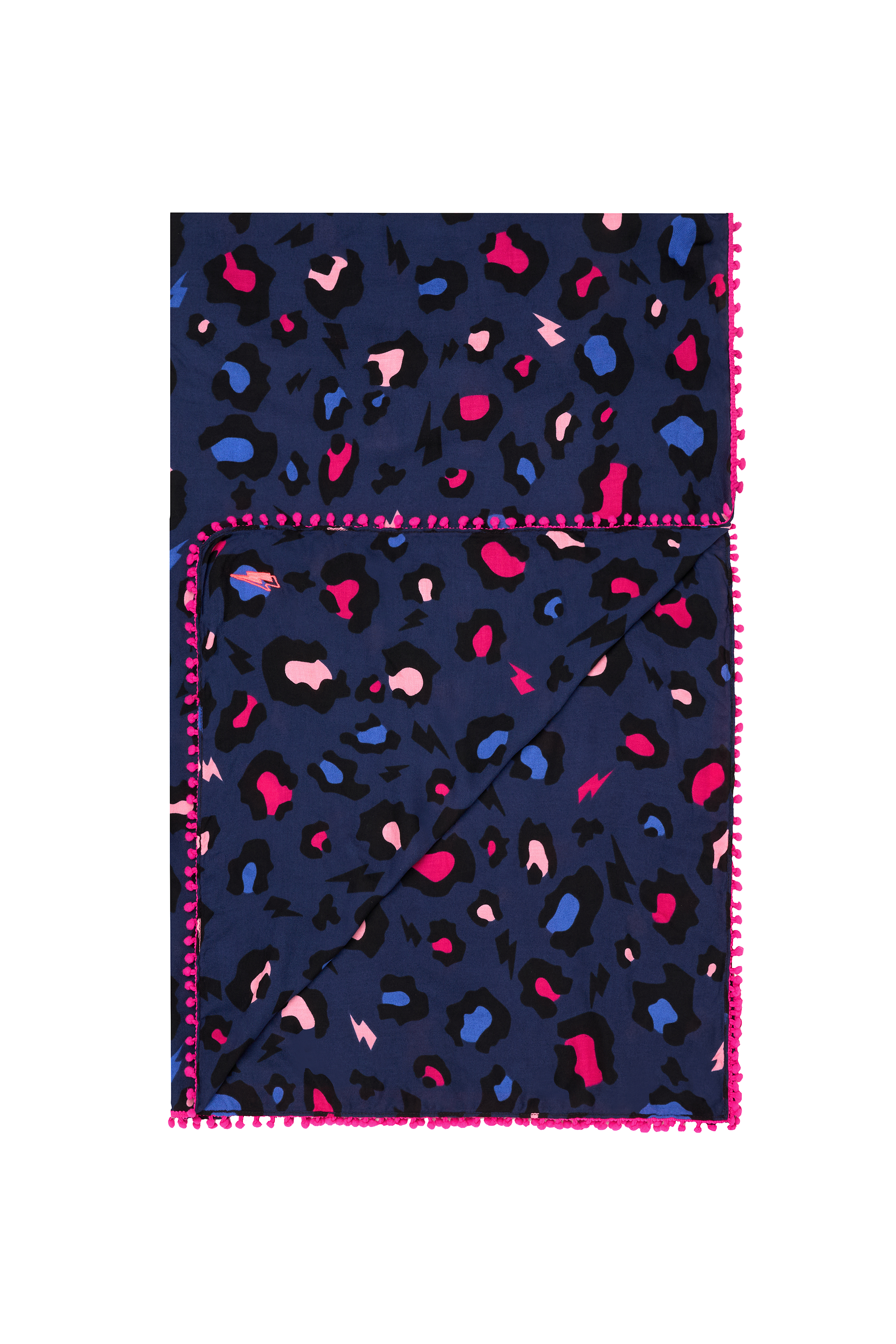 A super-soft, superpower-infused scarf in our navy with pink snow leopard and lightning bolt print. Featuring a pink pom pom trim and neon pink embroidered lightning bolt Superpower Button.