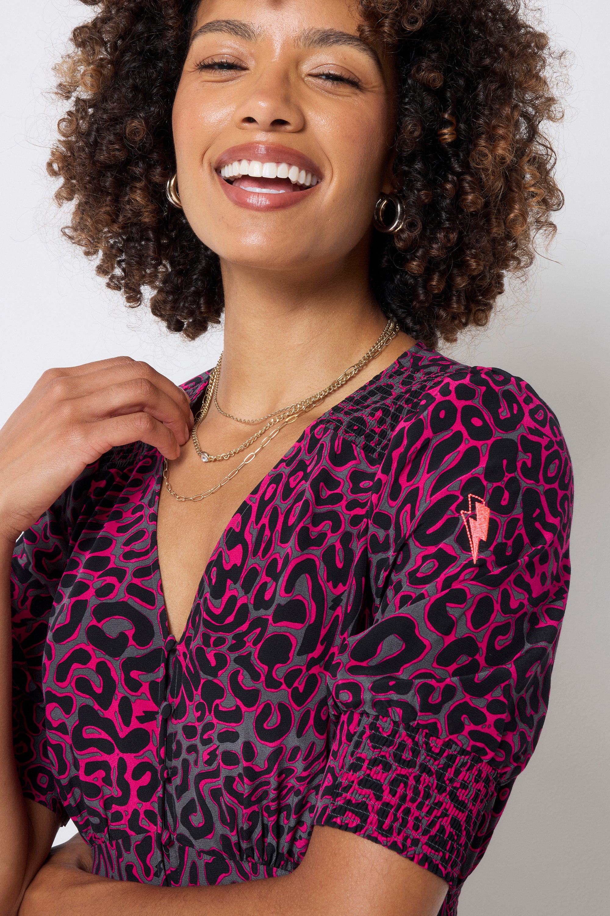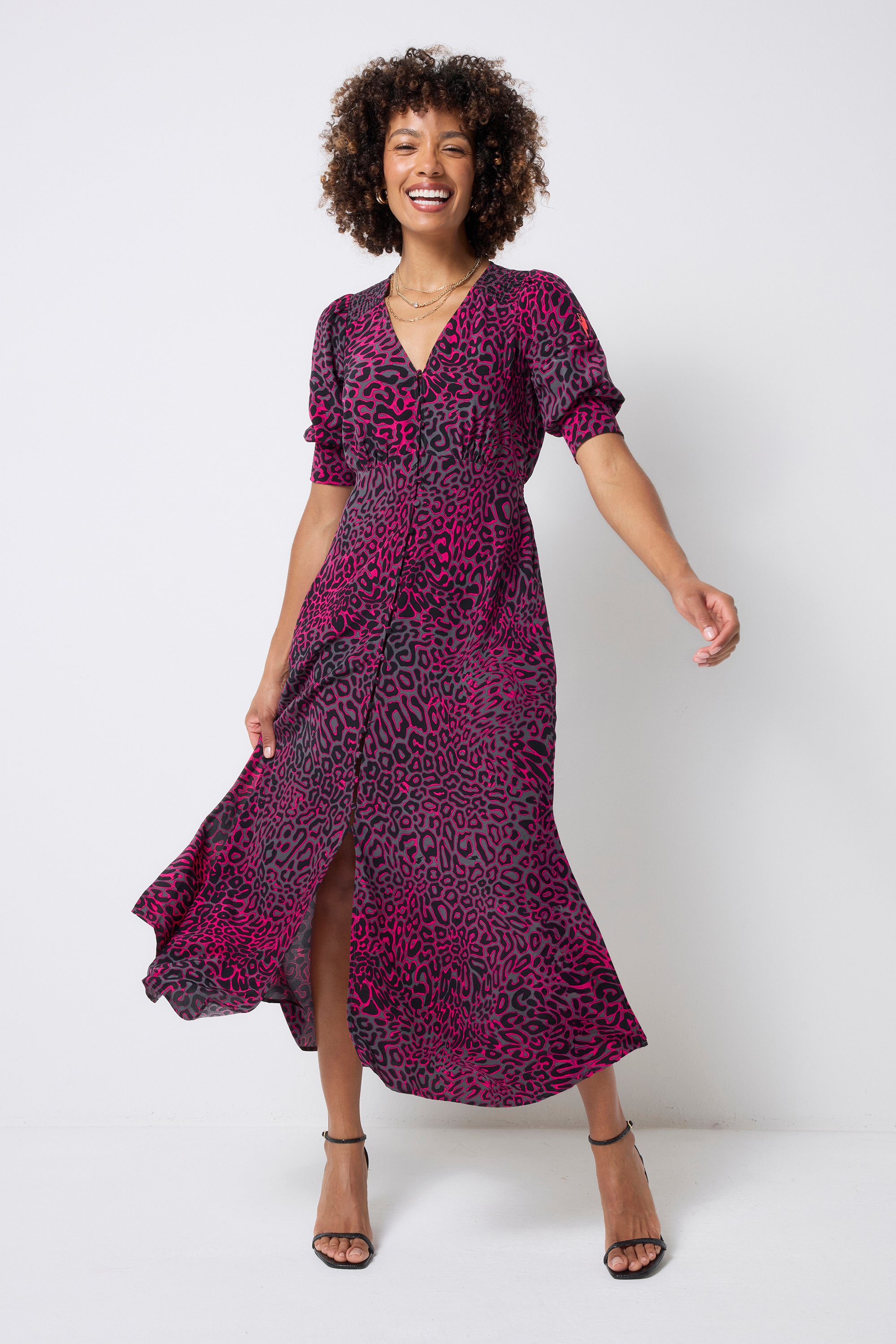 Our bold and brightly coloured grey with pink leopard ray and lightning bolt blouson sleeve midi tea dress is a must have this season. Made in a soft viscose crepe fabric, this versatile midi-length dress features a timeless V-neck. Team it with trainers for an easy everyday look and heels for an effortless evening outfit.