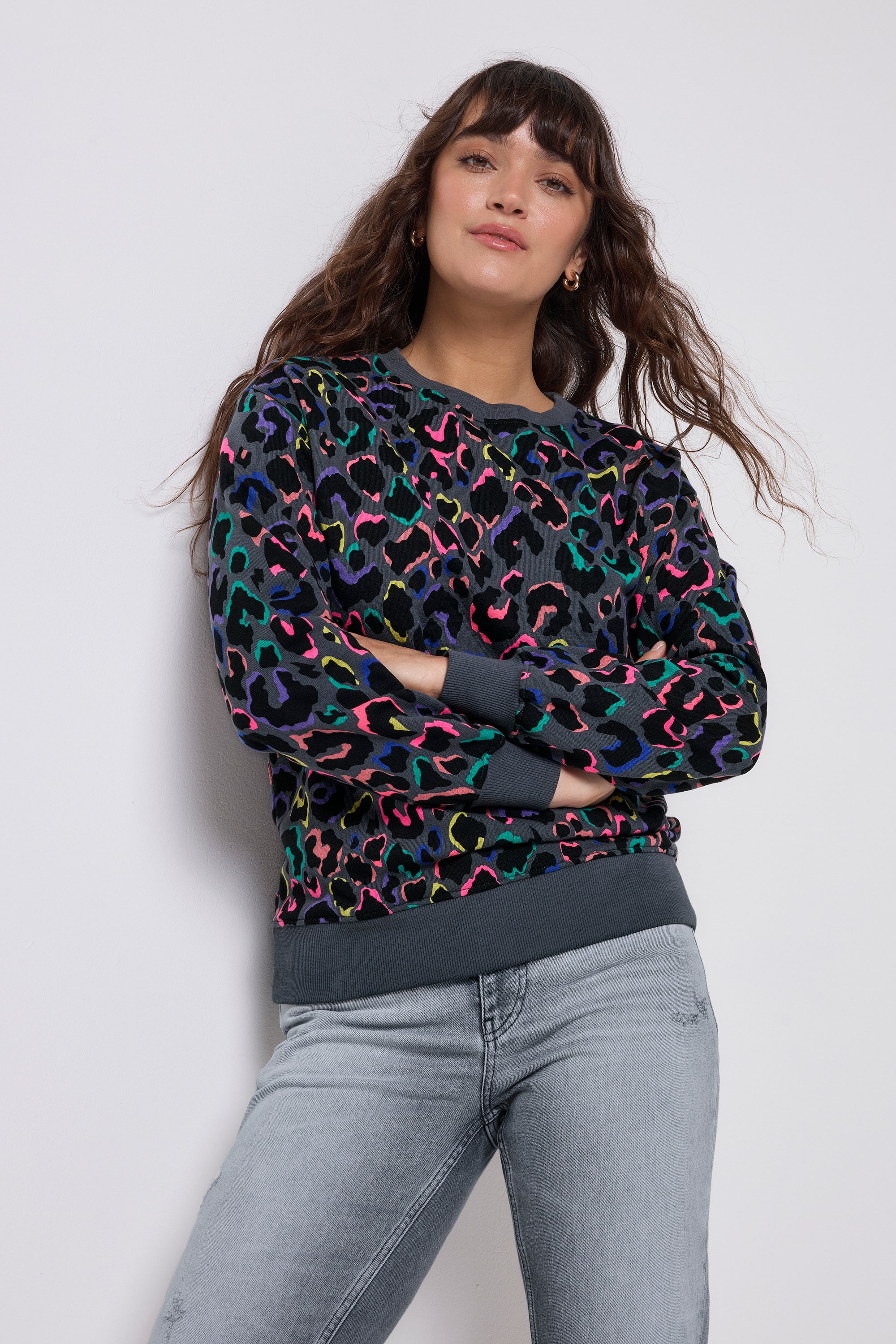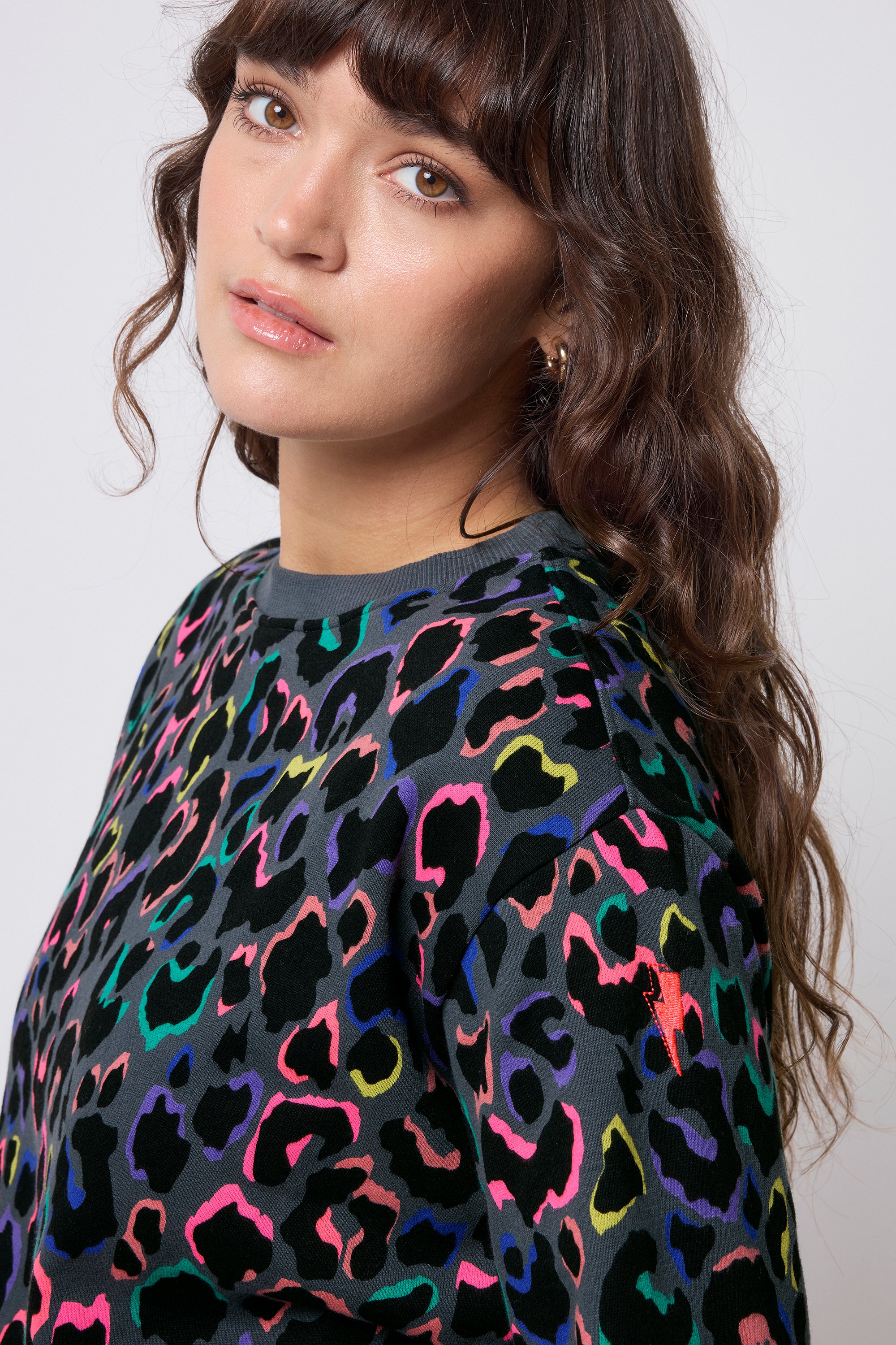 Amp up your casual collection with this grey with rainbow shadow leopard and lightning bolt print oversized sweatshirt. It's oversized fit makes it easy to layer, while dropped shoulder seams add to the relaxed feel. The eye-catching design is bound to draw attention wherever you go.