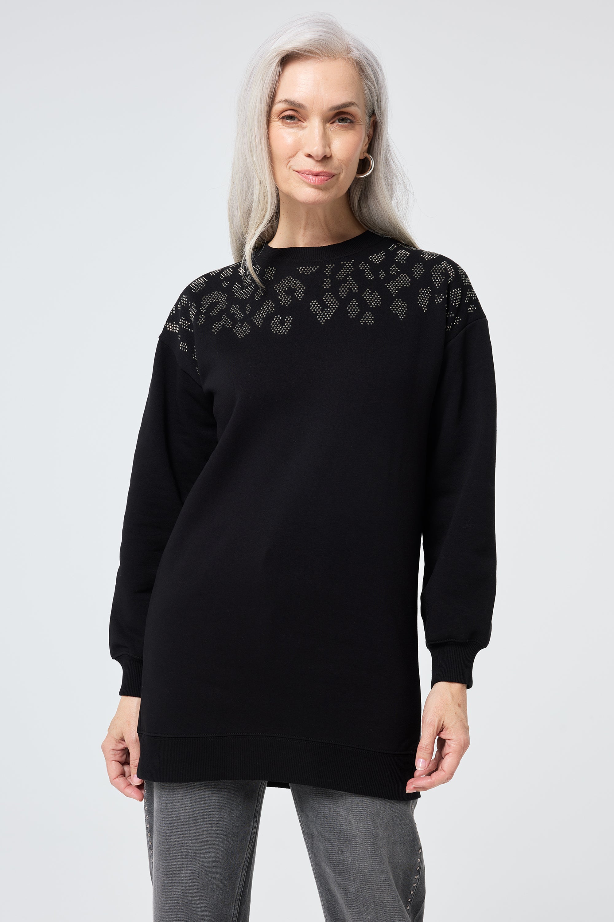 Make some room in your wardrobe for this must-have black with studded leopard oversized tunic. It's the perfect throw on and go style and pairs perfectly with jeans for a stylish and cosy look.