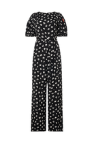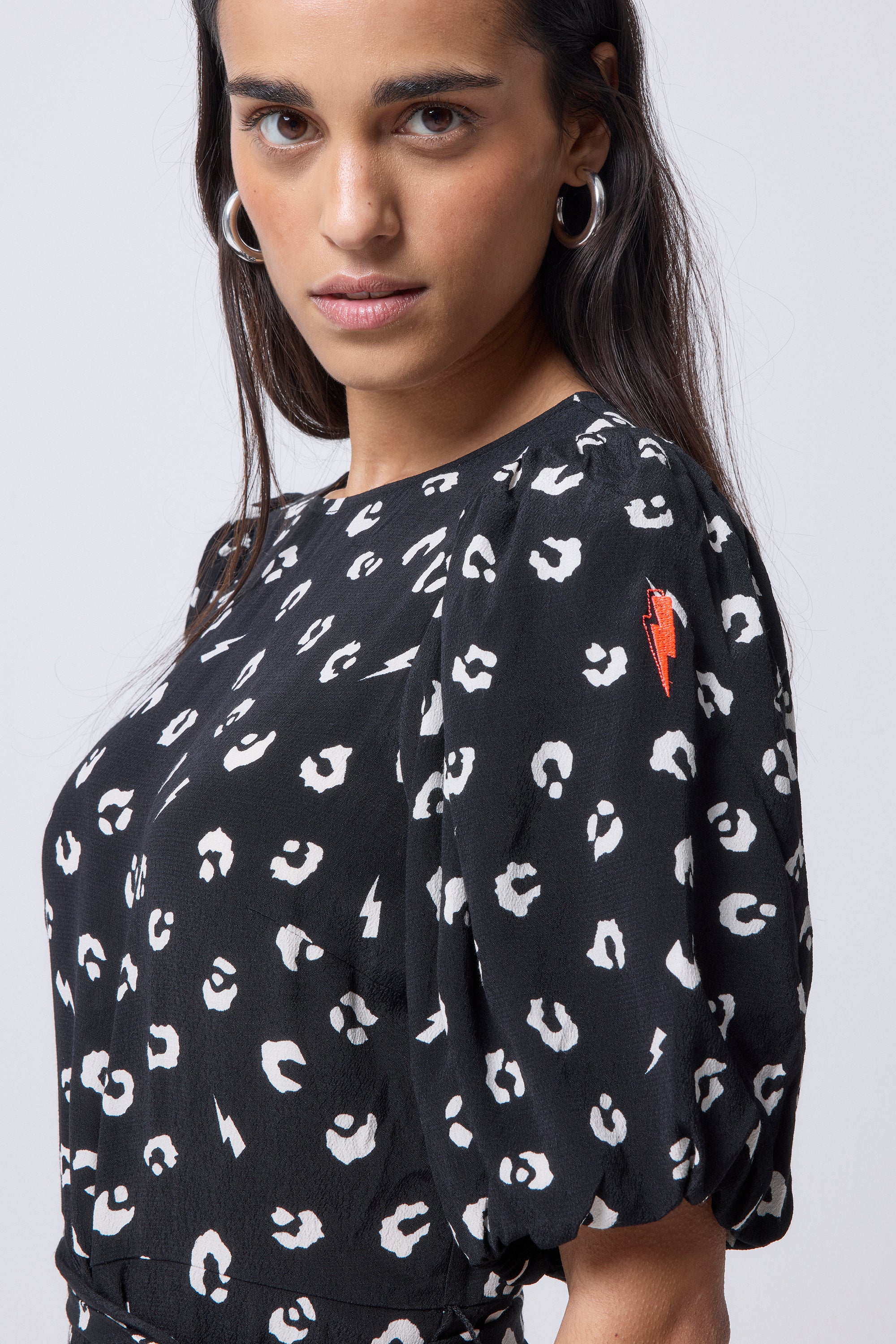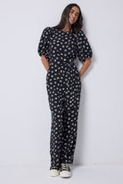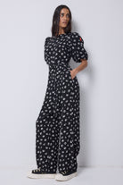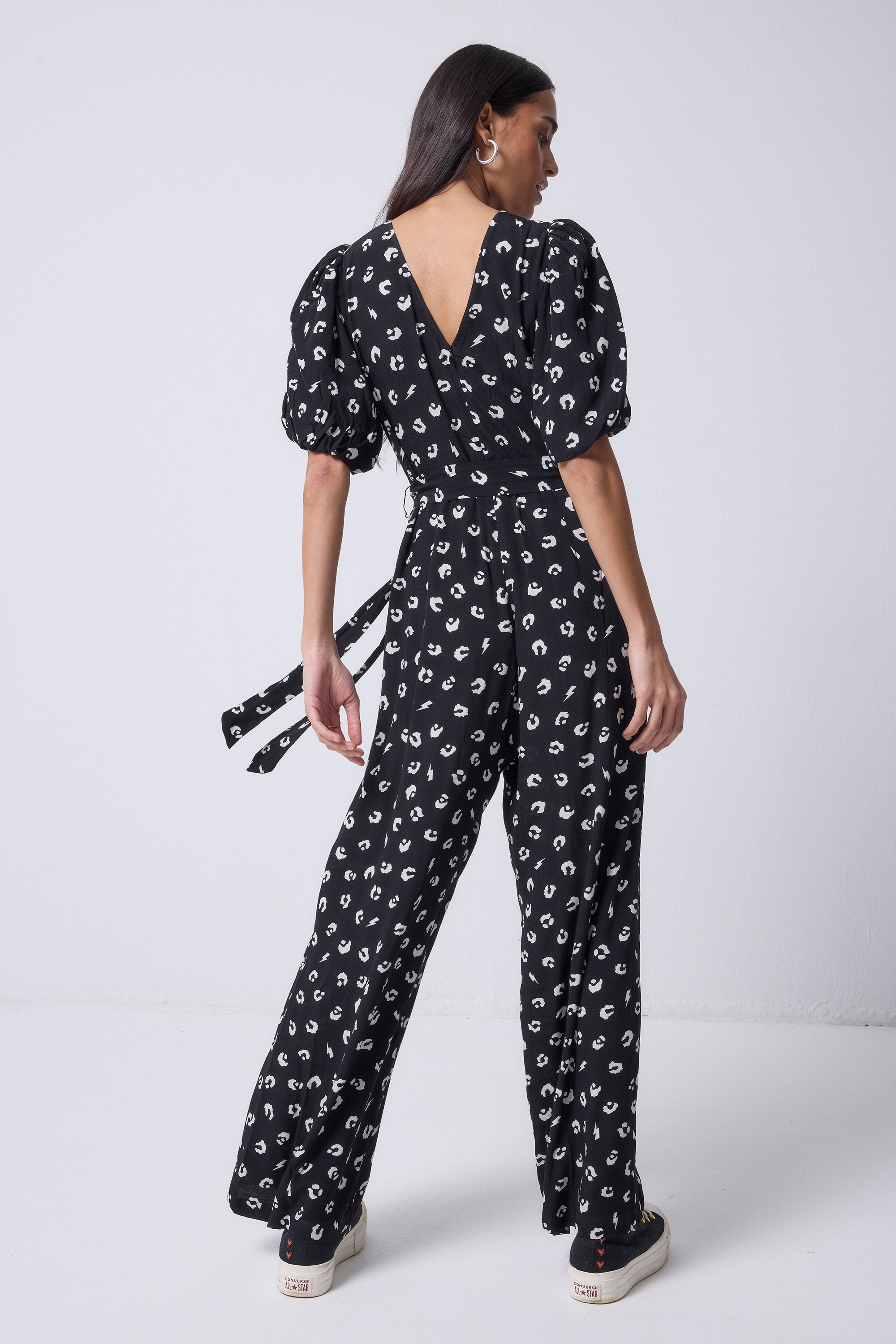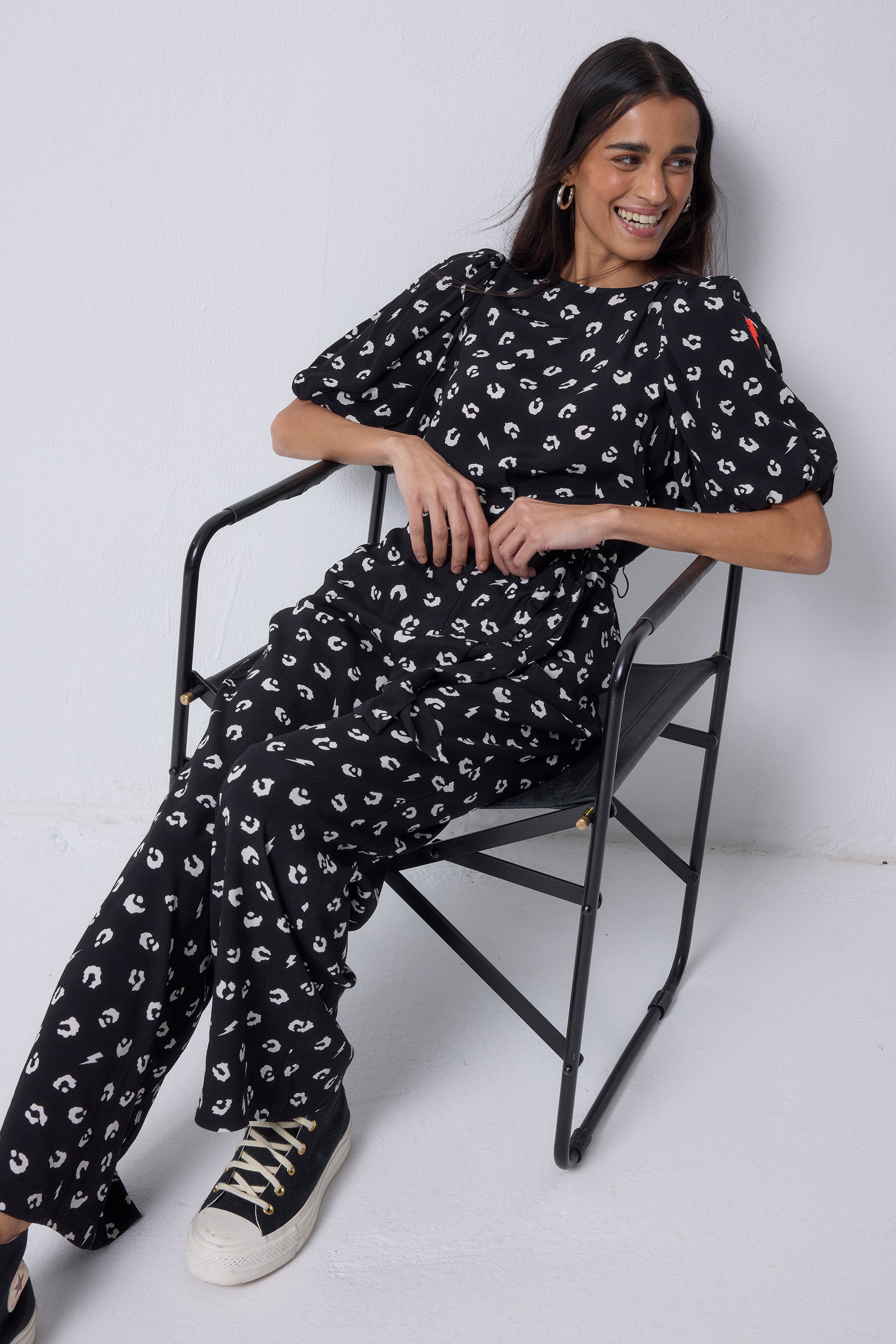 Black with White Love Leopard Puff Sleeve Wide Leg Jumpsuit