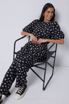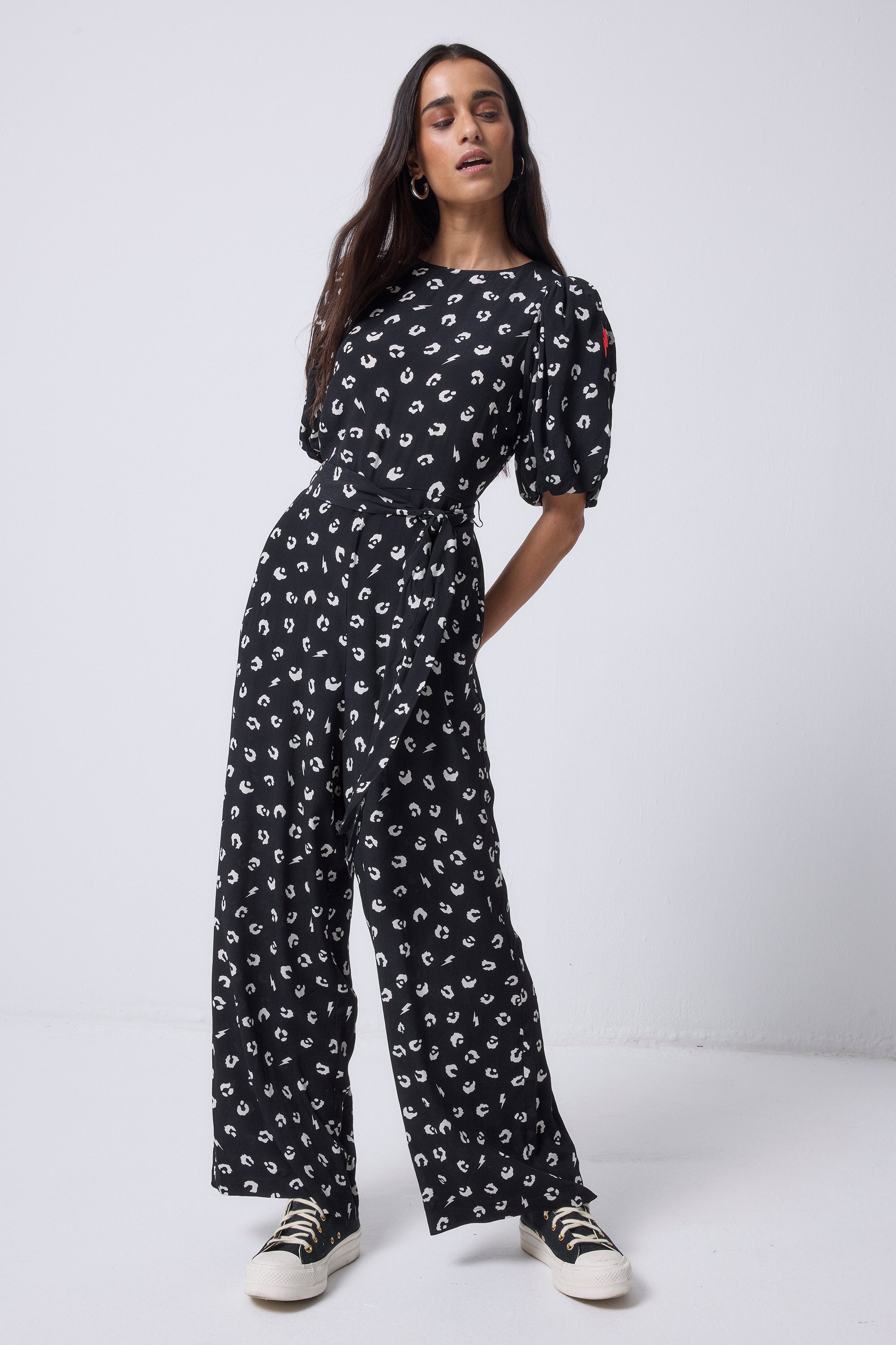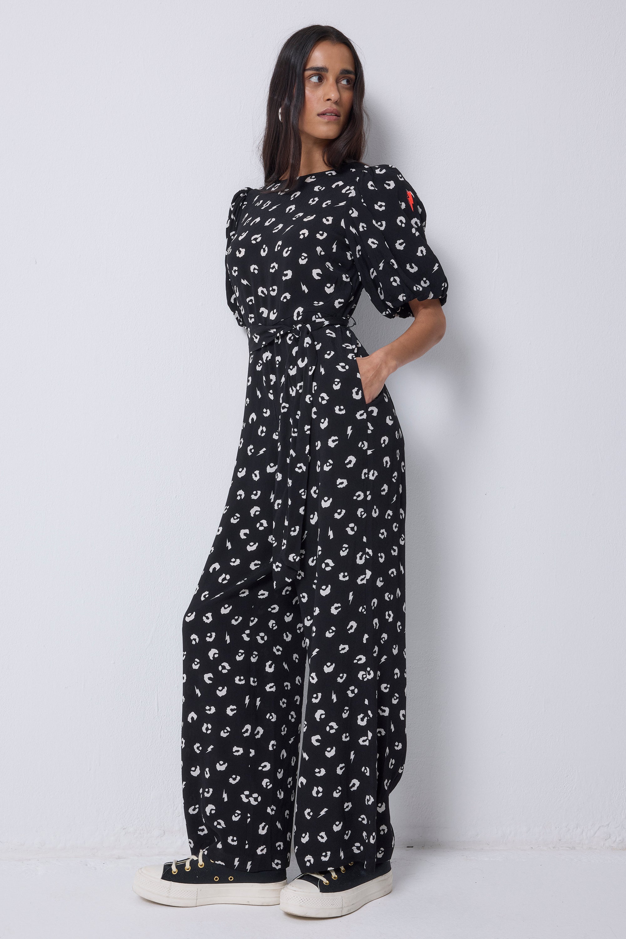 Minimum effort, maximum impact. Take all the drama out of getting dressed with our black with white love leopard jumpsuit. Featuring a seriously flattering round neck, zip up back and super-comfortable wide legs.