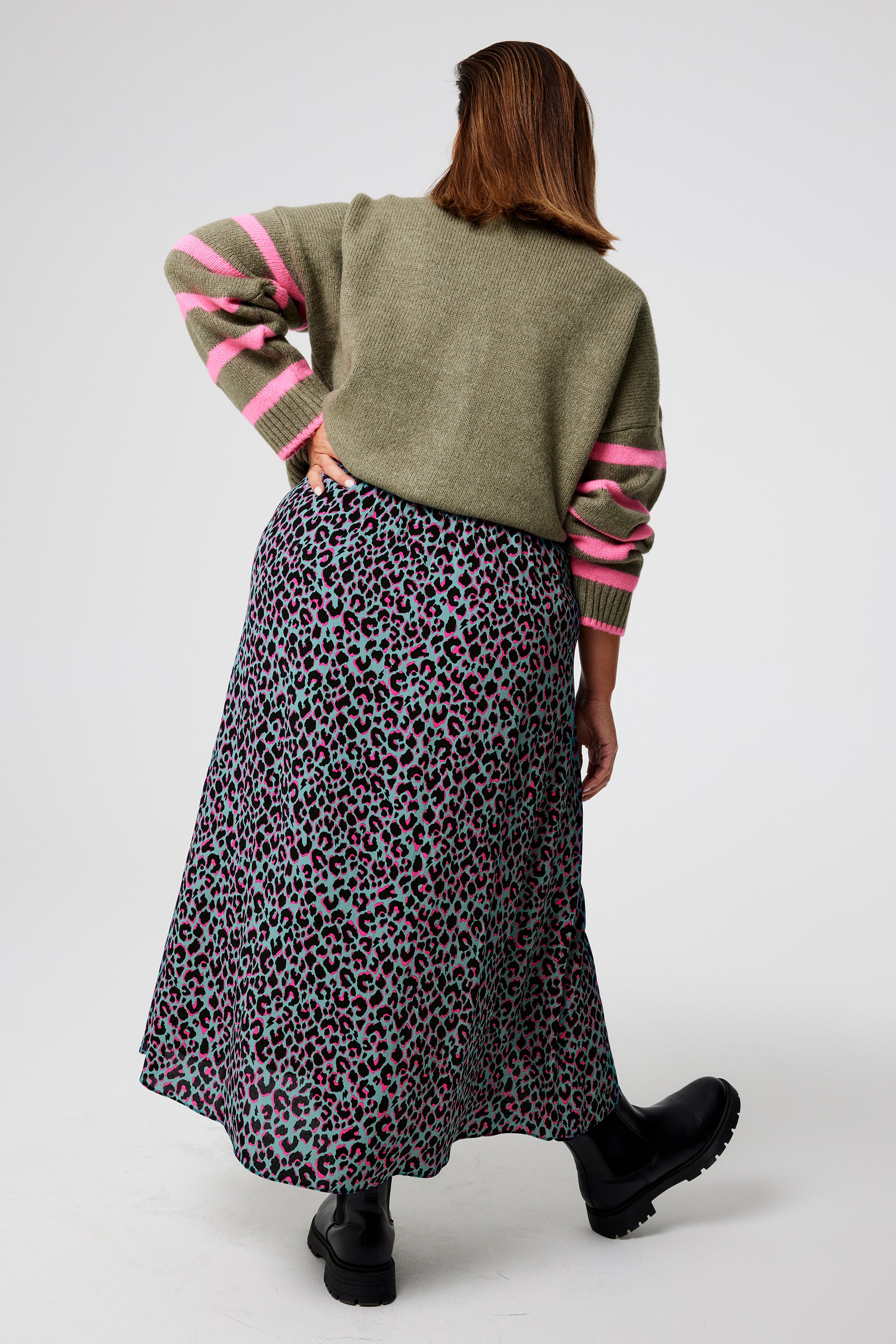 Our khaki with pink and black small shadow leopard and lightning bolt print split front skirt is a statement making pick that can be amped up for special occasions or pared back with a chunky knit and boots. It's designed with an elasticated waist on the back for easy comfort.