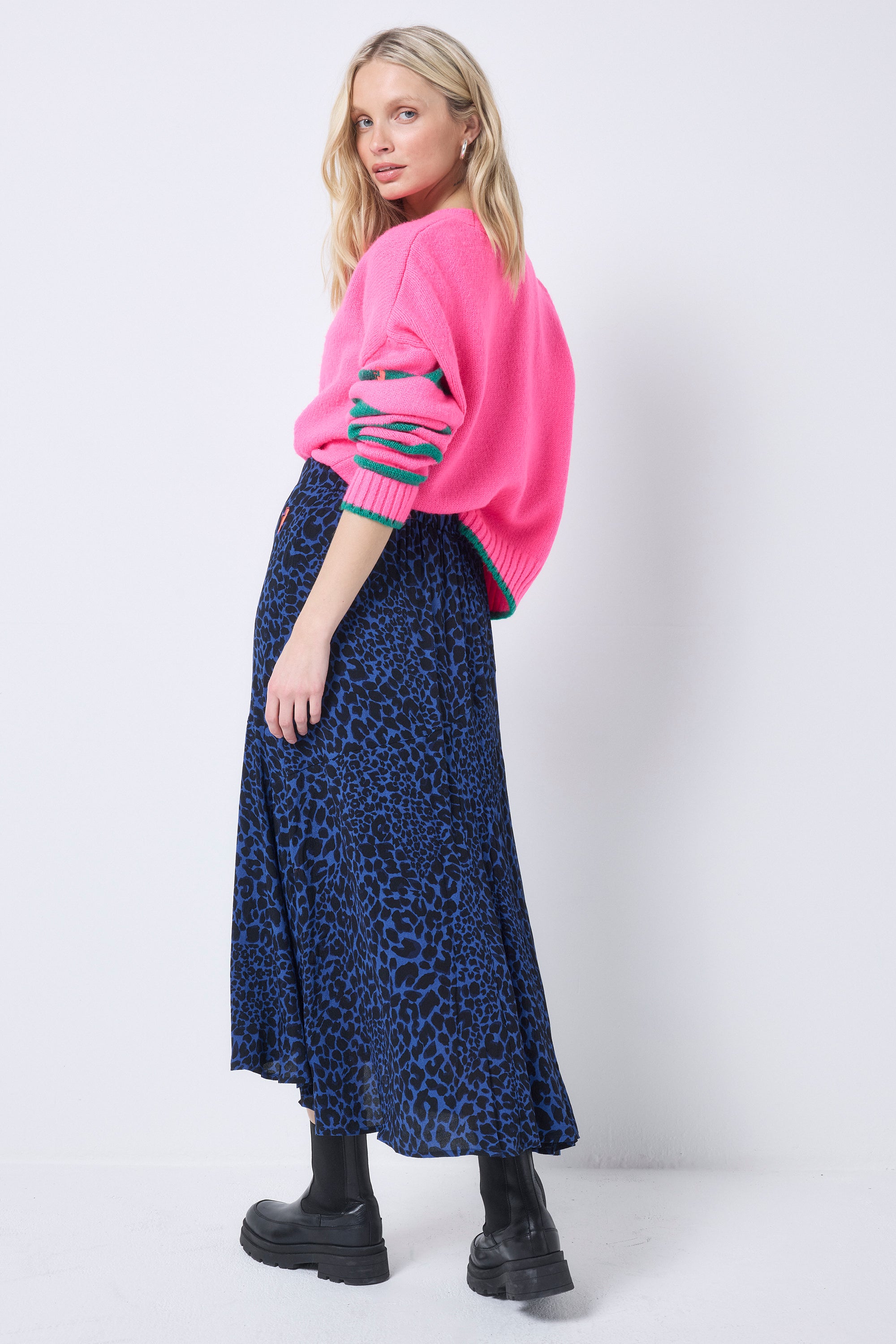 Spruce up your skirts collection with this navy with black rock and roll leopard high low hem skirt, it's a statement making print that can be dressed up or down. It's made from soft viscose crepe and designed with an elasticated waist on the back for easy comfort.