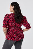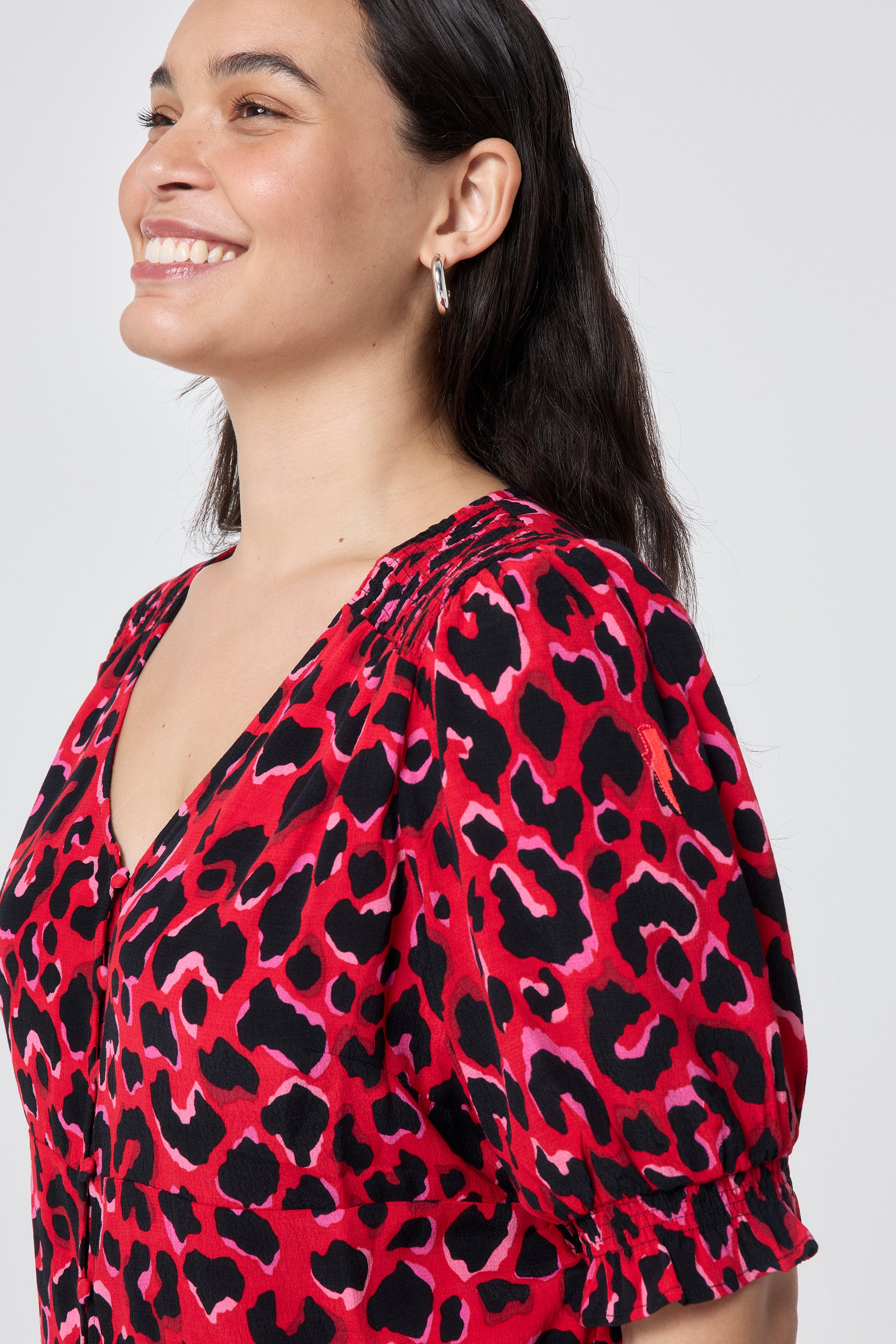 Red with Pink and Black Pop Leopard Button Through Blouse