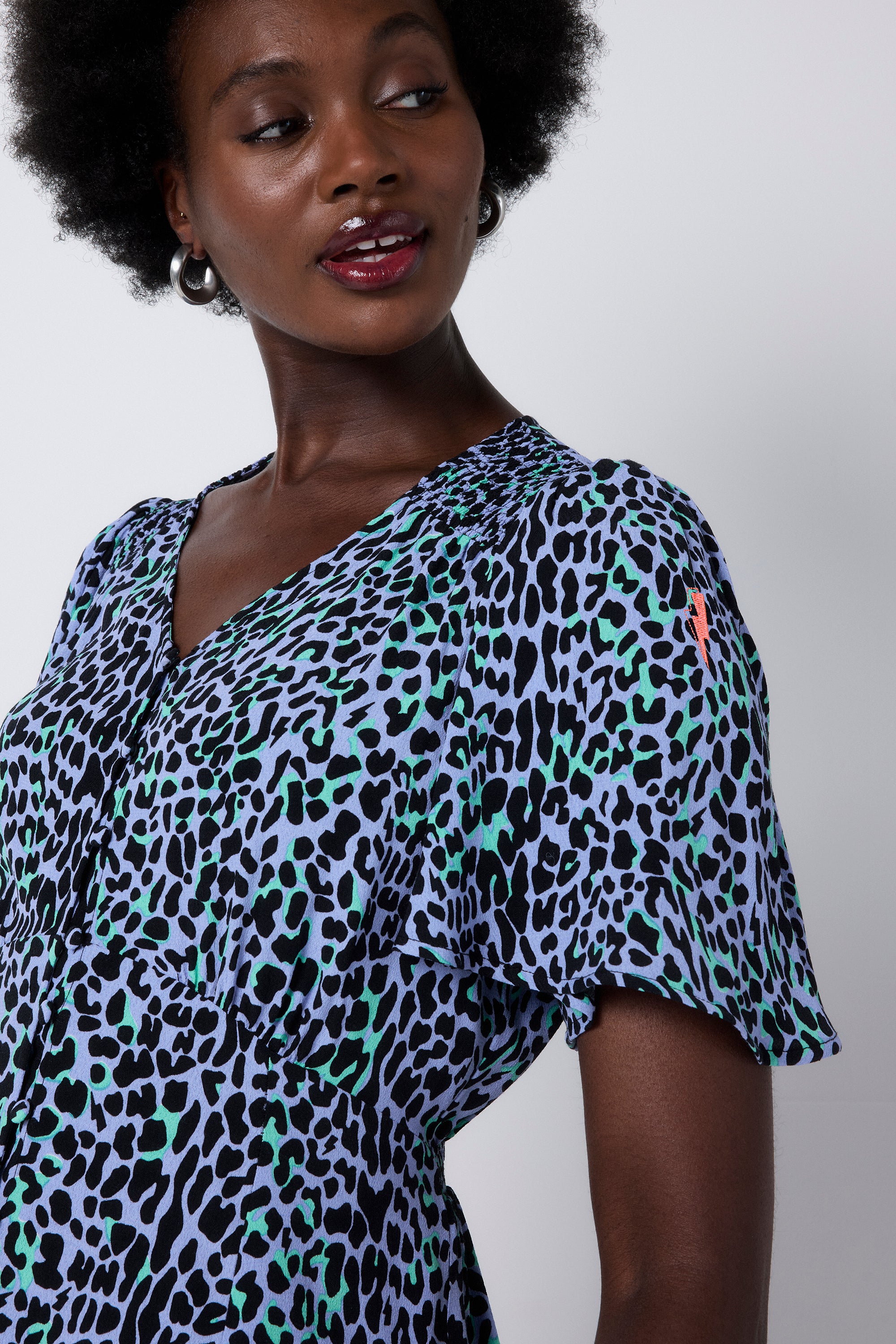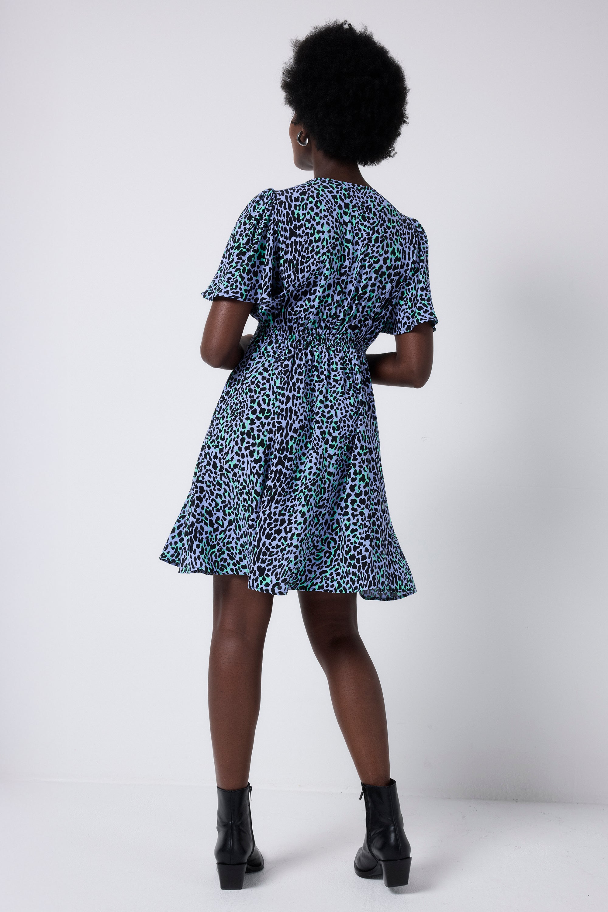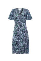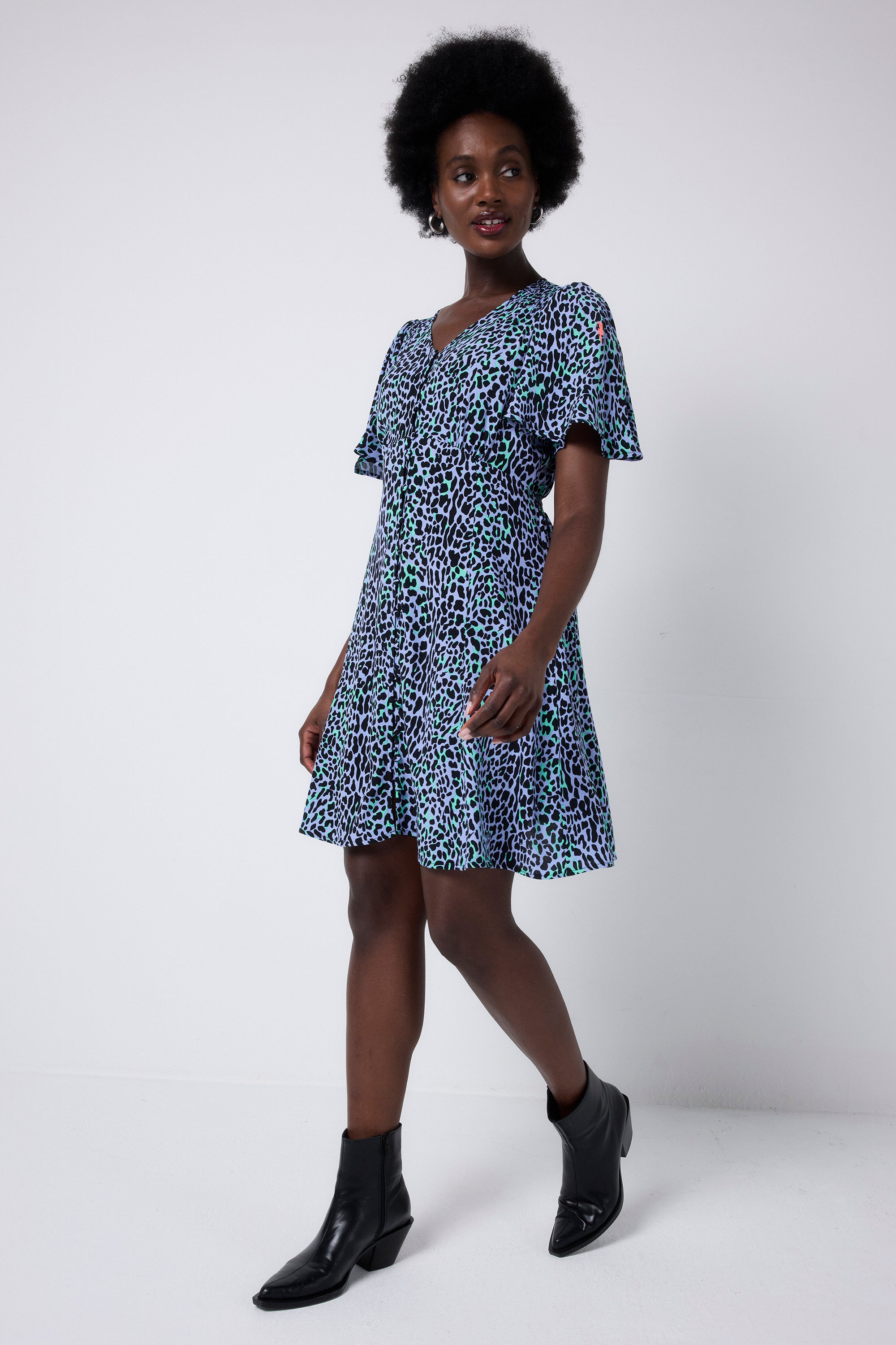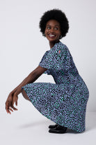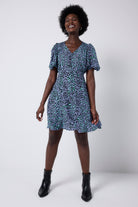 Feel confident in our blue with black leopard and lightning bolt button through short tea dress. Made in a soft viscose crepe fabric, this versatile short-length dress features a timeless V-neck and short angel sleeves.