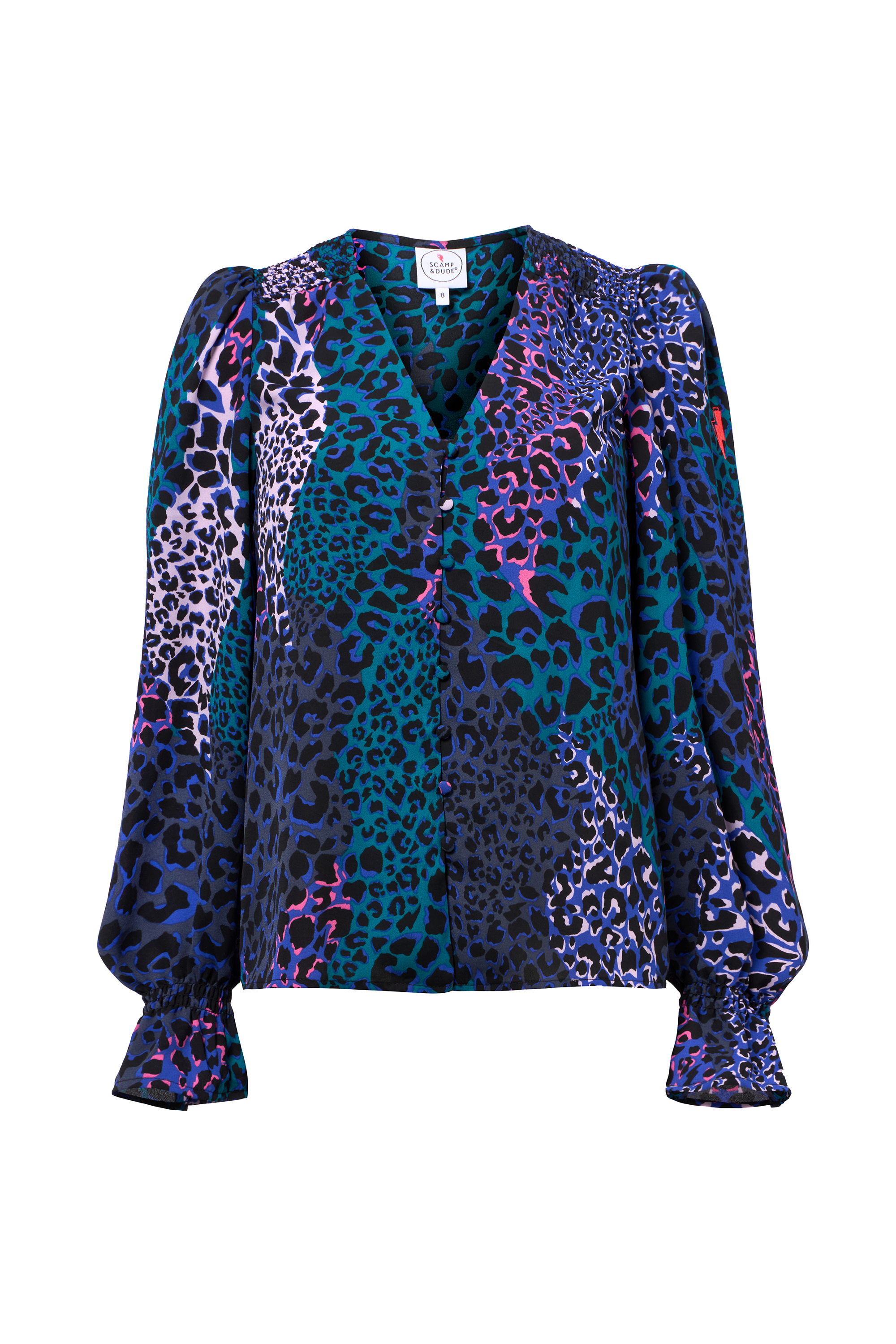 Flattering and feminine, our blue with green spliced leopard and lightning bolt print flute sleeve blouse looks great styled with your favourite Scamp & Dude denim. It's made from recycled polyester which makes the blouse incredibly soft and comfortable, perfect for all-day wear.