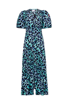 Turquoise with Black and Blue Shadow Leopard Puff Sleeve Midi Tea Dress