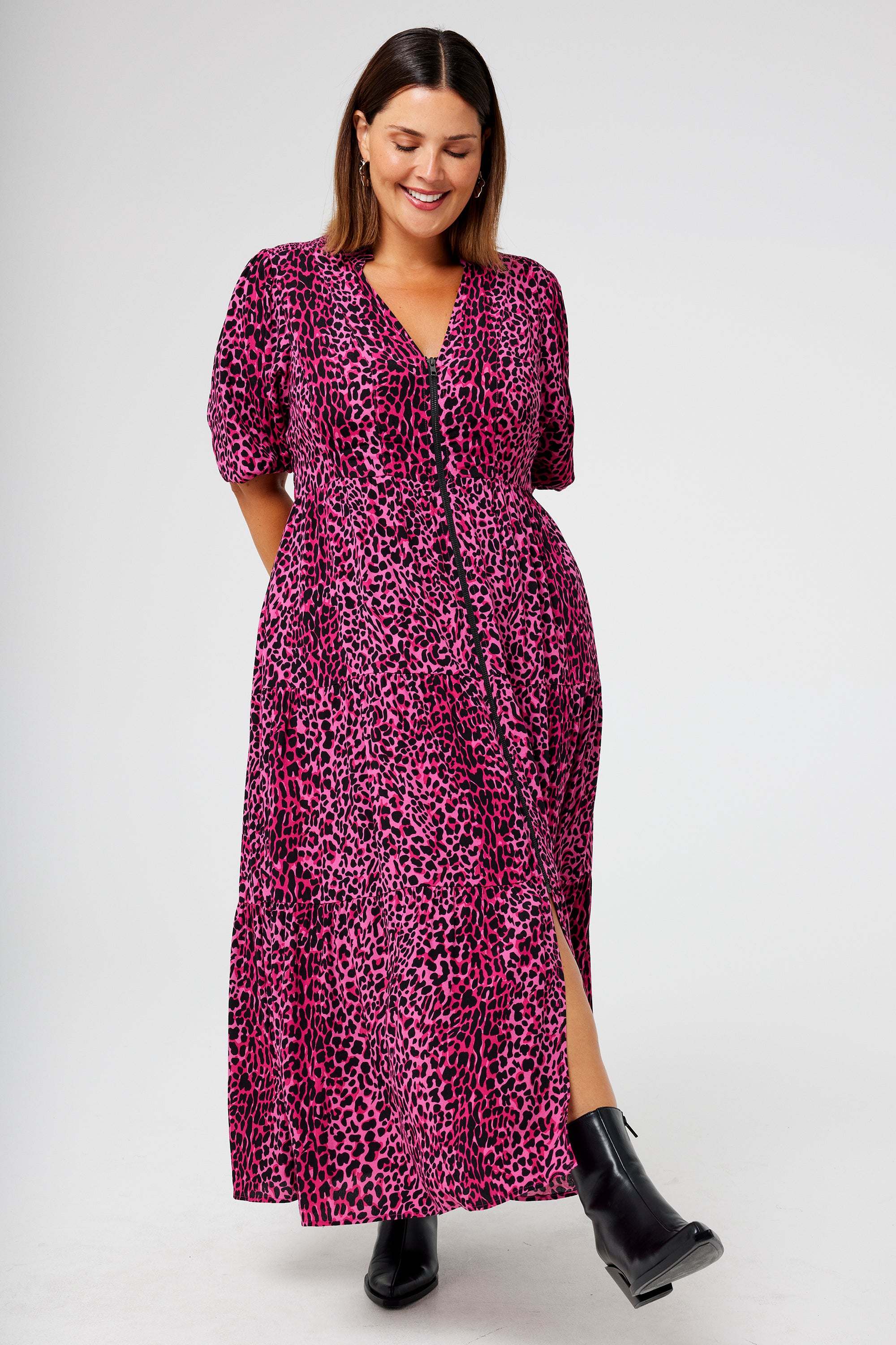 Pink with Black Wild Leopard Zip Detail Tiered Midi Dress