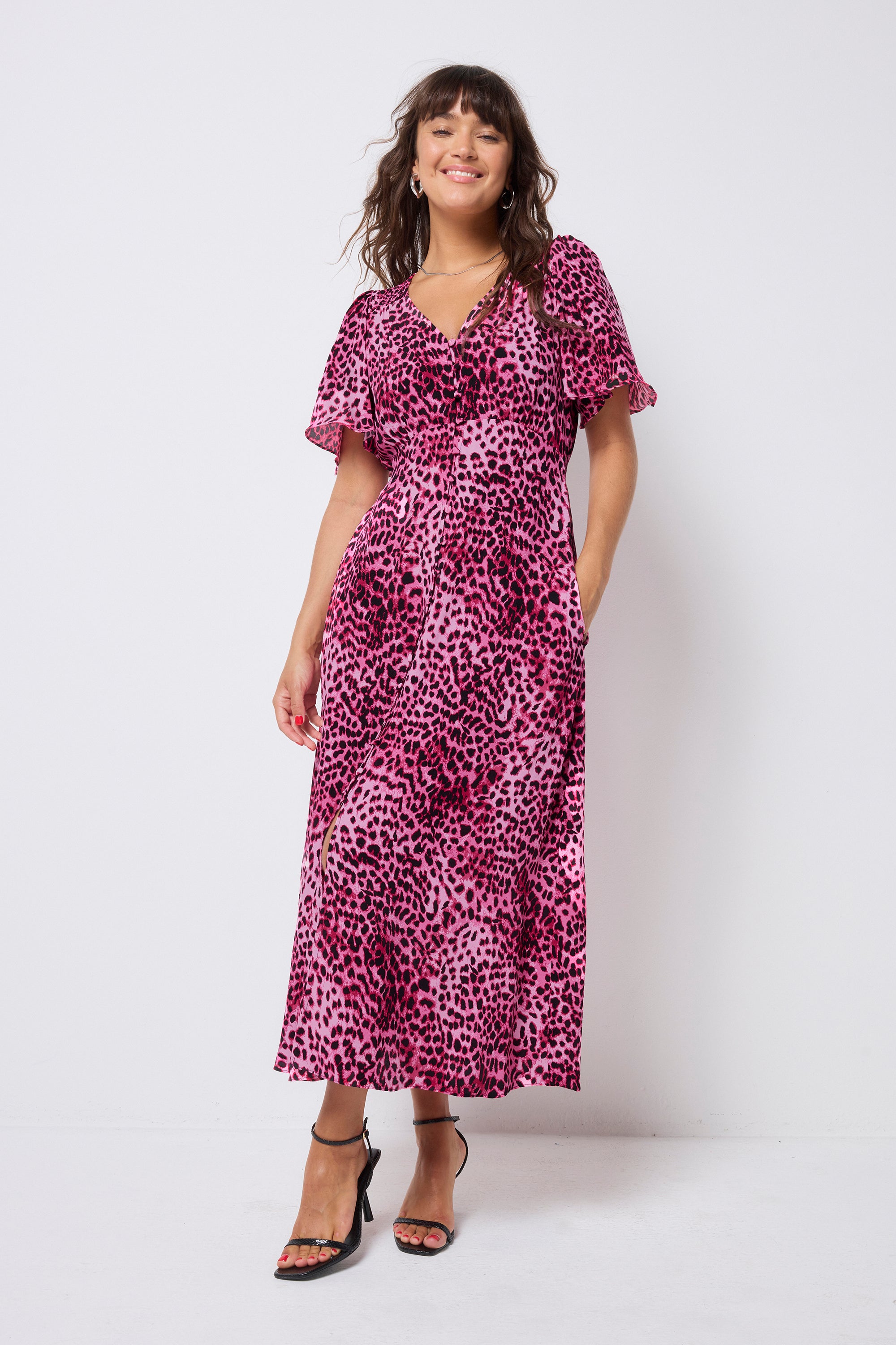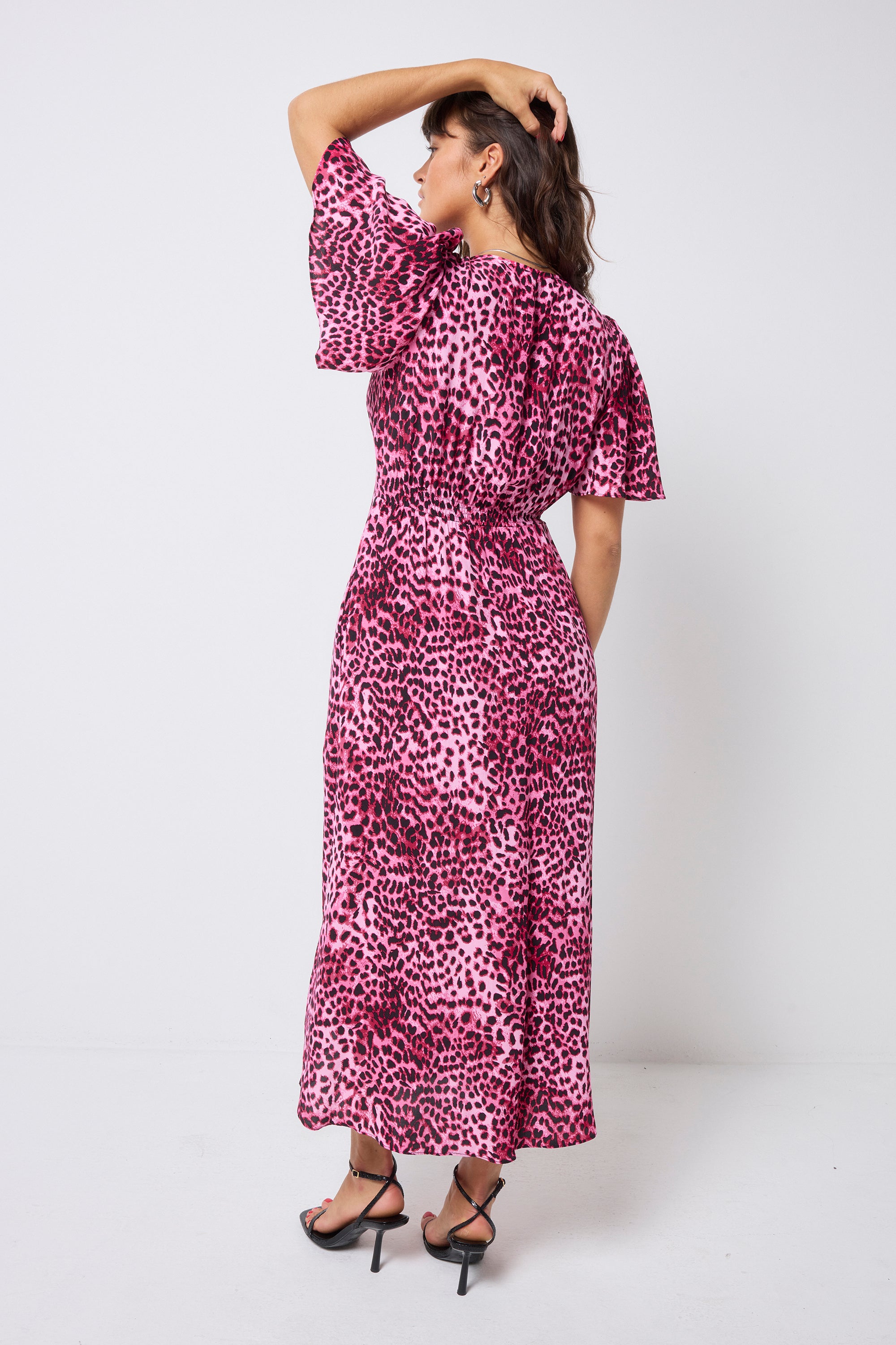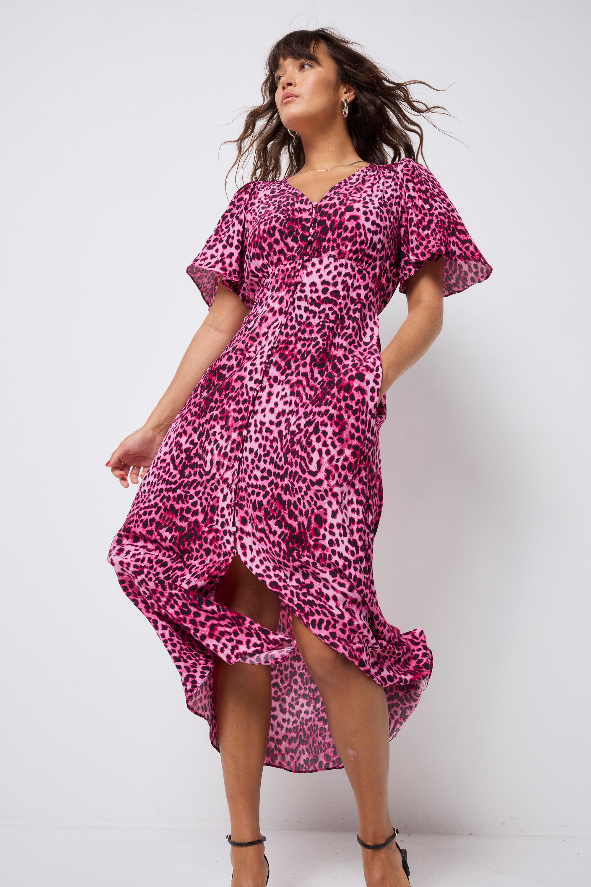 Print: Bright Pink with Black Cheetah Angel Sleeve Midi Tea Dress