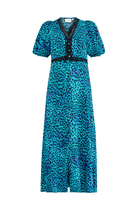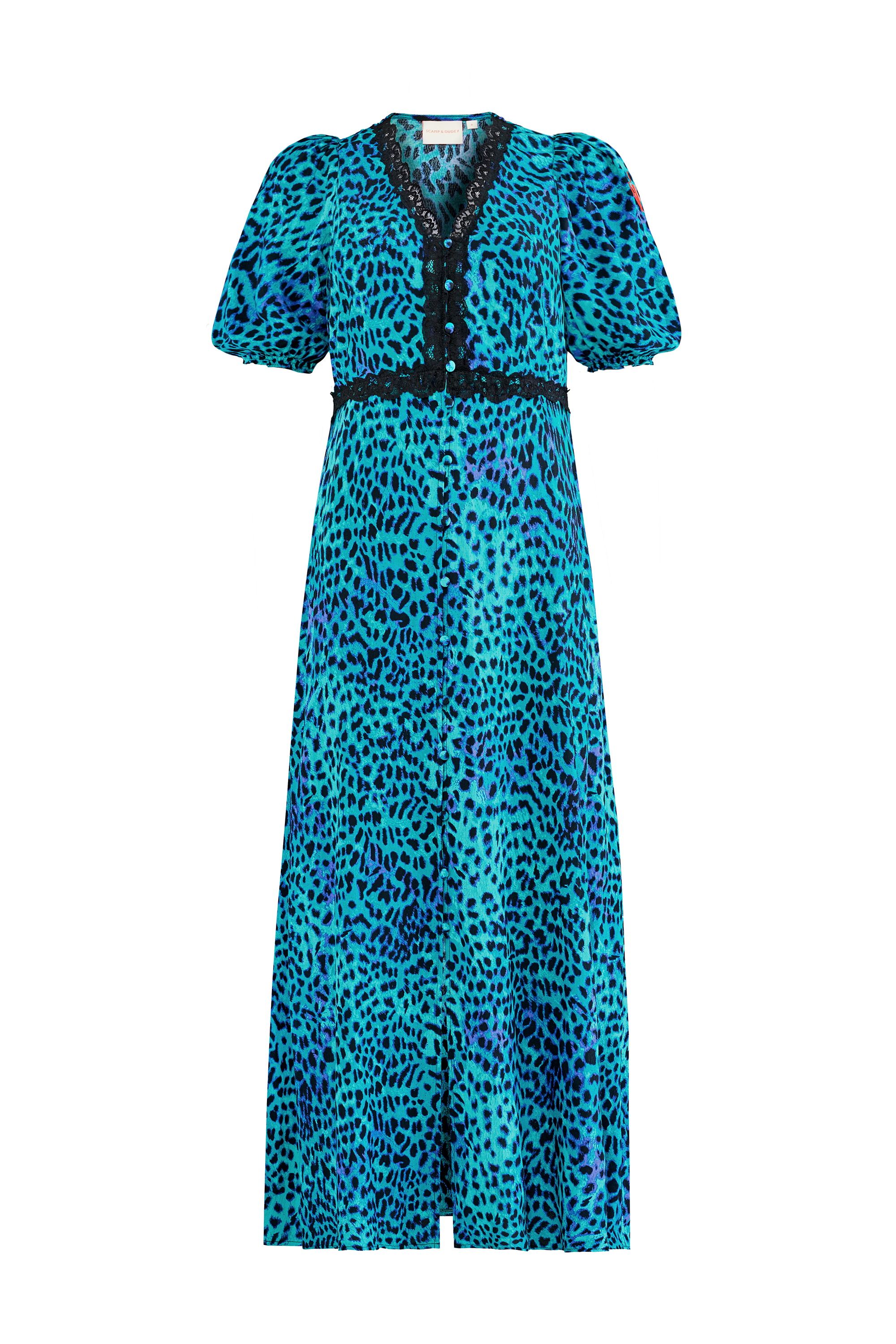Bold and beautiful, this turquoise cheetah with lace trim dress will make a joyful addition to your wardrobe. Featuring a universally flattering V-neck, short puff sleeves and a classic midi length, style yours with trainers for the day and heeled boots for evening plans.