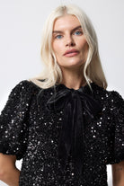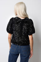 Black Sequin Tie Back Puff Sleeve Velvet Blouse