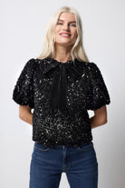 'Jeans and a nice top' just got an upgrade. With a statement tie at the back, our black sequin blouse is the perfect conversation starter (mostly, "where did you get that?").
