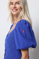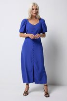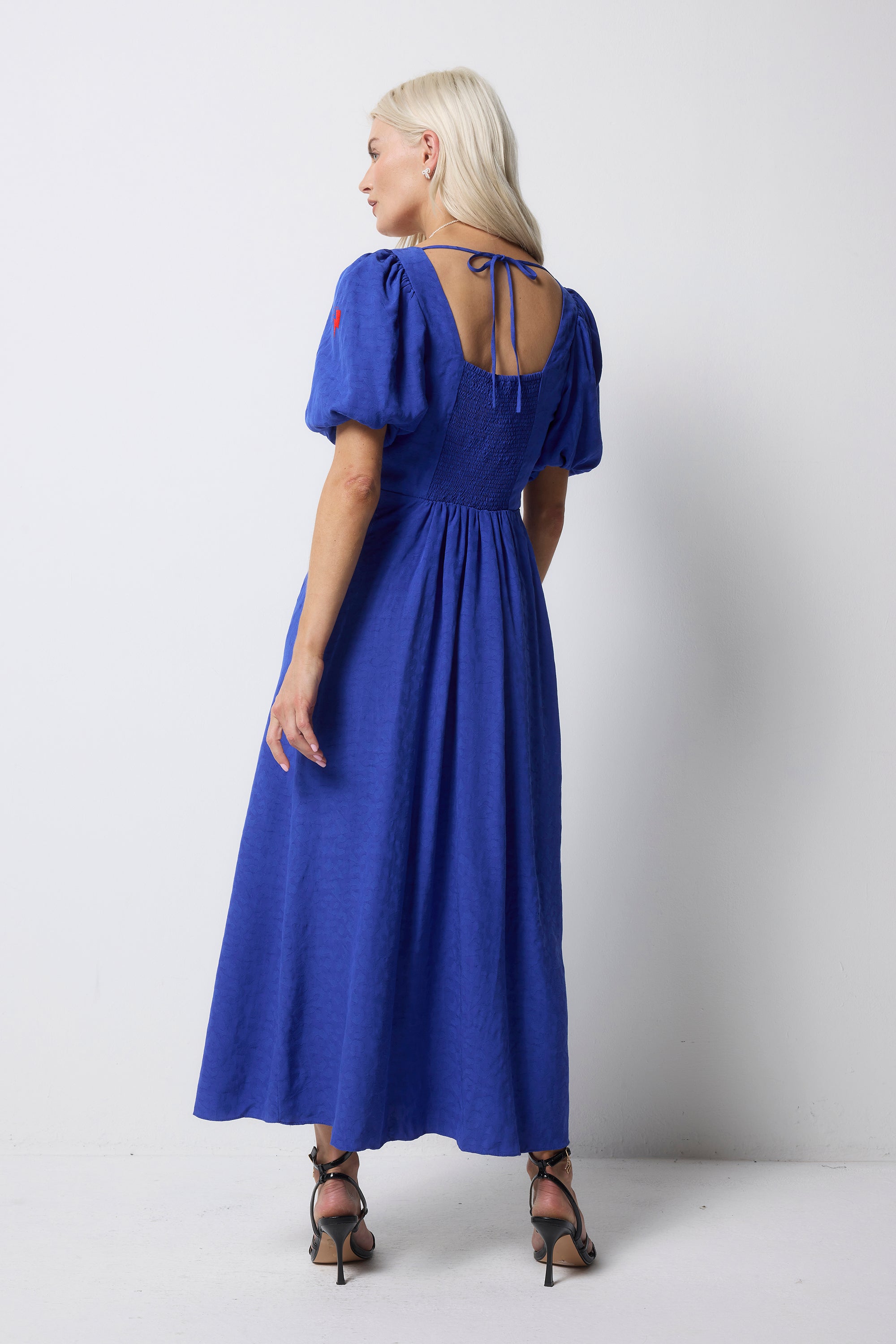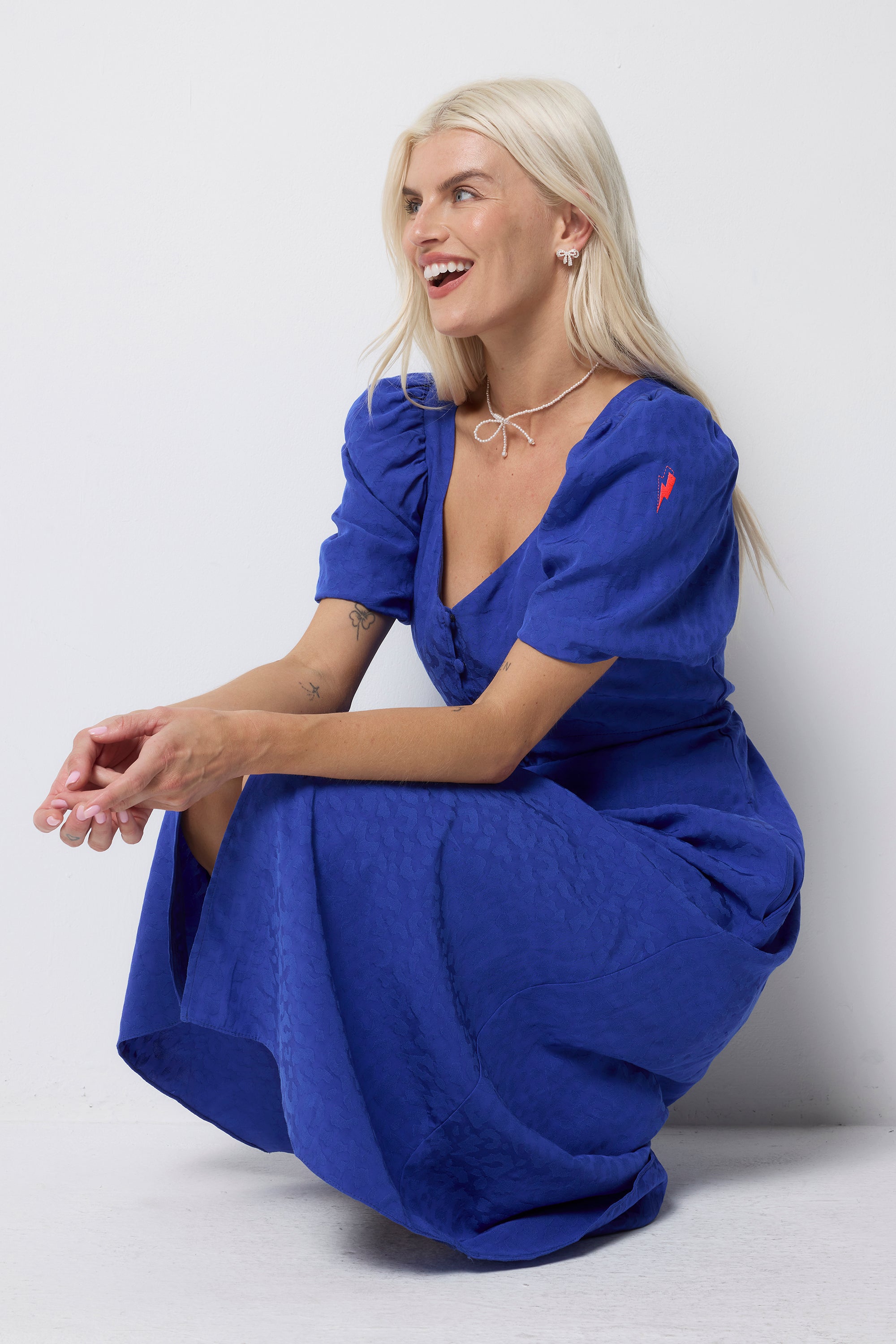 This blue animal jacquard midi tea dress has big plans for your social calendar. Made from a matt satin viscose, it features a flattering shirred back, puffed sleeves that add just the right amount of drama and a classic sweetheart neckline that's both demure and delightful.