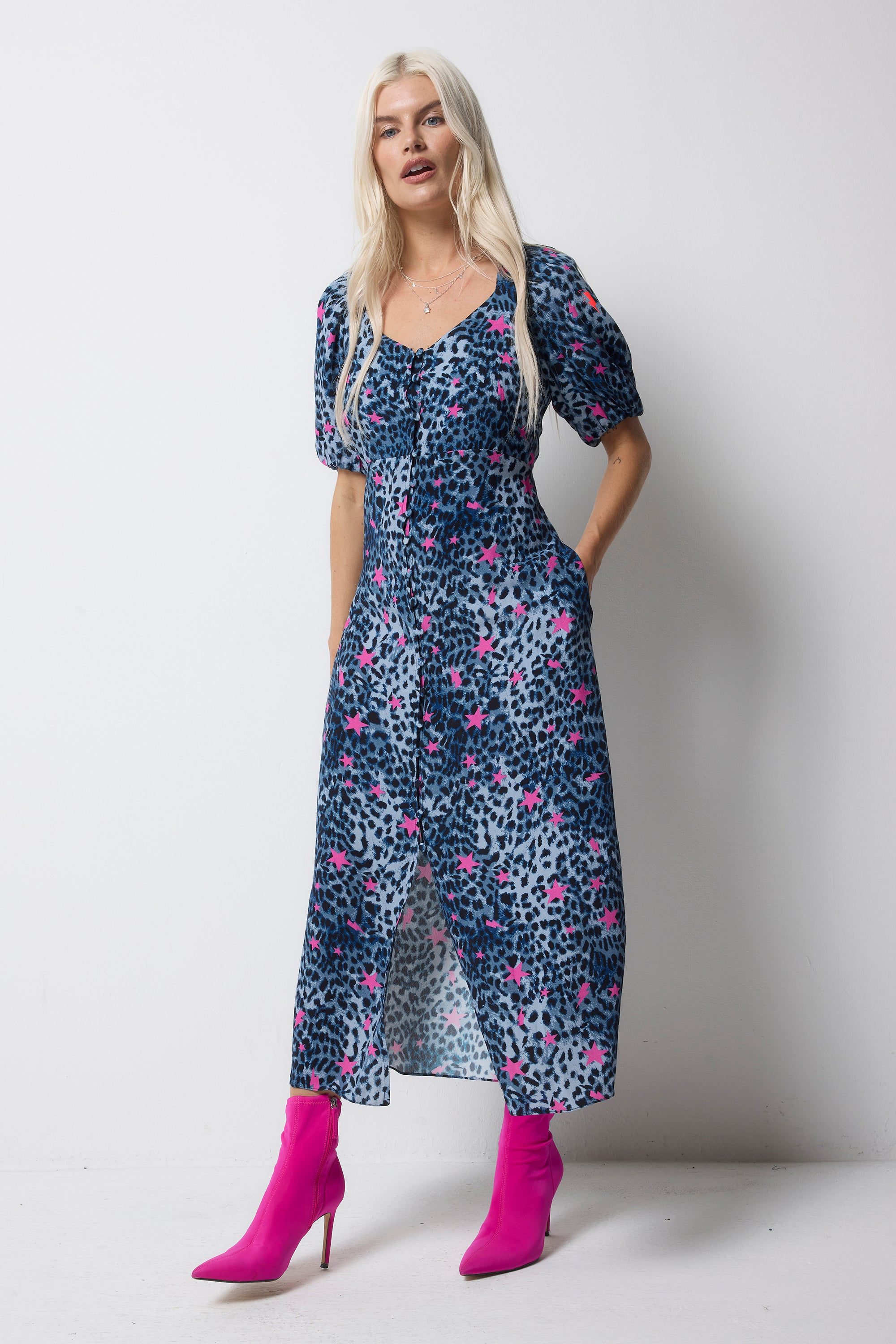 This animal print midi tea dress has big plans for your social calendar. Made from soft viscose crepe, it features a flattering shirred back, puffed sleeves that add just the right amount of drama and a classic sweetheart neckline that's both demure and delightful.
