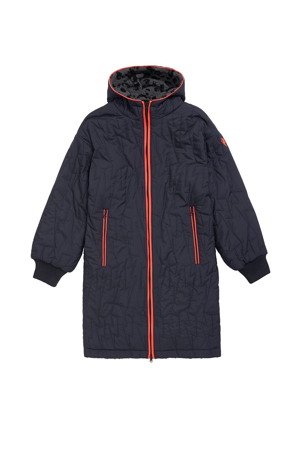 Switch up your look without investing in multiple outerwear pieces with this reversible padded coat. On one side, a navy with lightning bolt quilted detail shower resistant coat, on the other, a soft grey with black leopard and lightning print cosy borg. With it's innovative design, you can effortlessly transform your outfit with just a flip. The functional yet stylish choice will protect you from the elements too, from city breaks to countryside getaways, this coat is a must-have for any fashion-savvy adventurer.