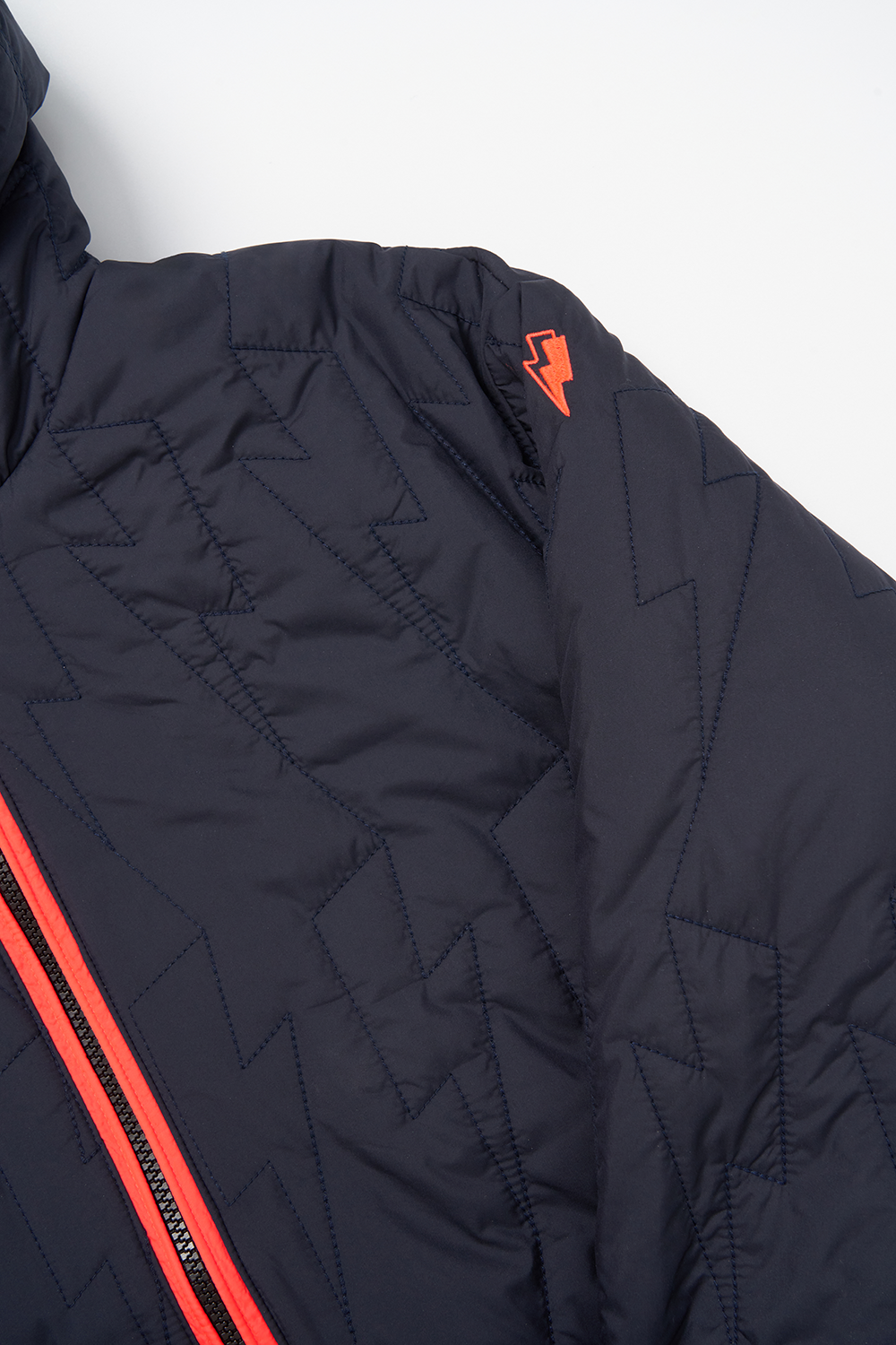 - Signature neon pink embroidered lightning bolt on the sleeve
