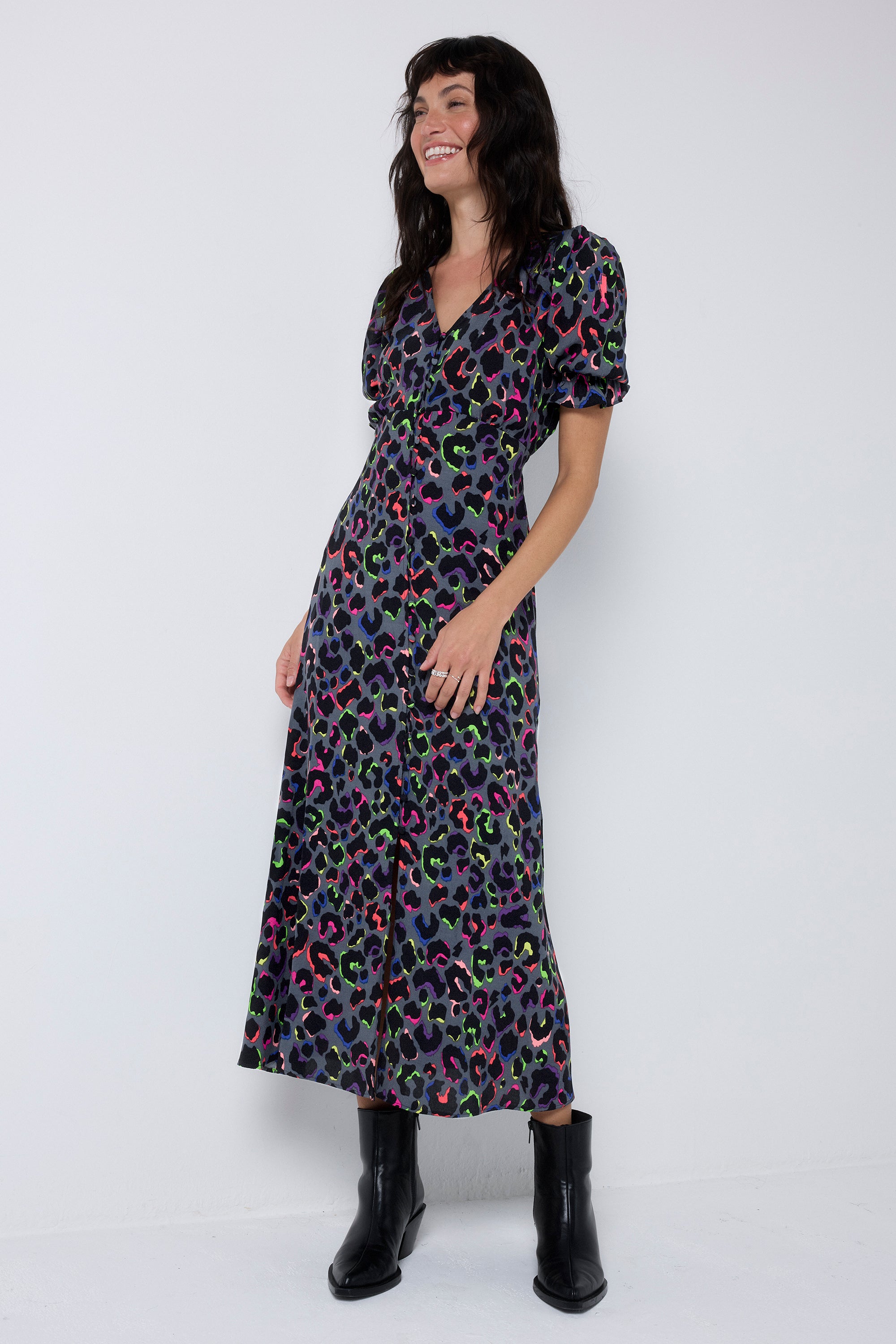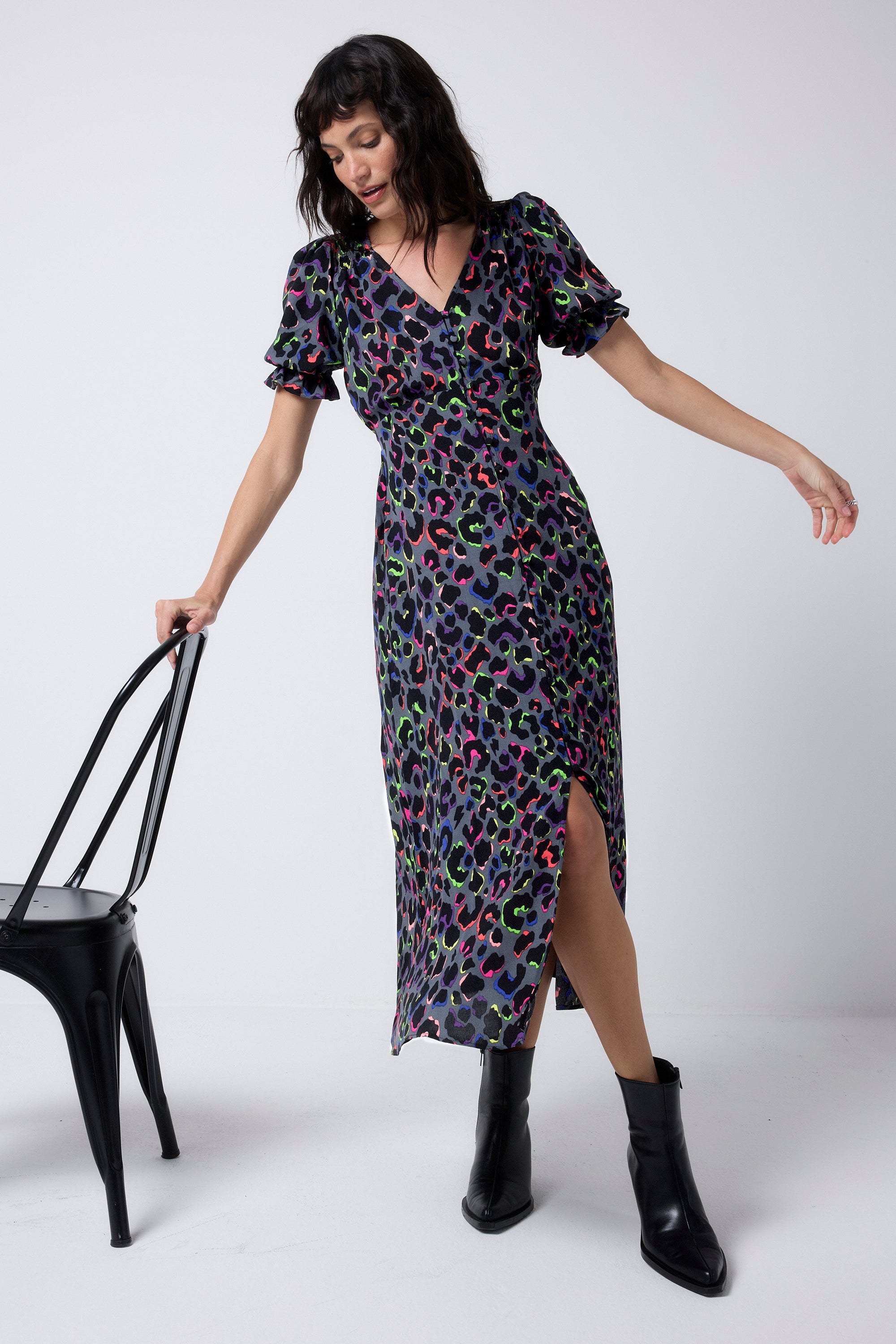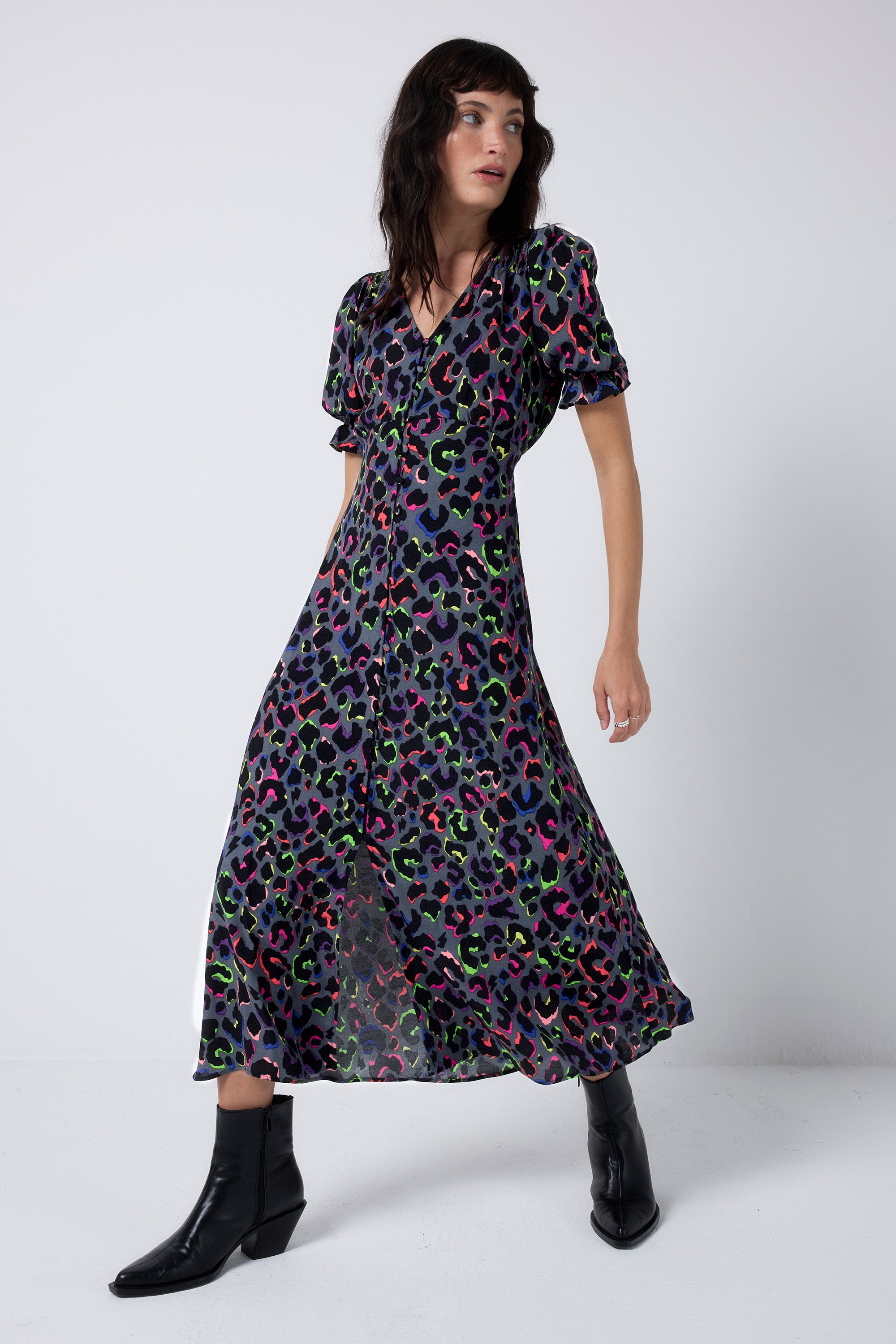 Bold and beautiful, this grey with rainbow shadow leopard and lightning bolt flute sleeve midi tea dress will make a joyful addition to your wardrobe. Made in a soft viscose crepe fabric, this versatile midi-length dress features a timeless V-neck. Effortlessly flattering, it is one you'll reach for on relaxed days with friends.