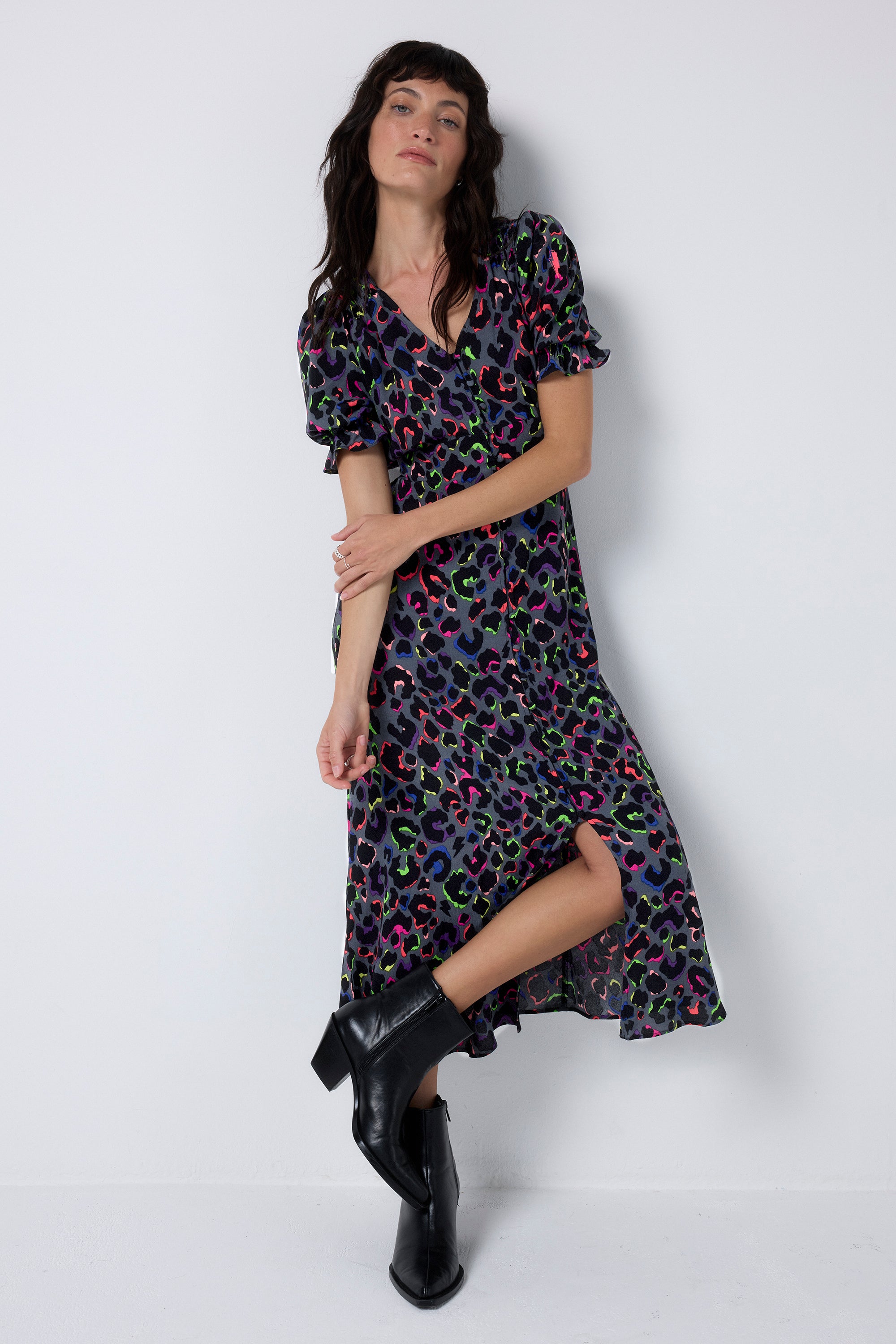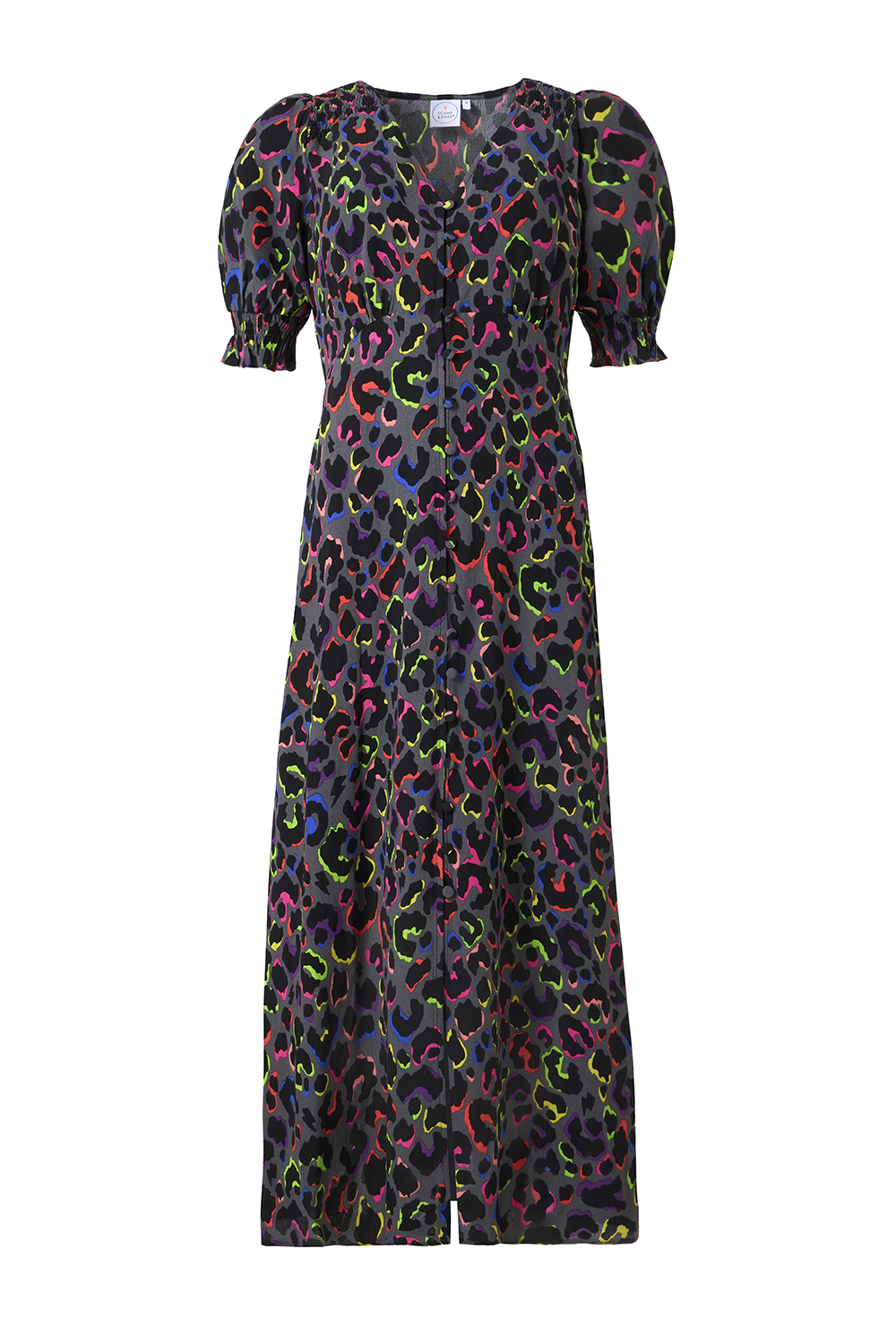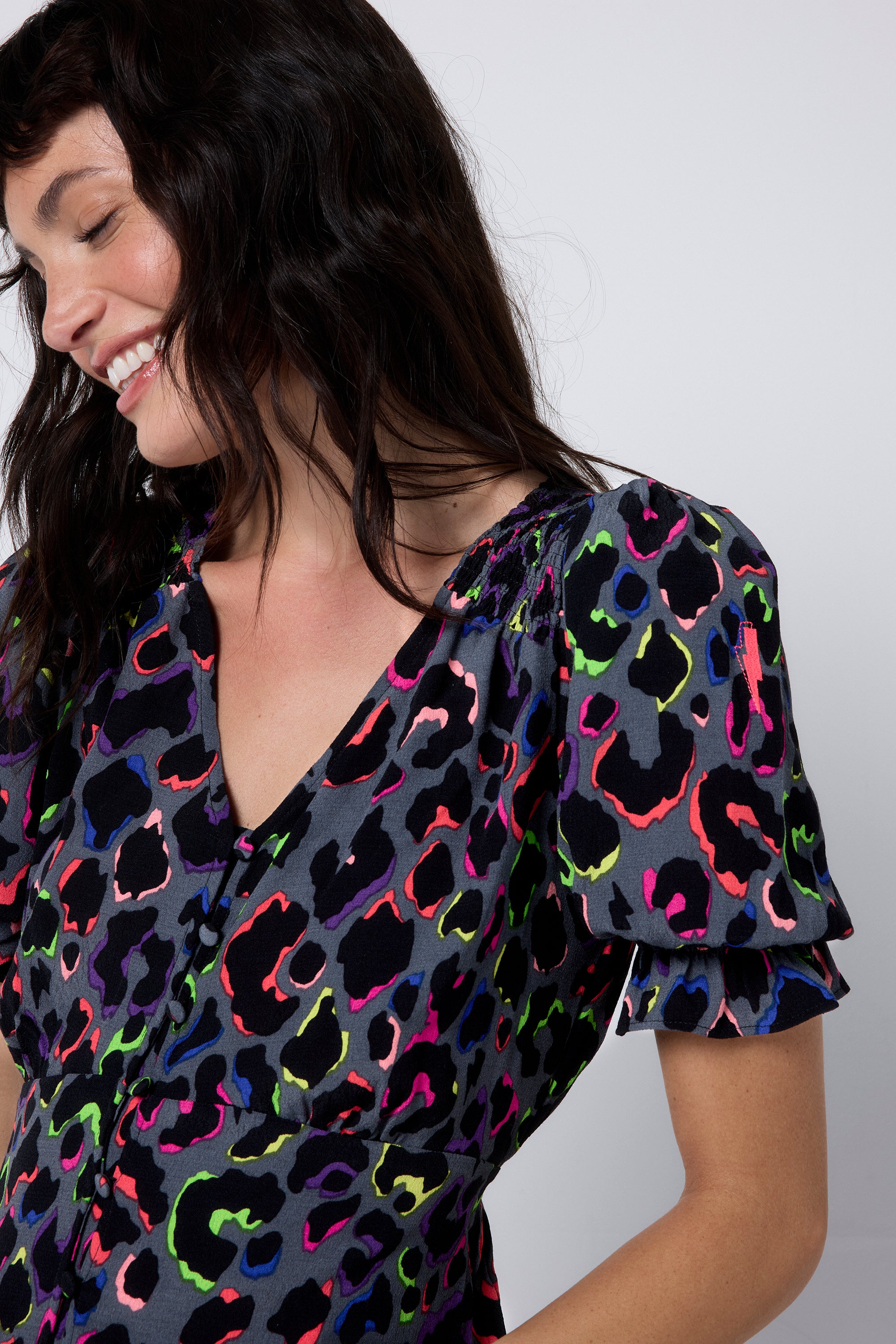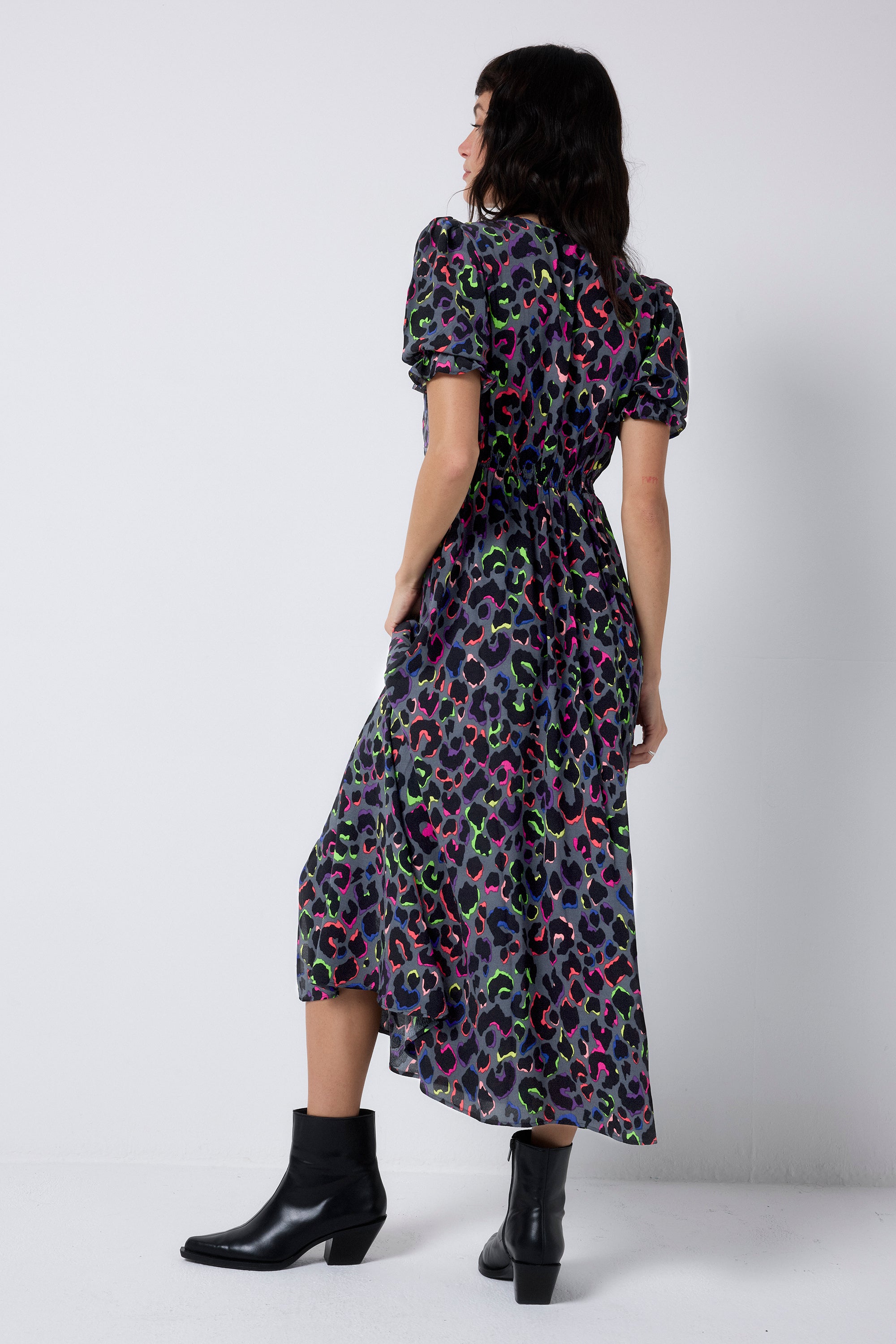 Bold and beautiful, this grey with rainbow shadow leopard and lightning bolt flute sleeve midi tea dress will make a joyful addition to your wardrobe. Made in a soft viscose crepe fabric, this versatile midi-length dress features a timeless V-neck. Effortlessly flattering, it is one you'll reach for on relaxed days with friends.