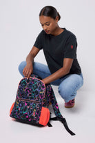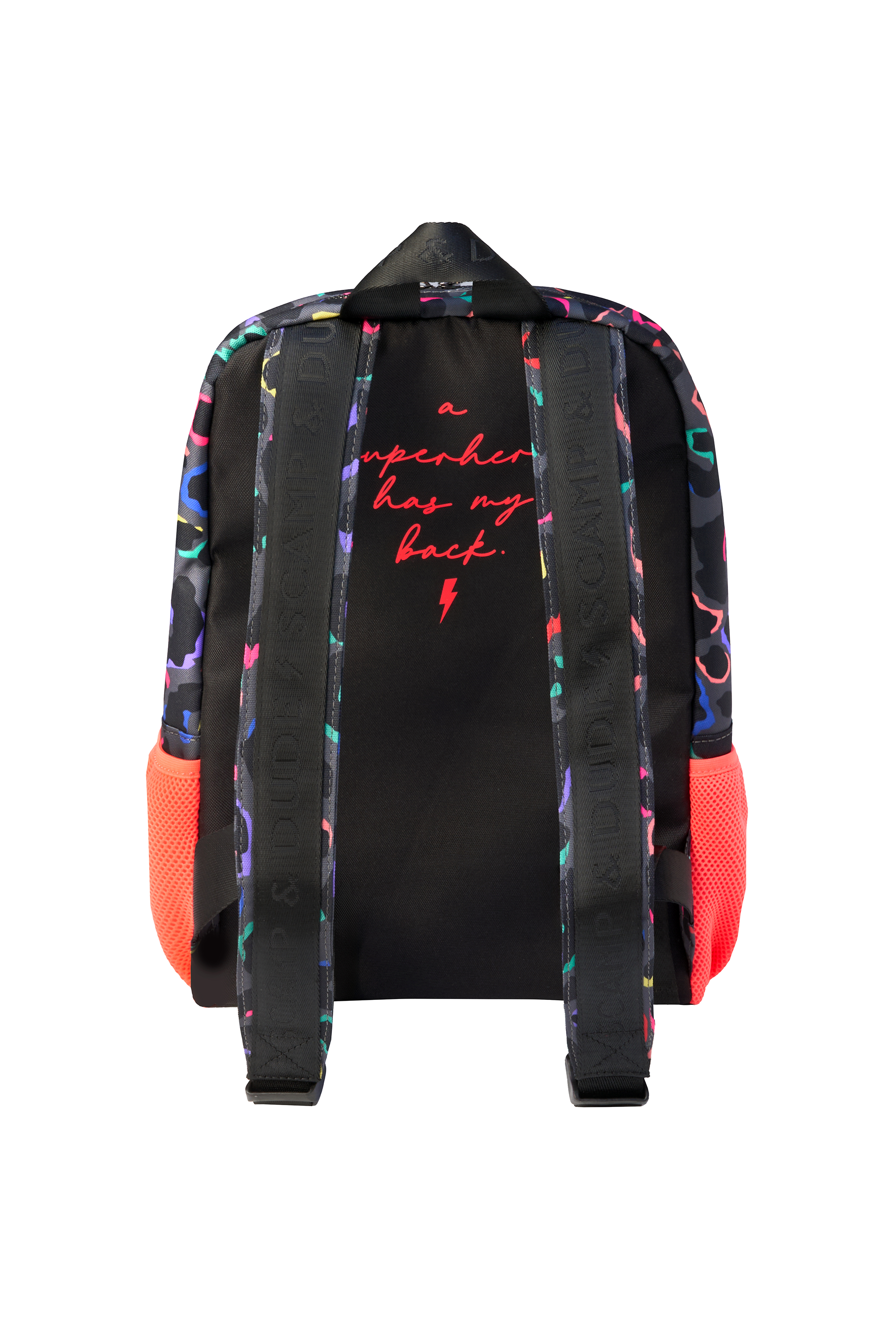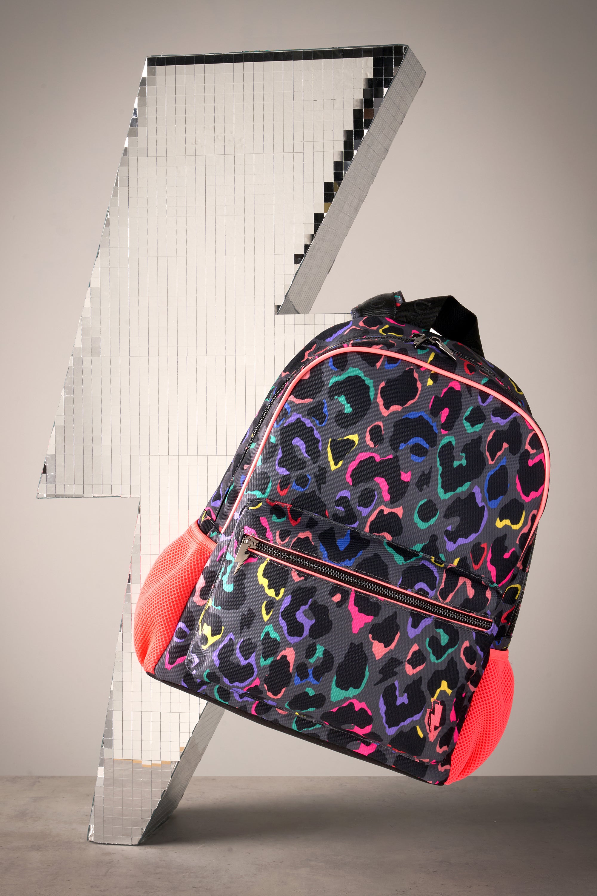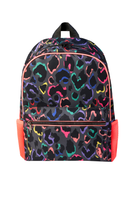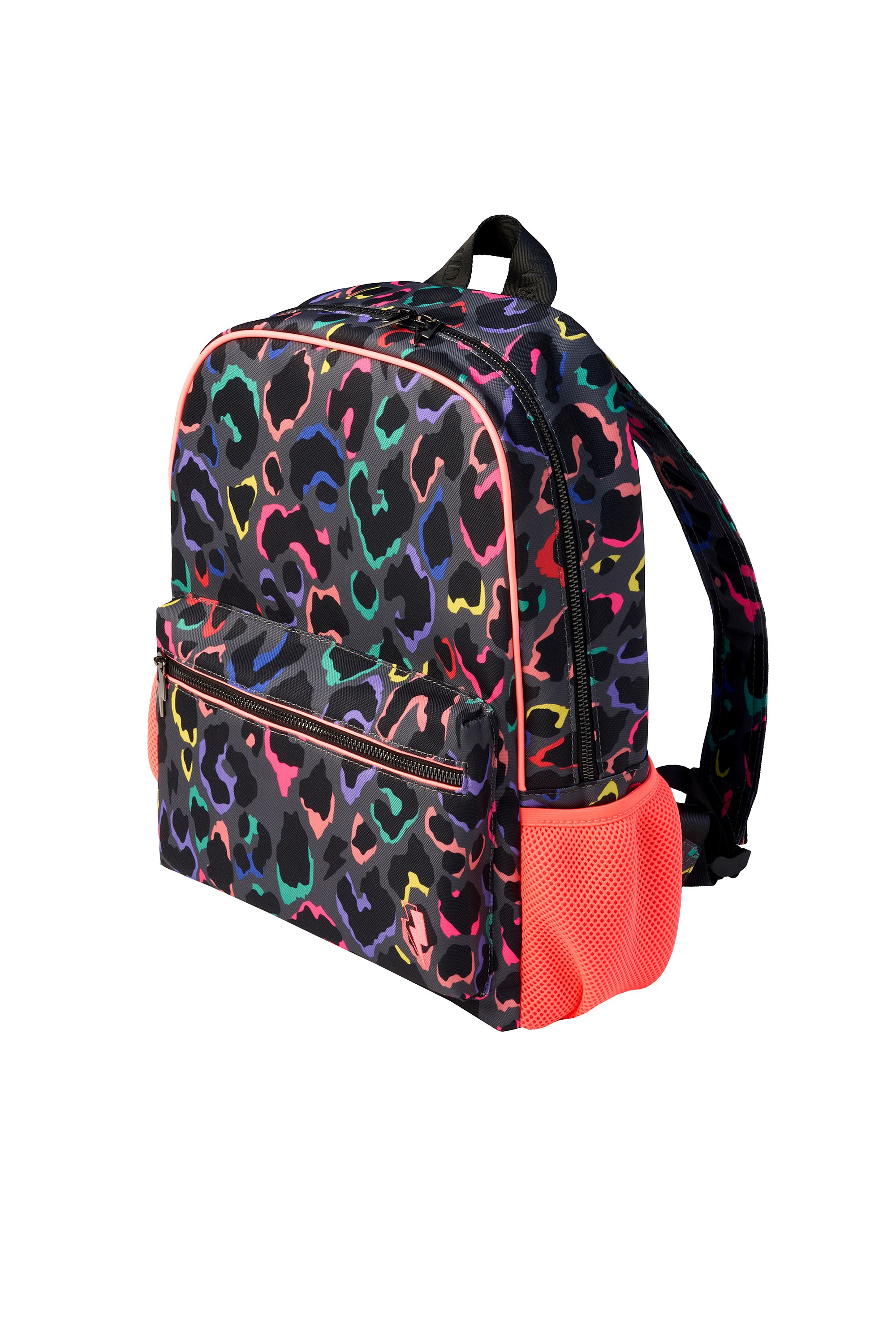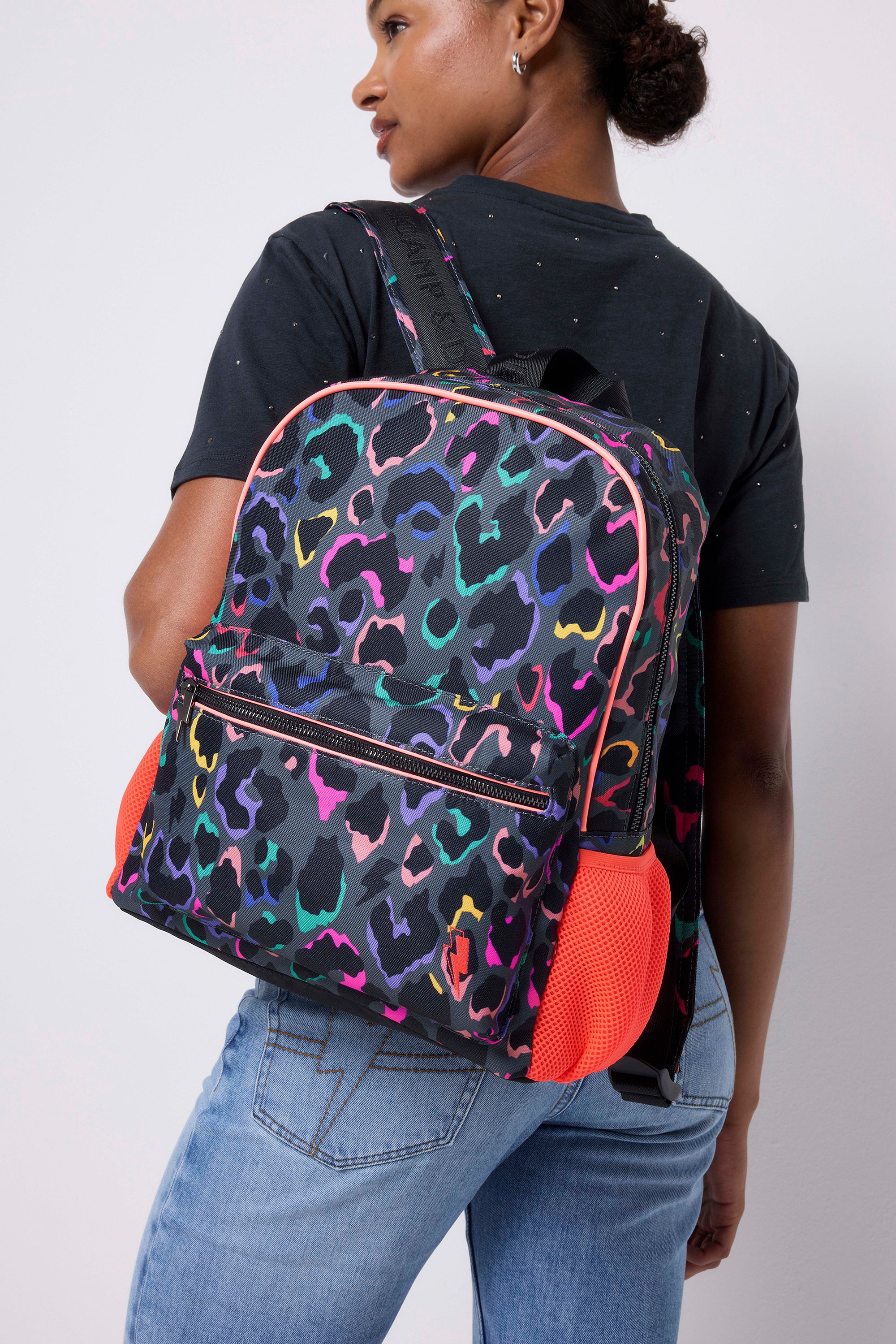 Combining fashion with functionality, our grey with rainbow shadow leopard and lightning bolt print unisex backpack is designed with adults and bigger kids in mind. It comfortably fits a laptop and also kids A4 school books/folders.