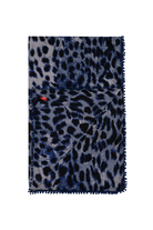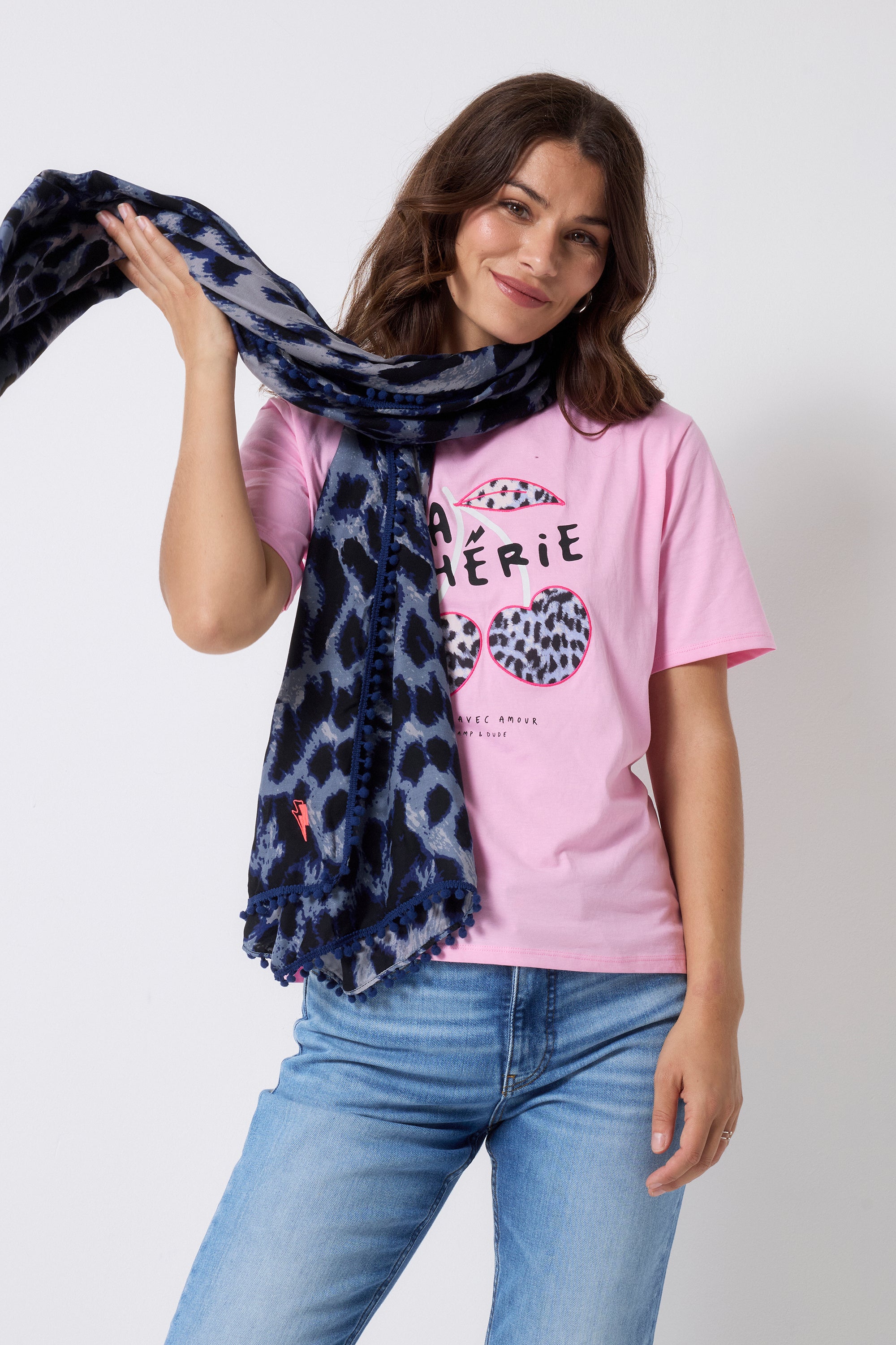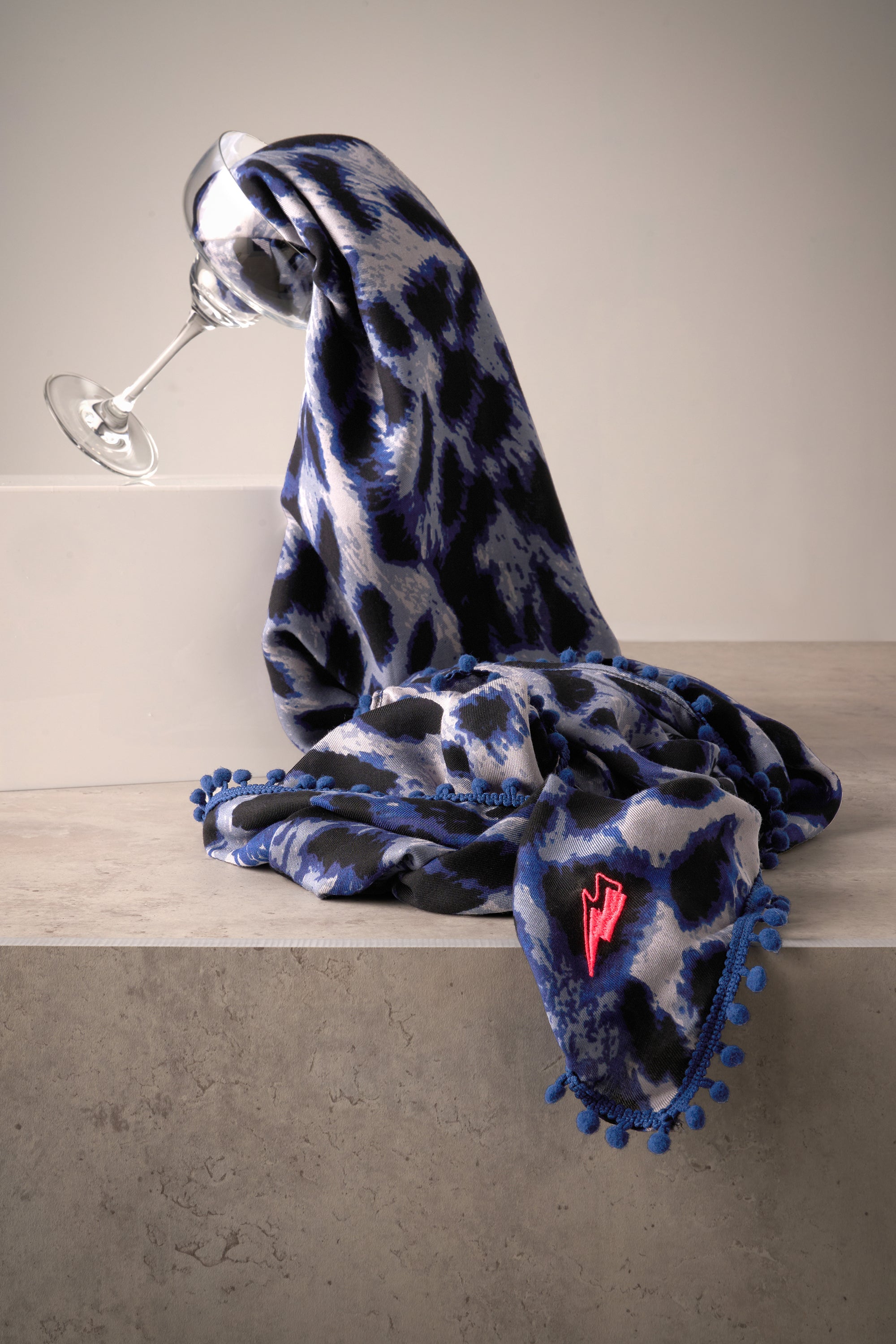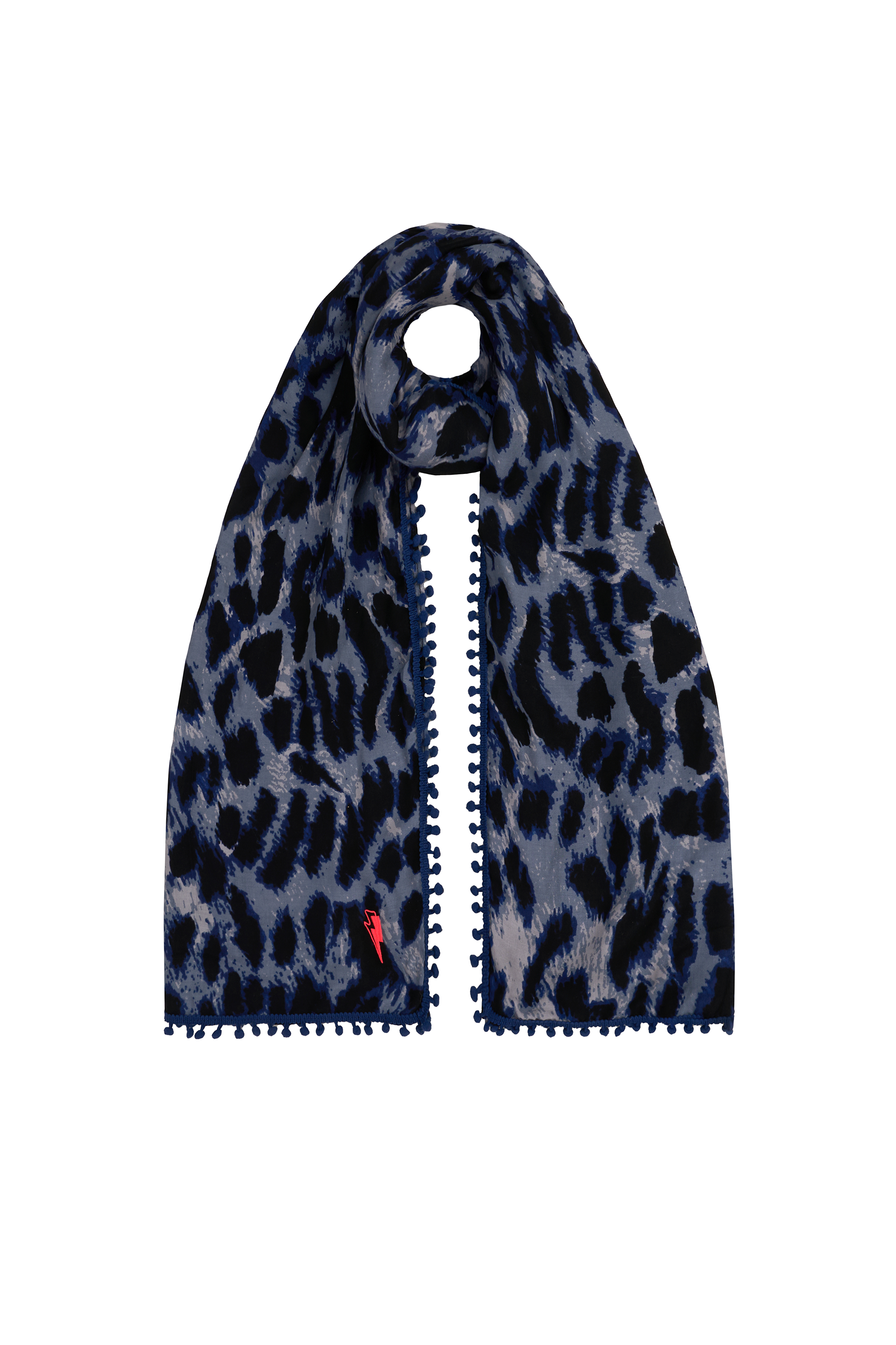A super-soft, superpower-infused scarf in our Navy Mega Cheetah and lightning bolt print. Featuring a blue pom pom trim and neon pink embroidered lightning bolt Superpower Button.