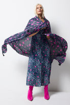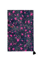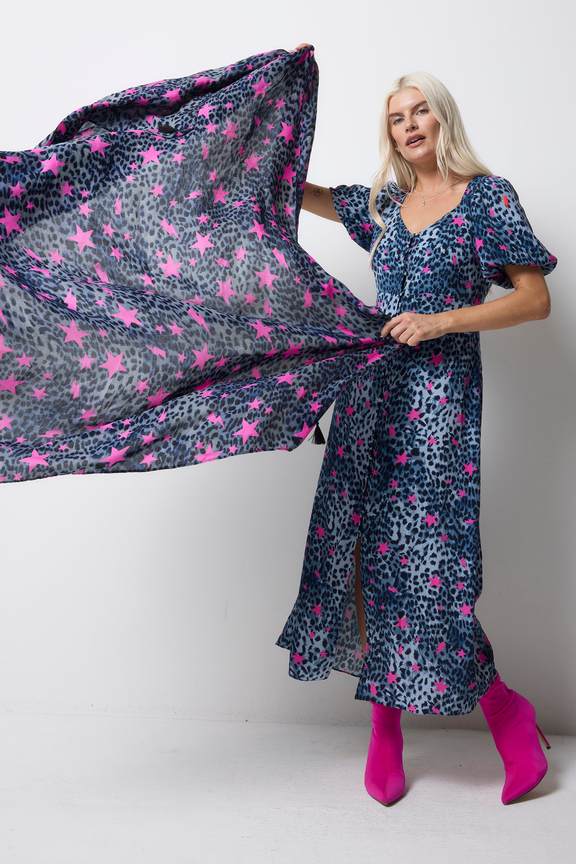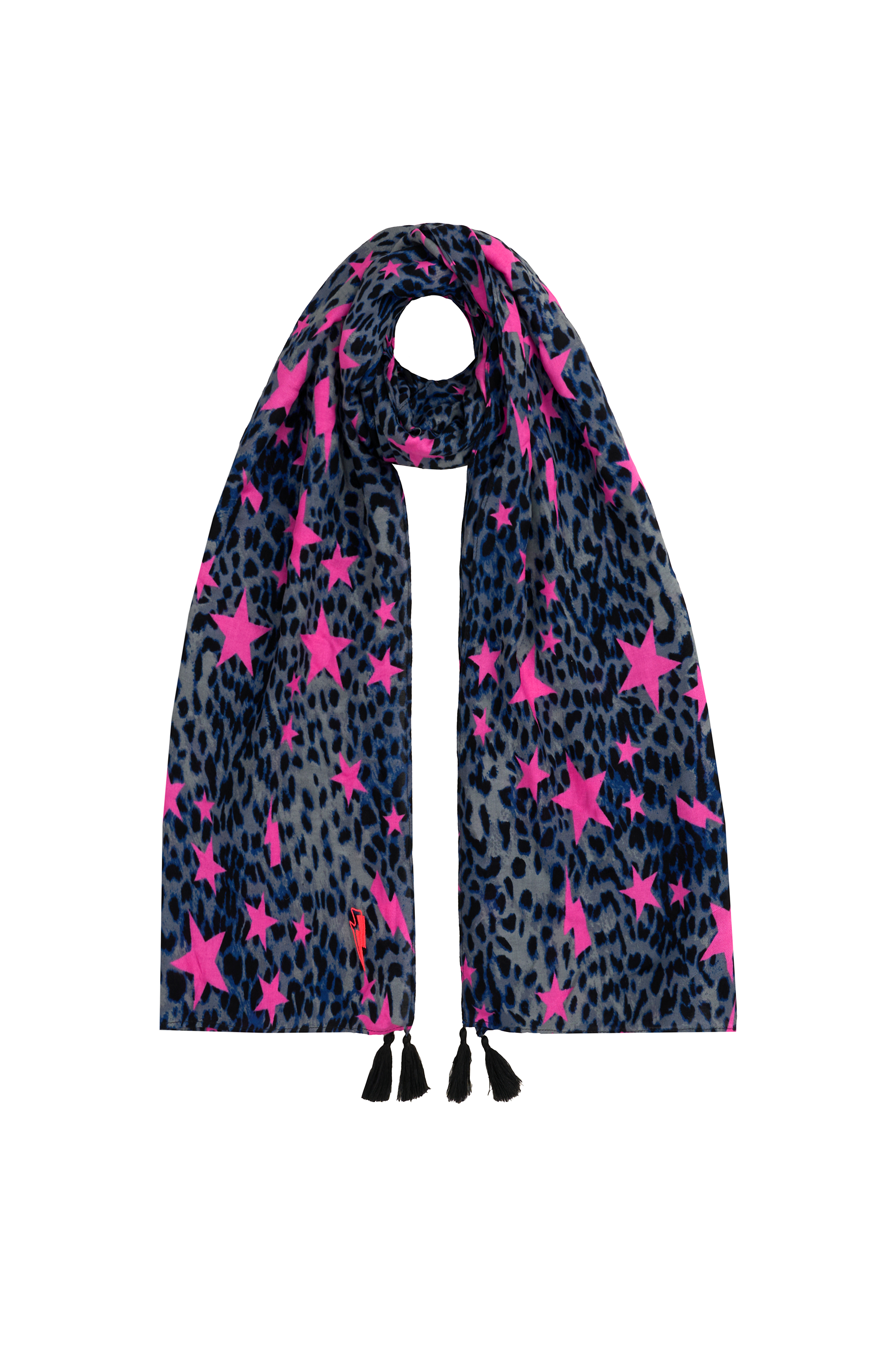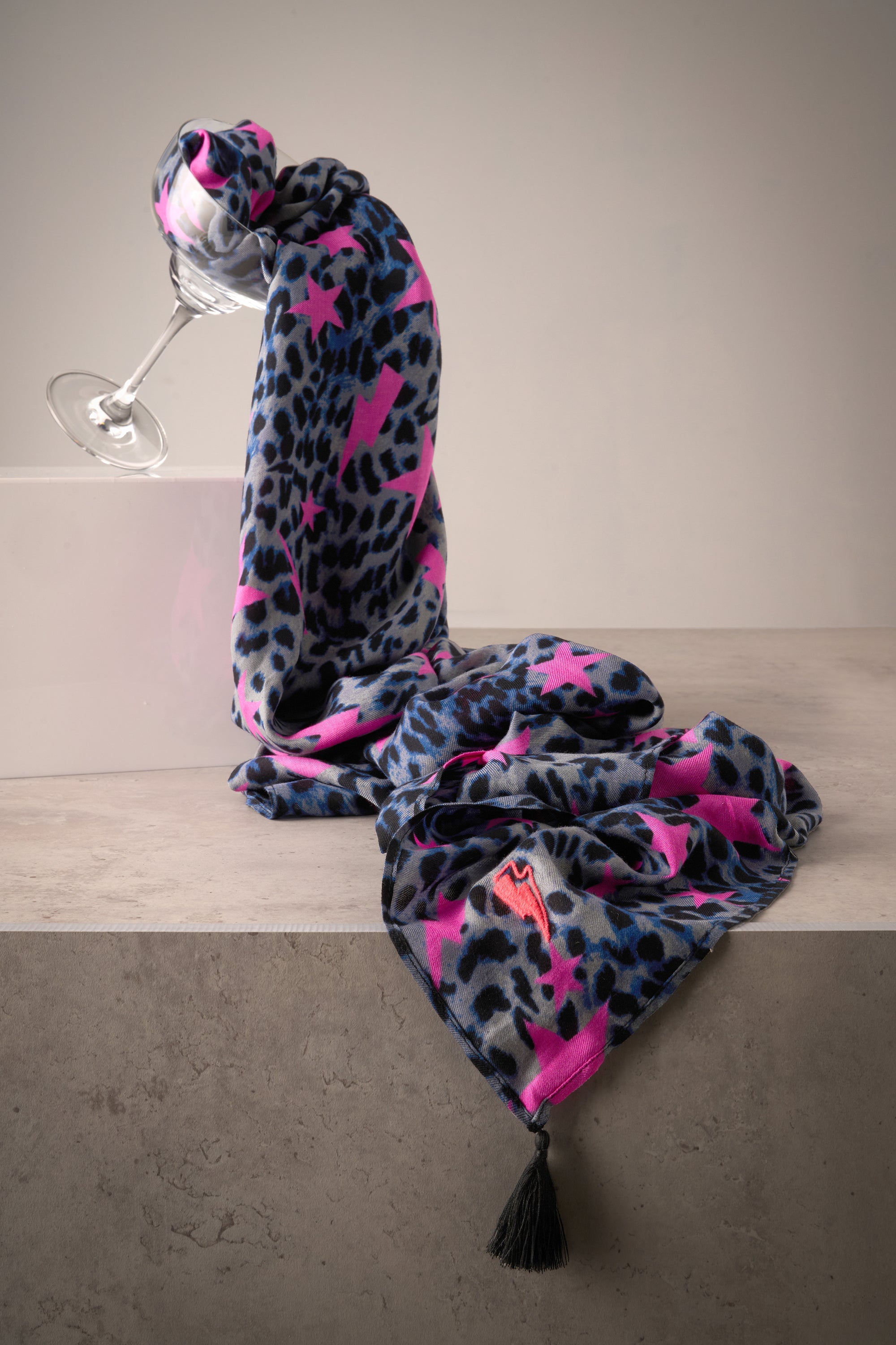 A super-soft, superpower-infused scarf in our navy with pink star cheetah and lightning bolt print. Featuring a black tassel trim and neon pink embroidered lightning bolt Superpower Button.