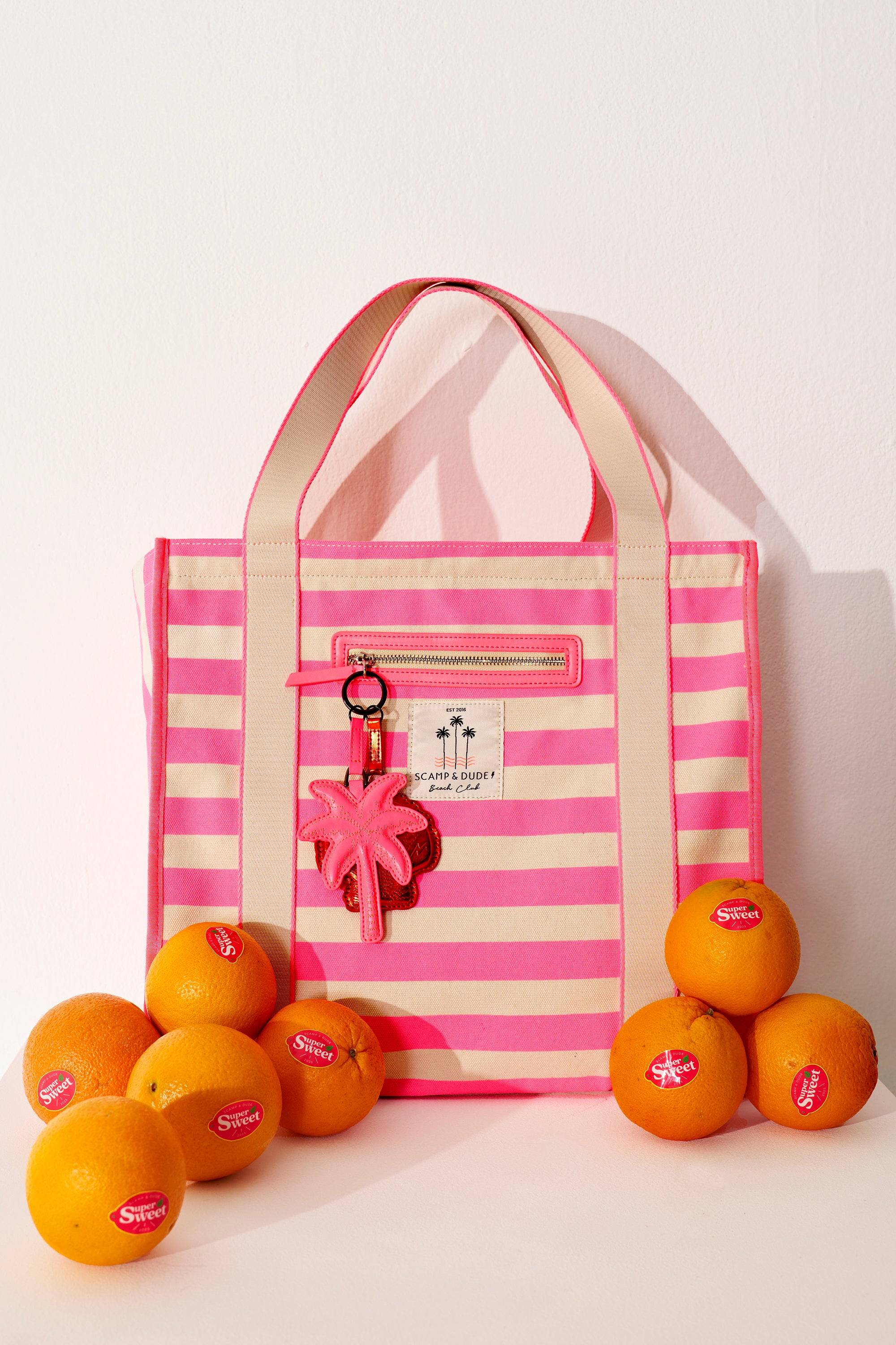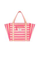 This generously sized pink and ivory stripe canvas bag will become your summer staple, year after year. Pack your water bottles, sunglasses, towels, tanning lotions and other warm weather essentials and carry with ease.
