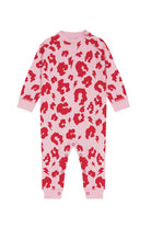 Super soft pink with red organic cotton baby romper featuring our signature leopard and lightning bolt print. Neon pink embroidered bolt ‘Superpower Button’ on sleeve.