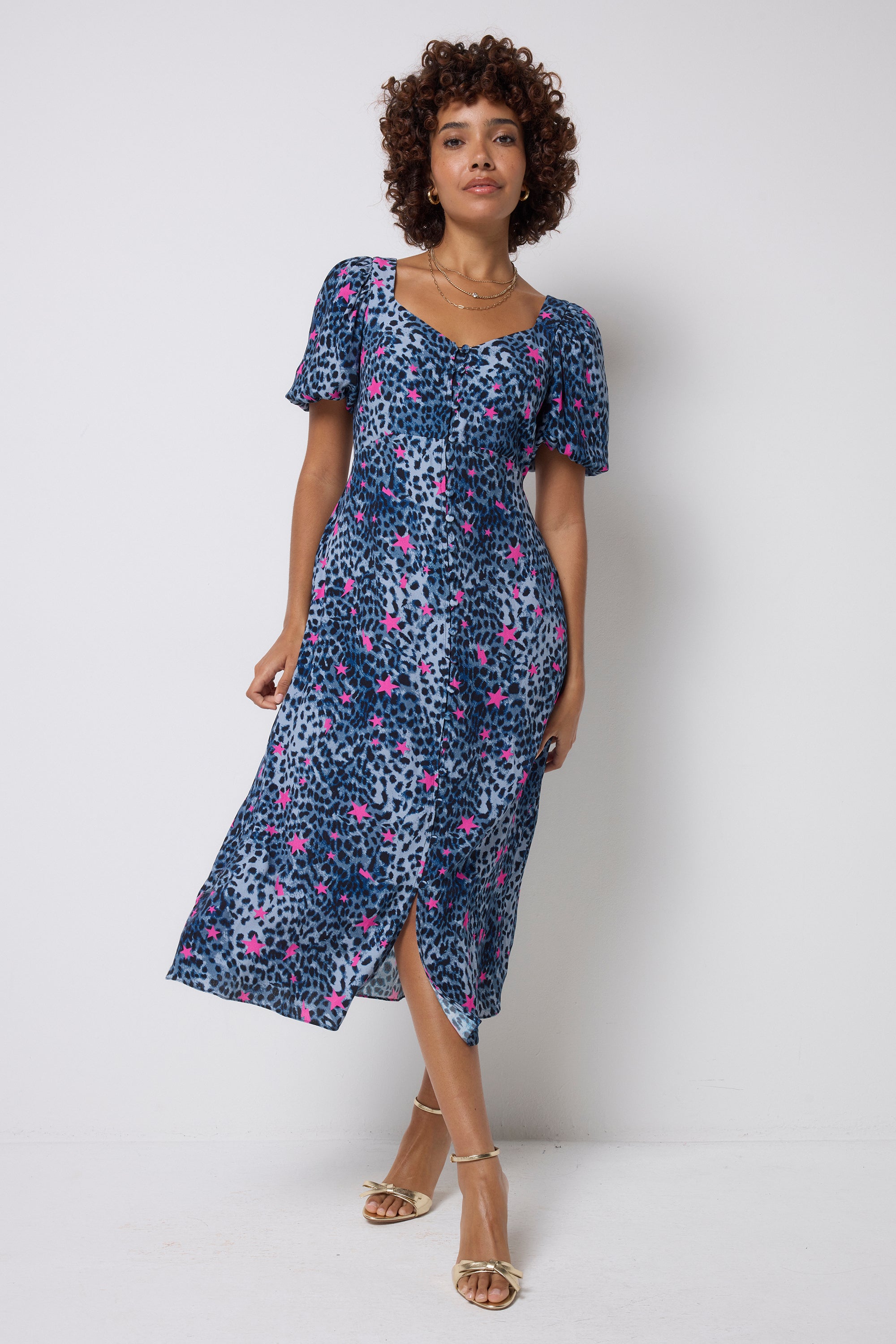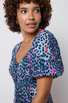 This animal print midi tea dress has big plans for your social calendar. Made from soft viscose crepe, it features a flattering shirred back, puffed sleeves that add just the right amount of drama and a classic sweetheart neckline that's both demure and delightful.