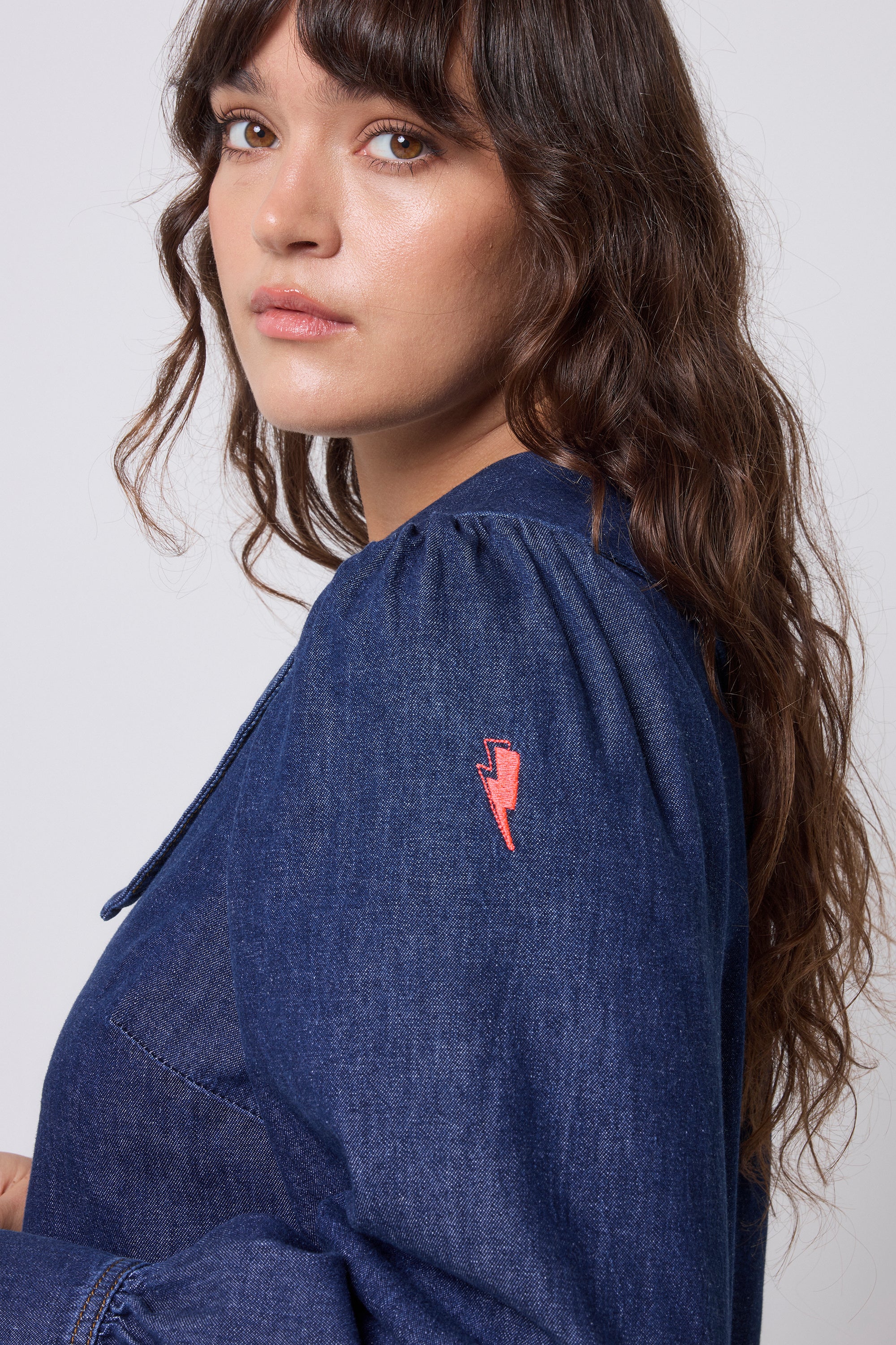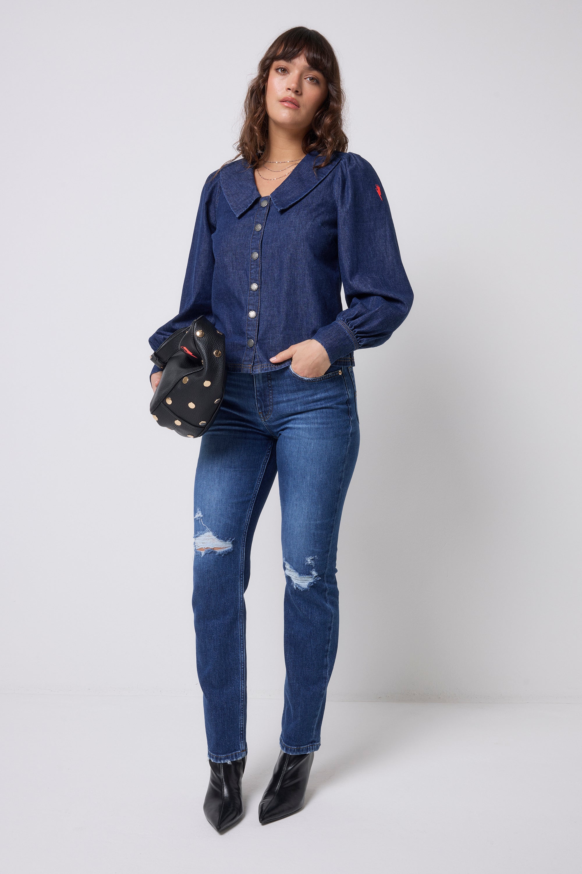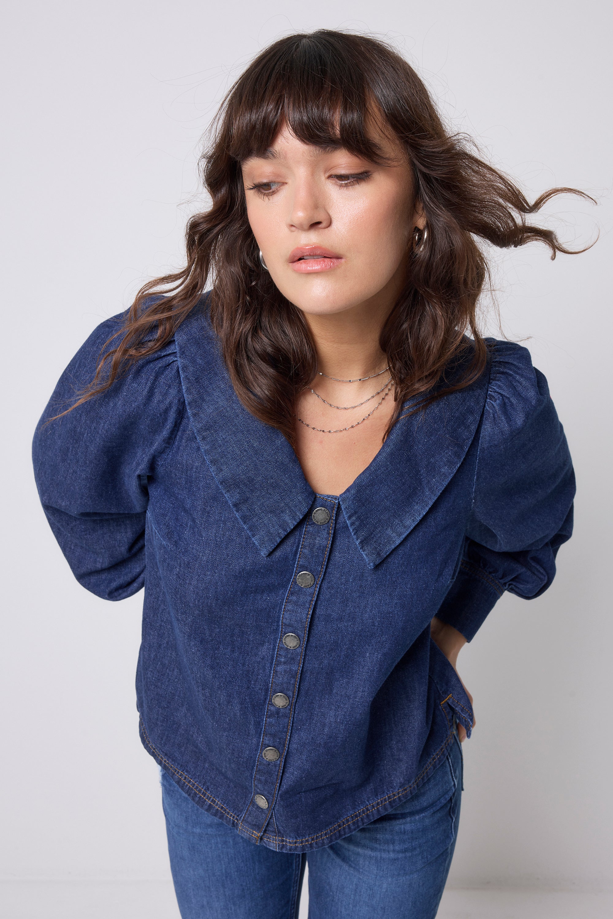 A dark denim blouse designed for effortless versatility. Featuring an oversized statement collar, button poppers and a softly ballooned sleeve, it’s made to be worn your way, tucked in or loose, dressed up or pared back. The ultimate day-to-night staple.