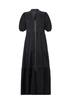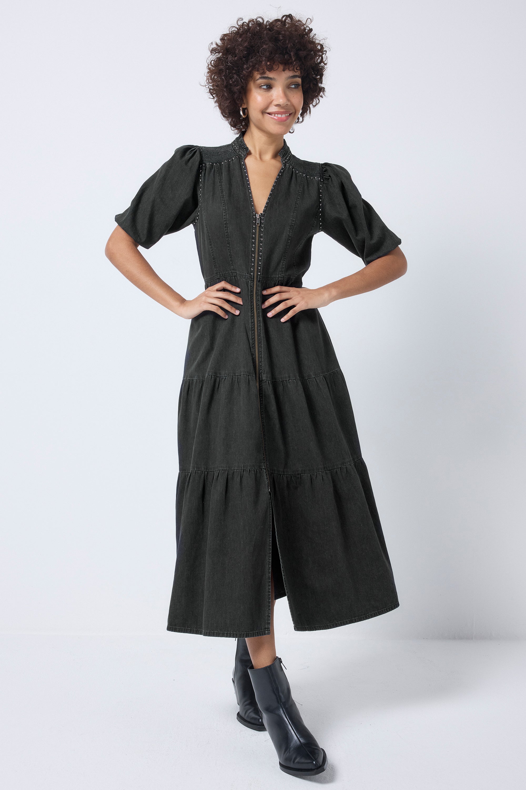 Print: Washed Black Studded Zip Detail Tiered Midi Denim Dress