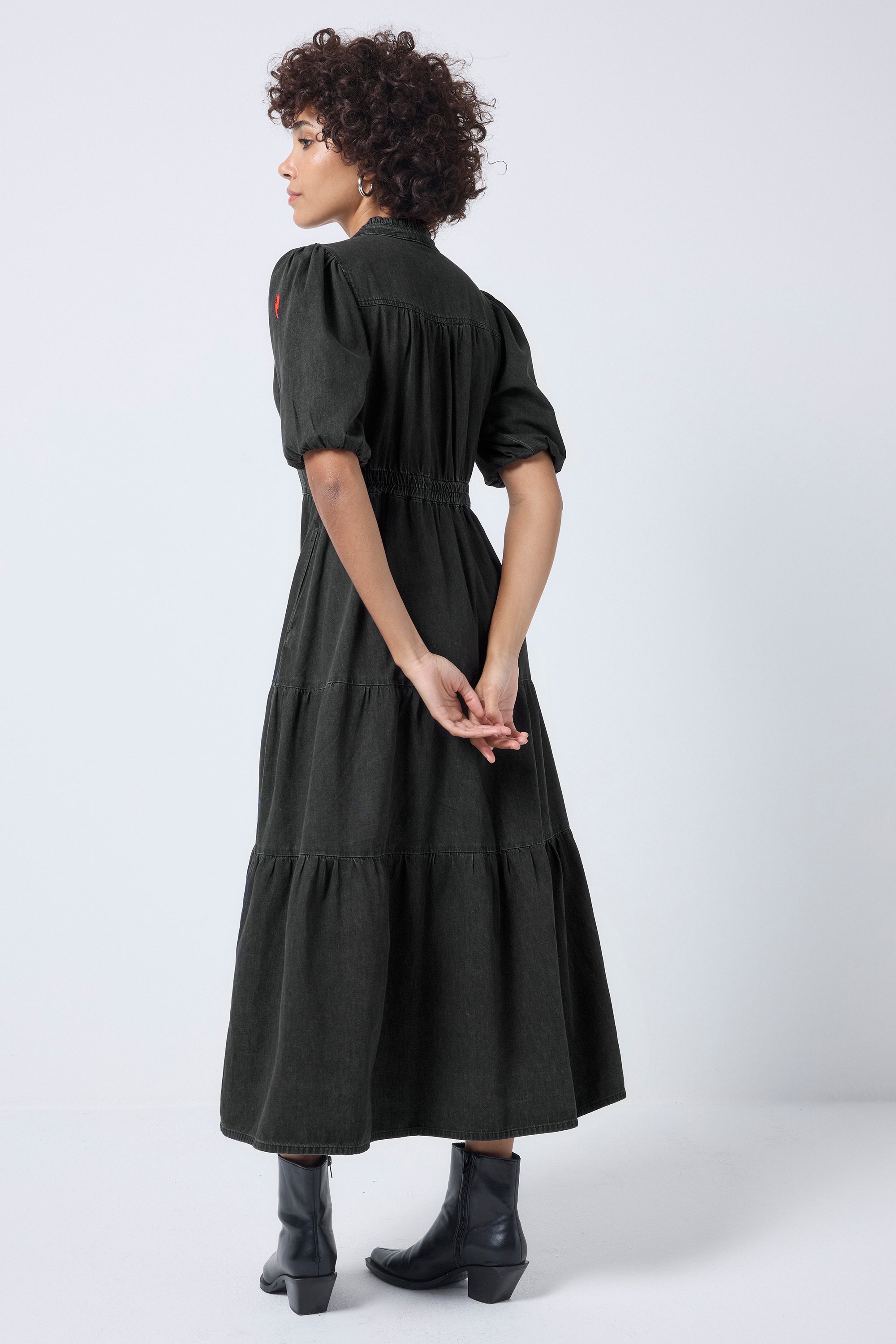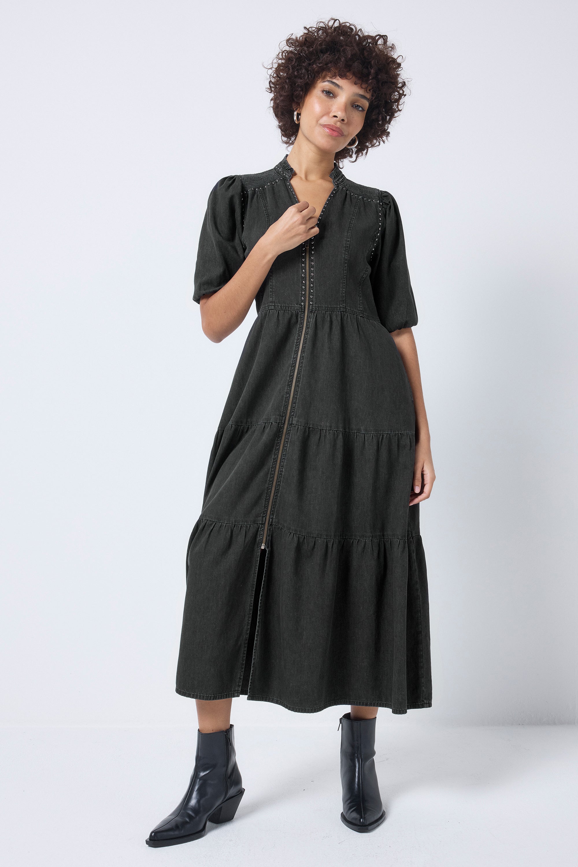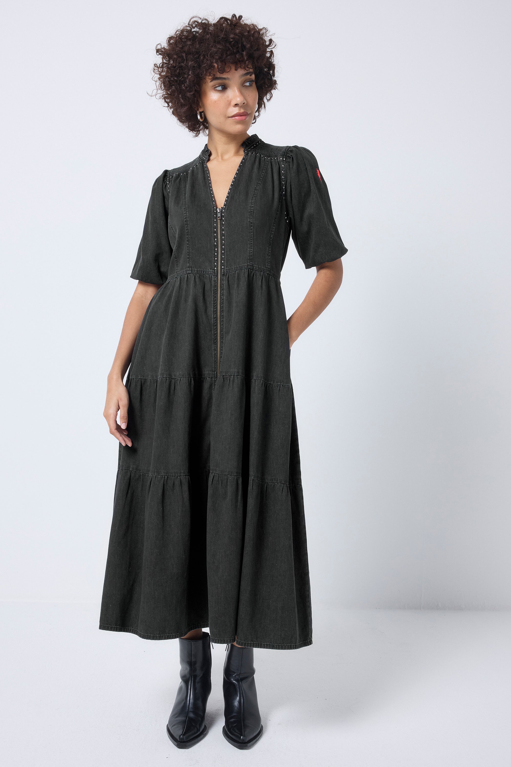 Washed Black Studded Zip Detail Tiered Midi Denim Dress