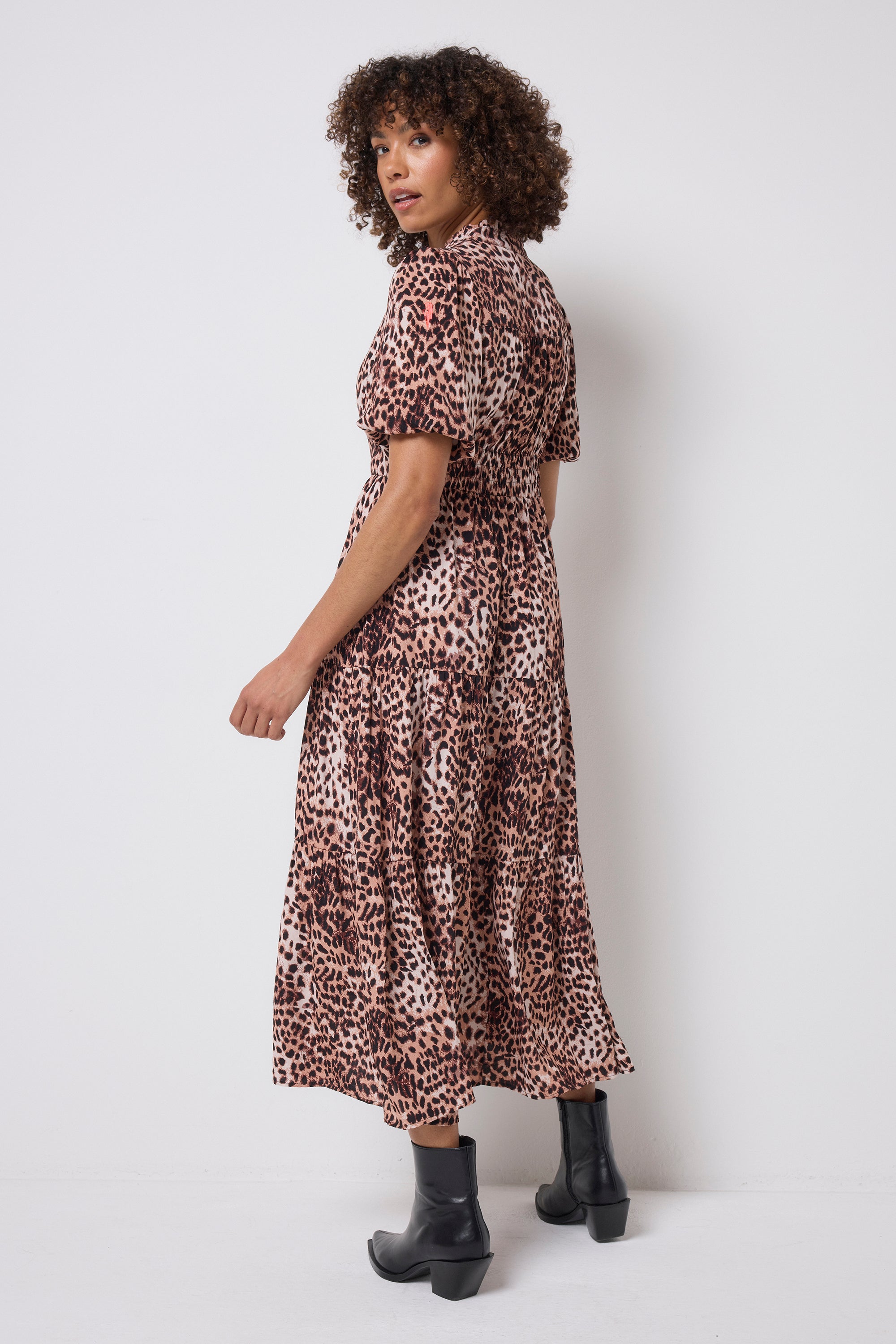 Neutral with Black Cheetah Zip Detail Tiered Midi Dress