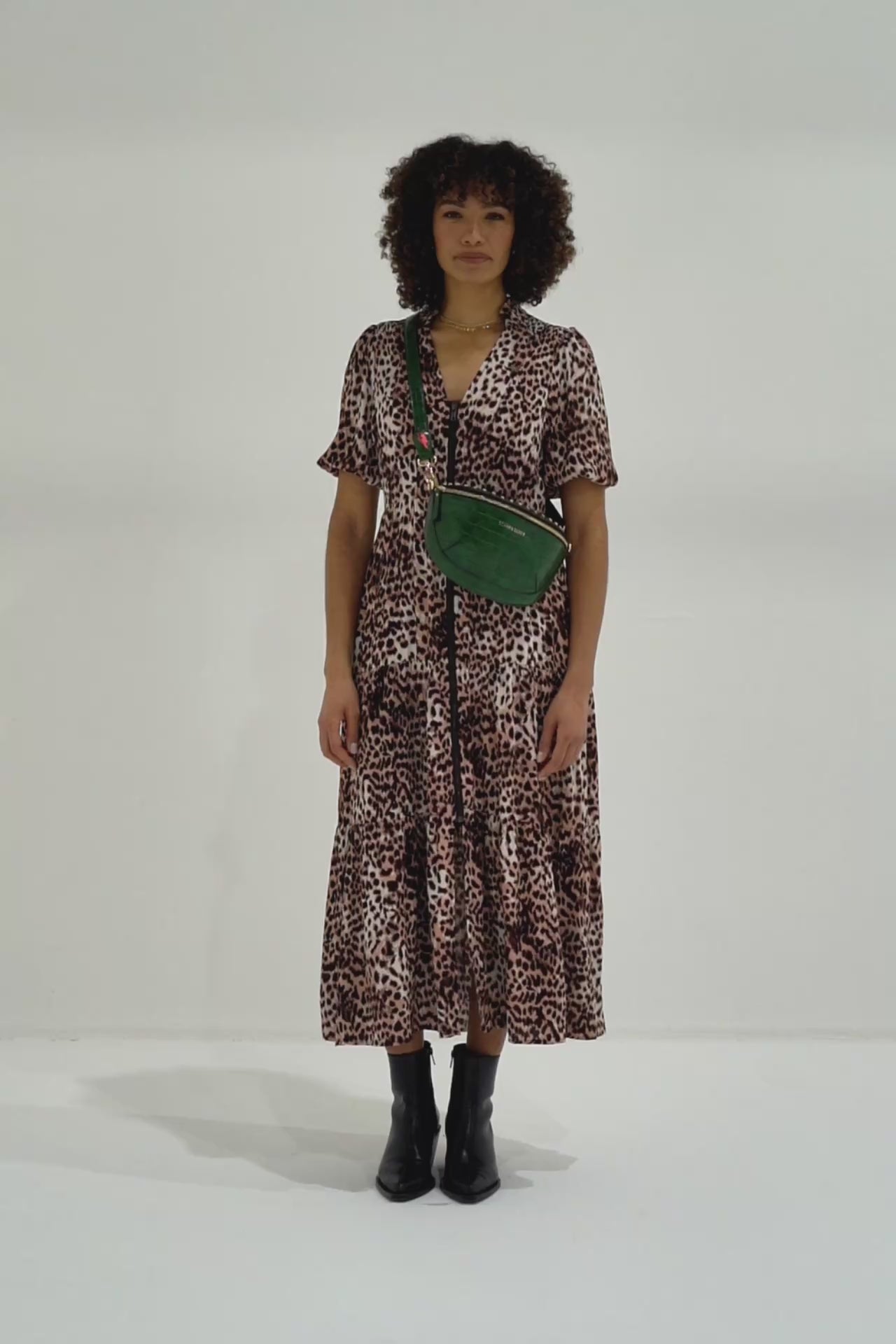 Neutral with Black Cheetah Zip Detail Tiered Midi Dress