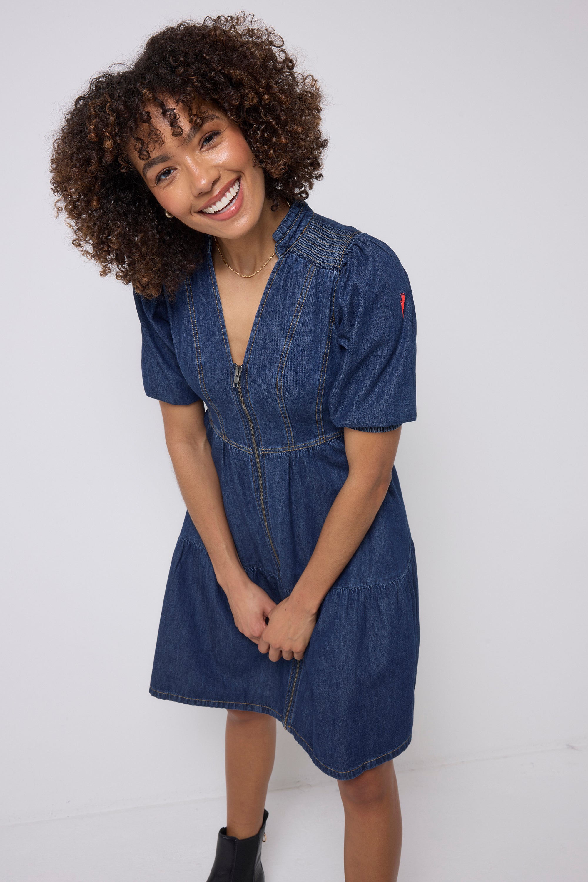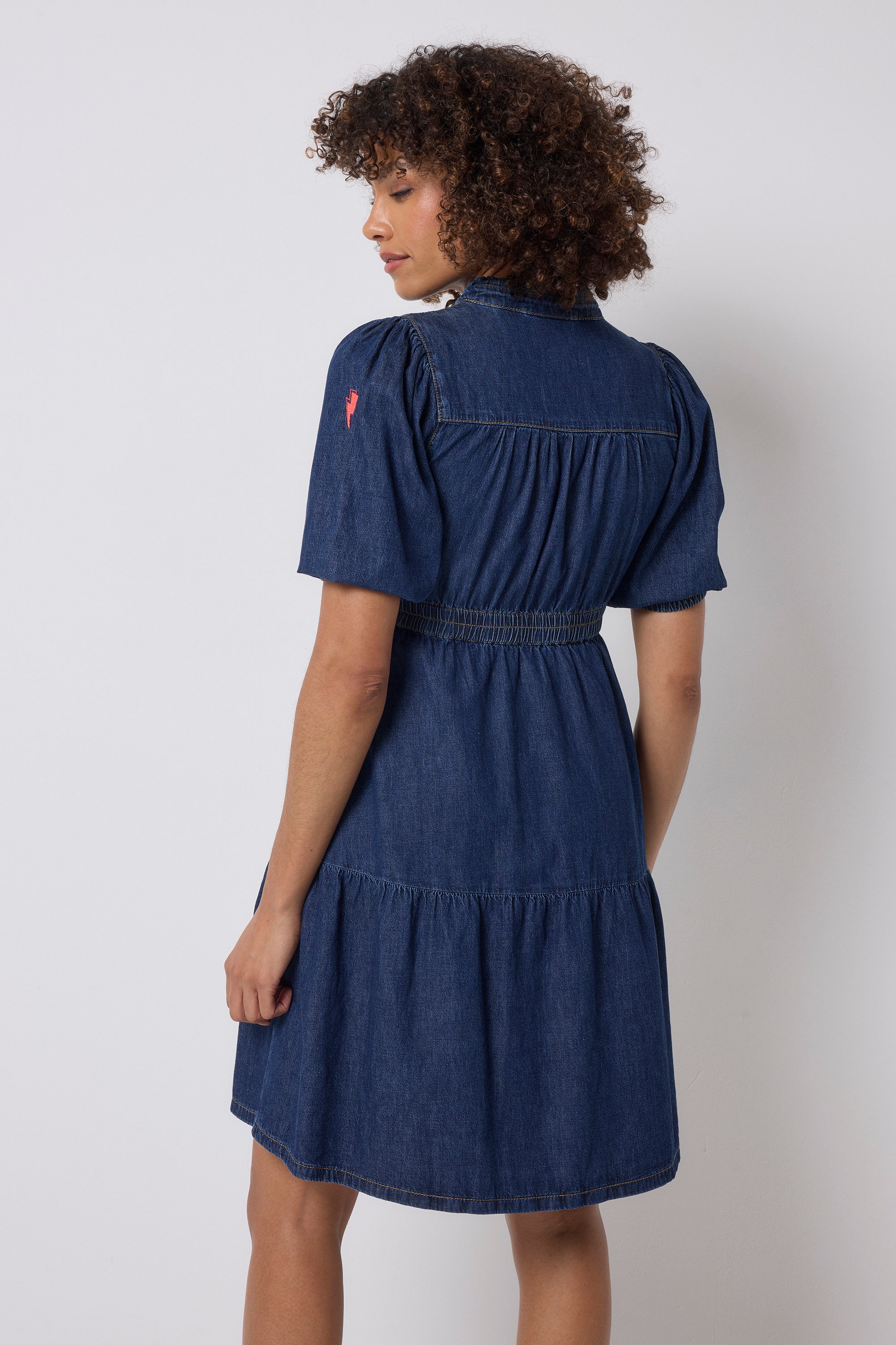Crafted from responsibly sourced cotton this authentic indigo zip detail tiered short dress is all about off-duty charm. It's crafted in denim, complete with romantic short puff sleeve sleeves, a smart v-neckline and a contrast zip fastening. For a flattering silhouette, the piece is elasticated around the waist while the short length skirt fall in tiers in a flattering fit and flare style.