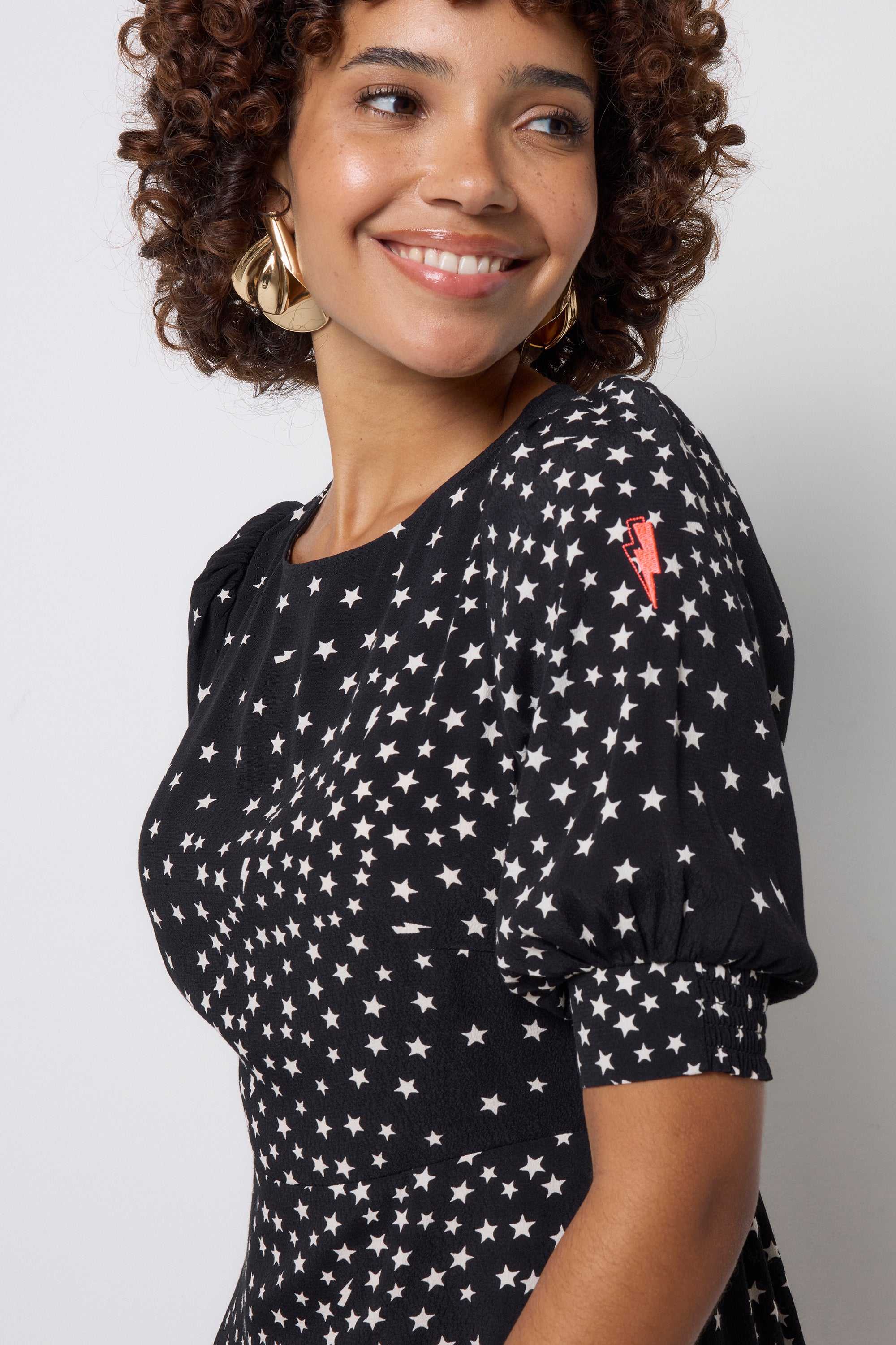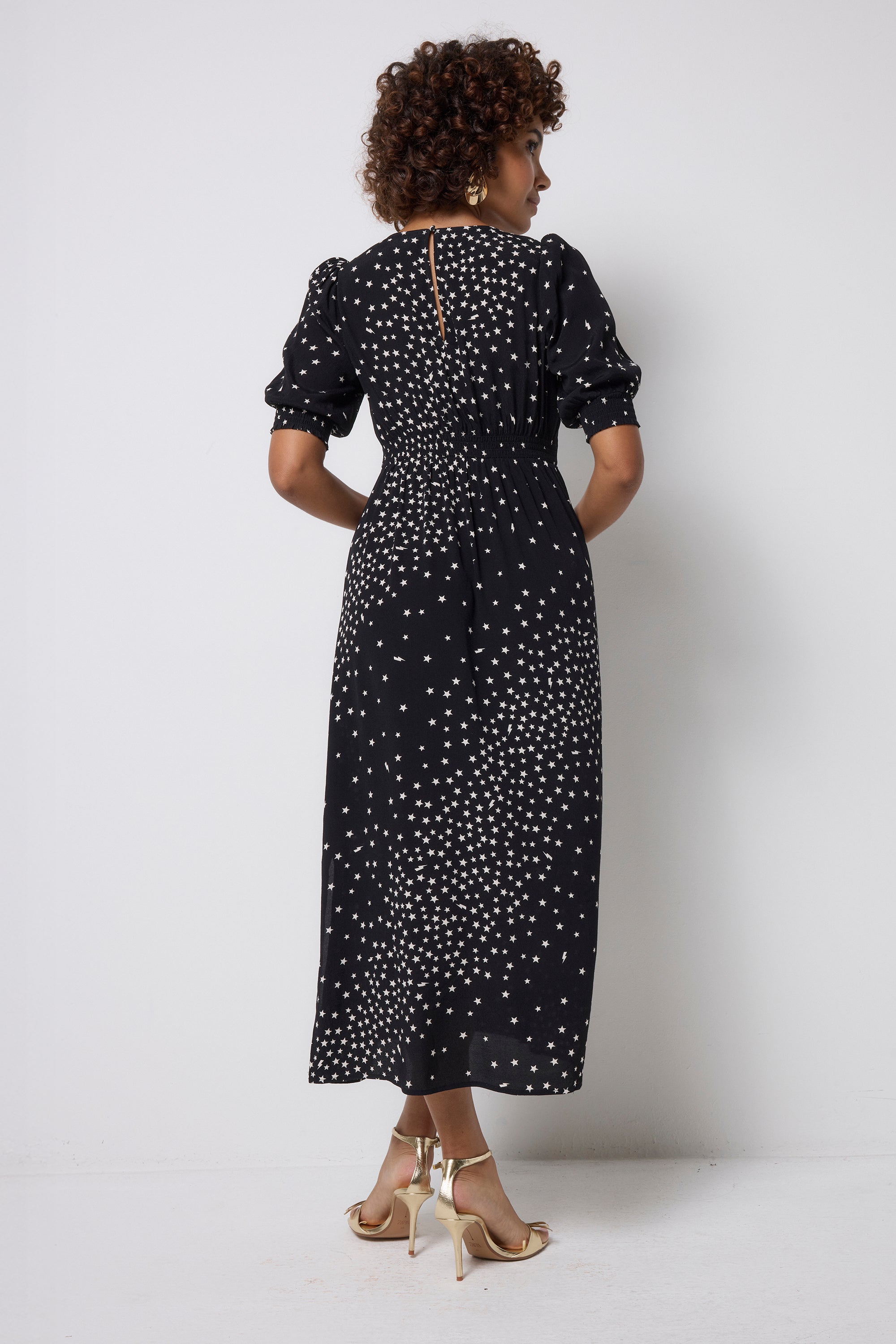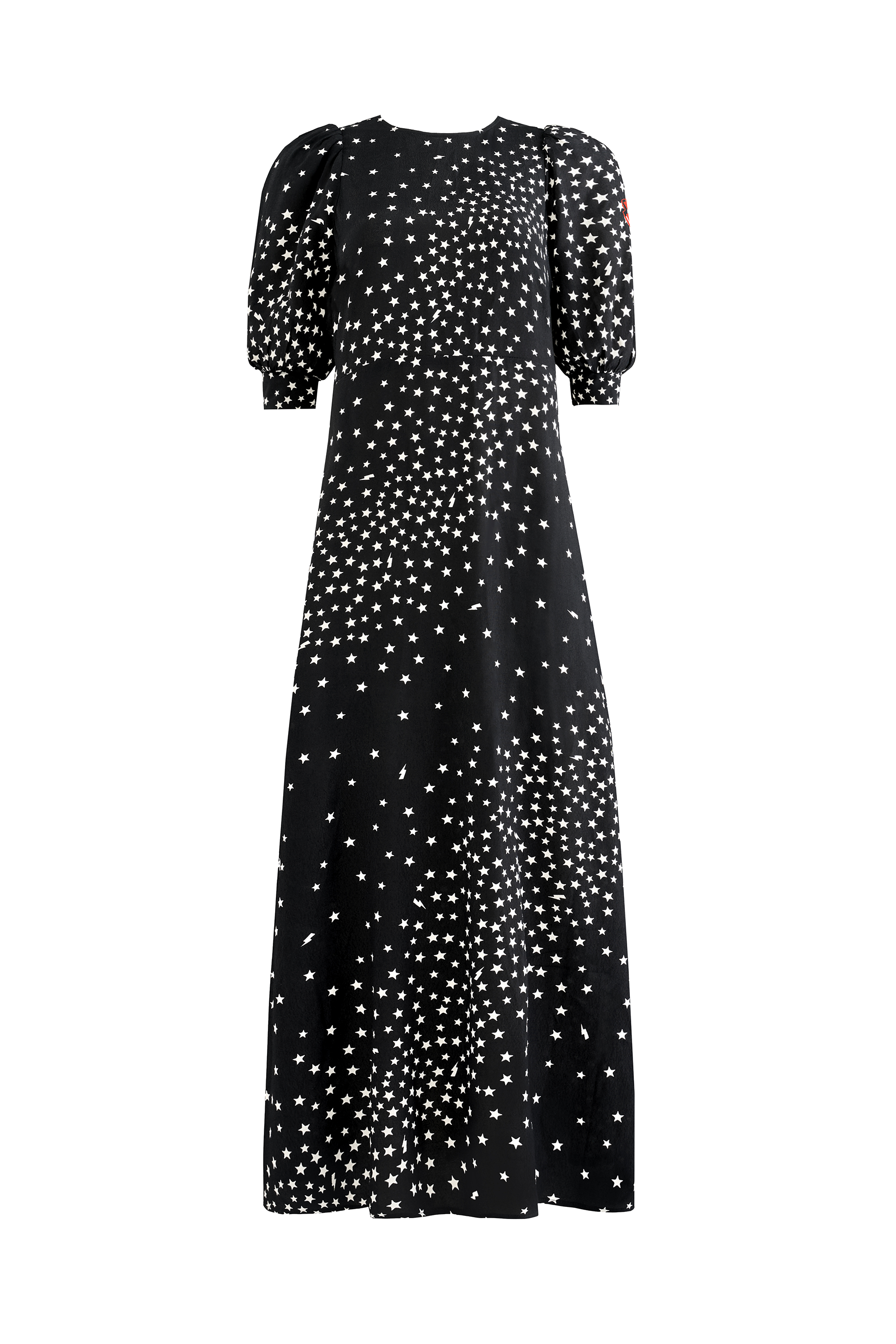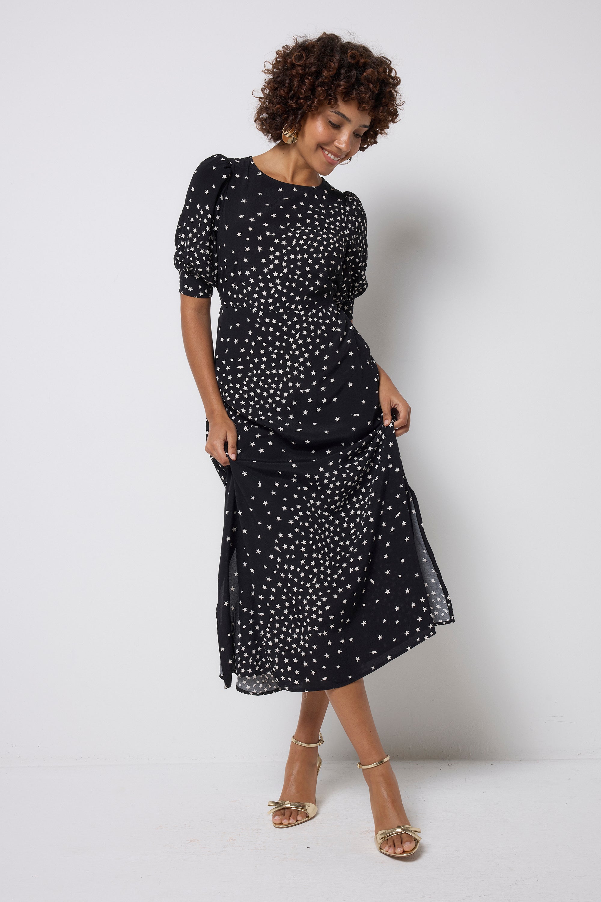 Reach for the stars. Our black with white star cluster print and lightning bolt midi dress is perfect for party season and beyond. Made in a soft viscose crepe fabric, the midi length dress features a classic neckline, short puff sleeves and a silhouette that's simply out of this world.