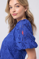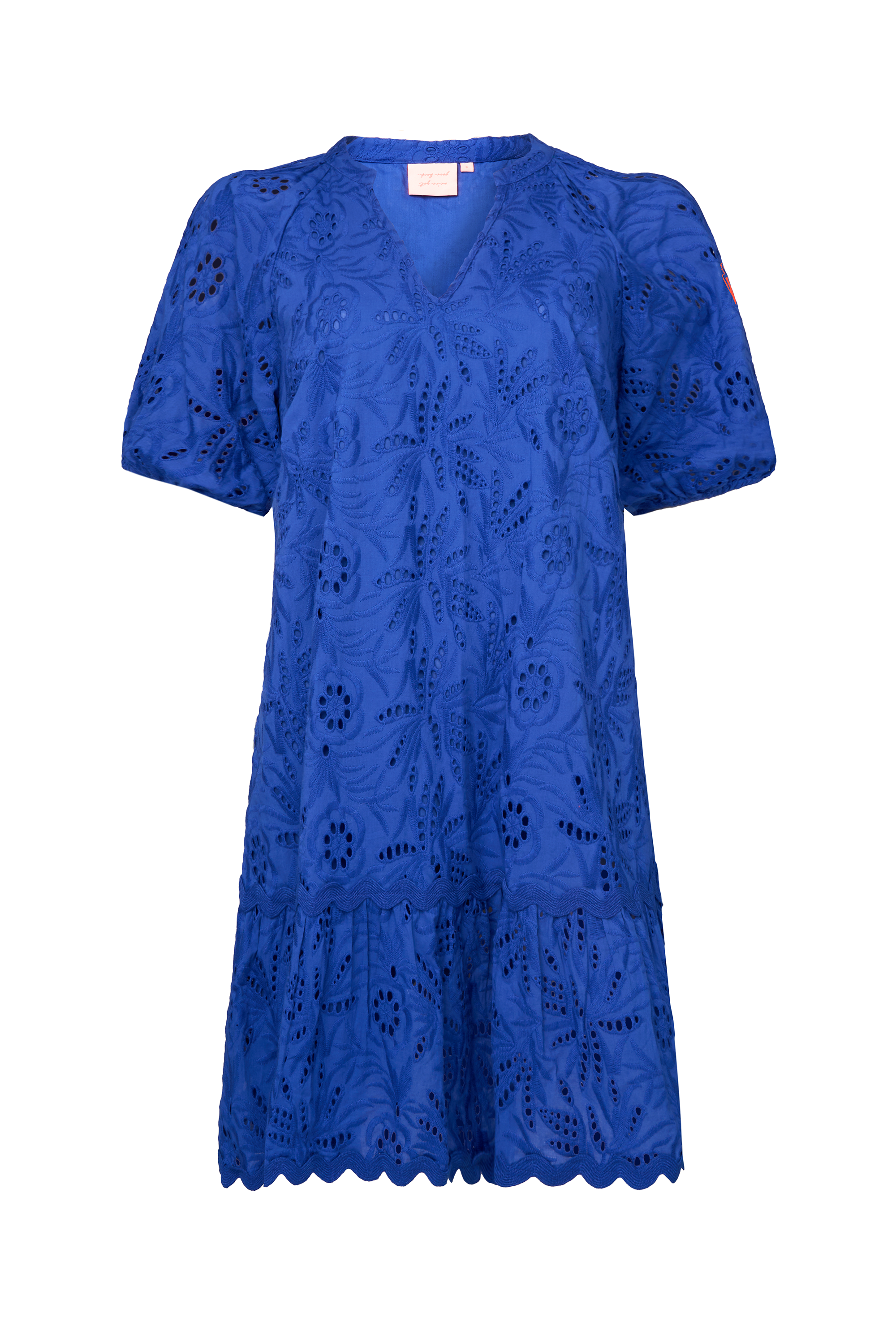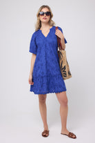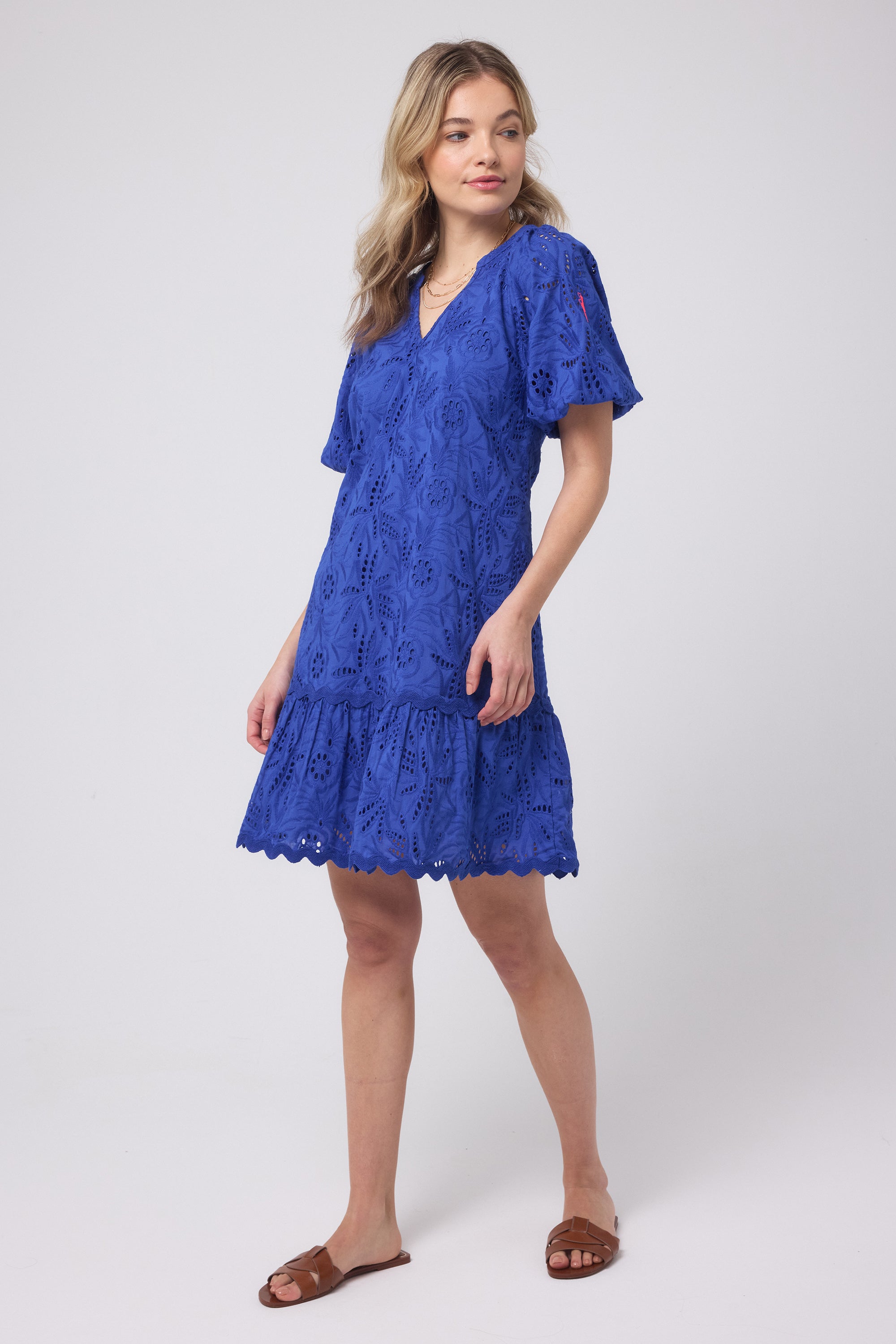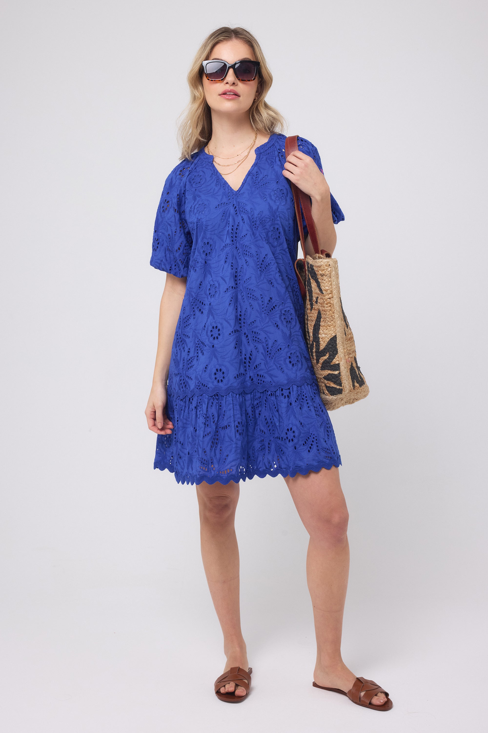 Crafted from soft cotton, this blue broderie anglaise dress is all about romantic charm. Featuring blouson sleeves and a tiered hem, throw yours on with sandals and shades for a sunny day brunch.