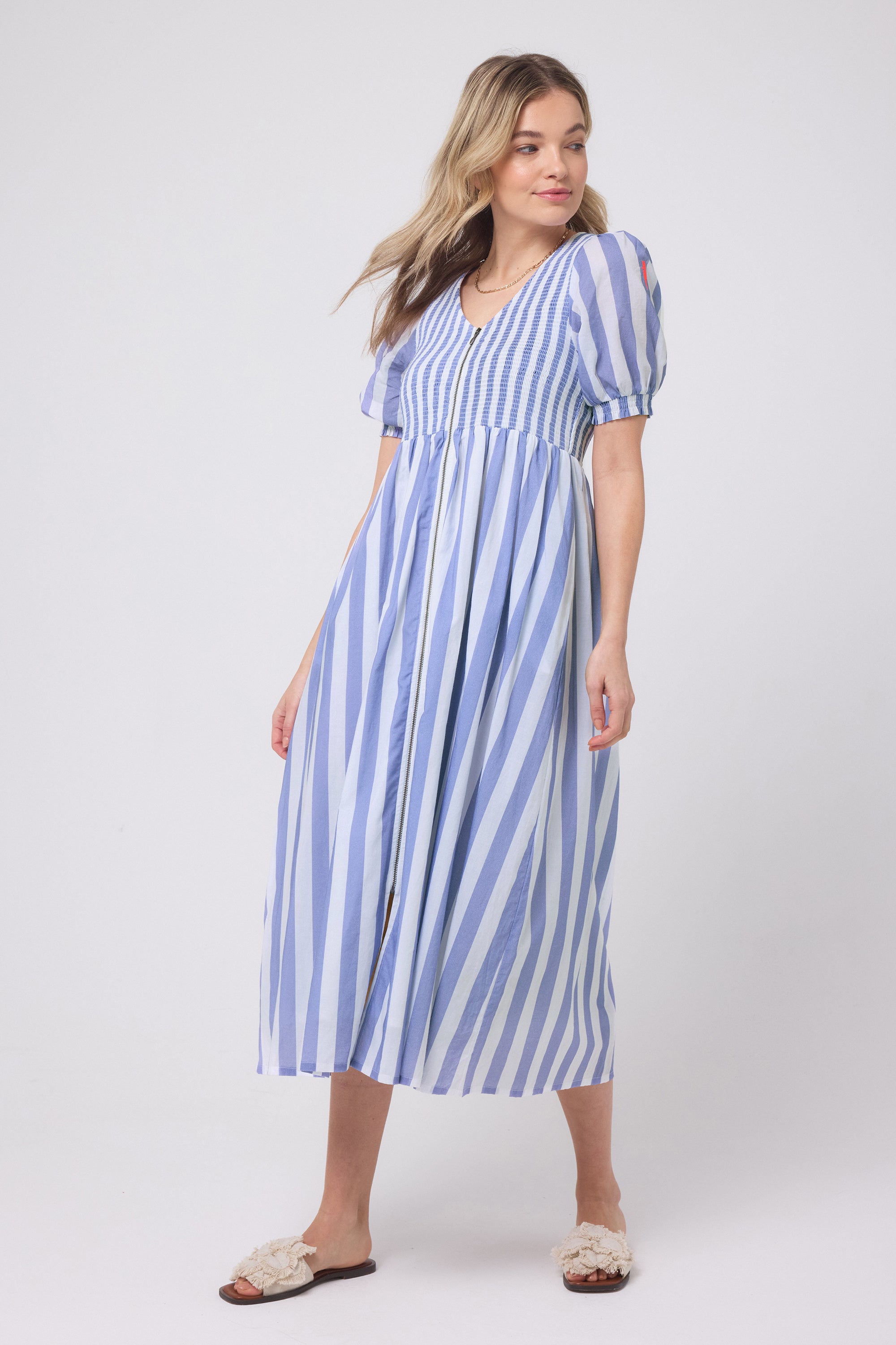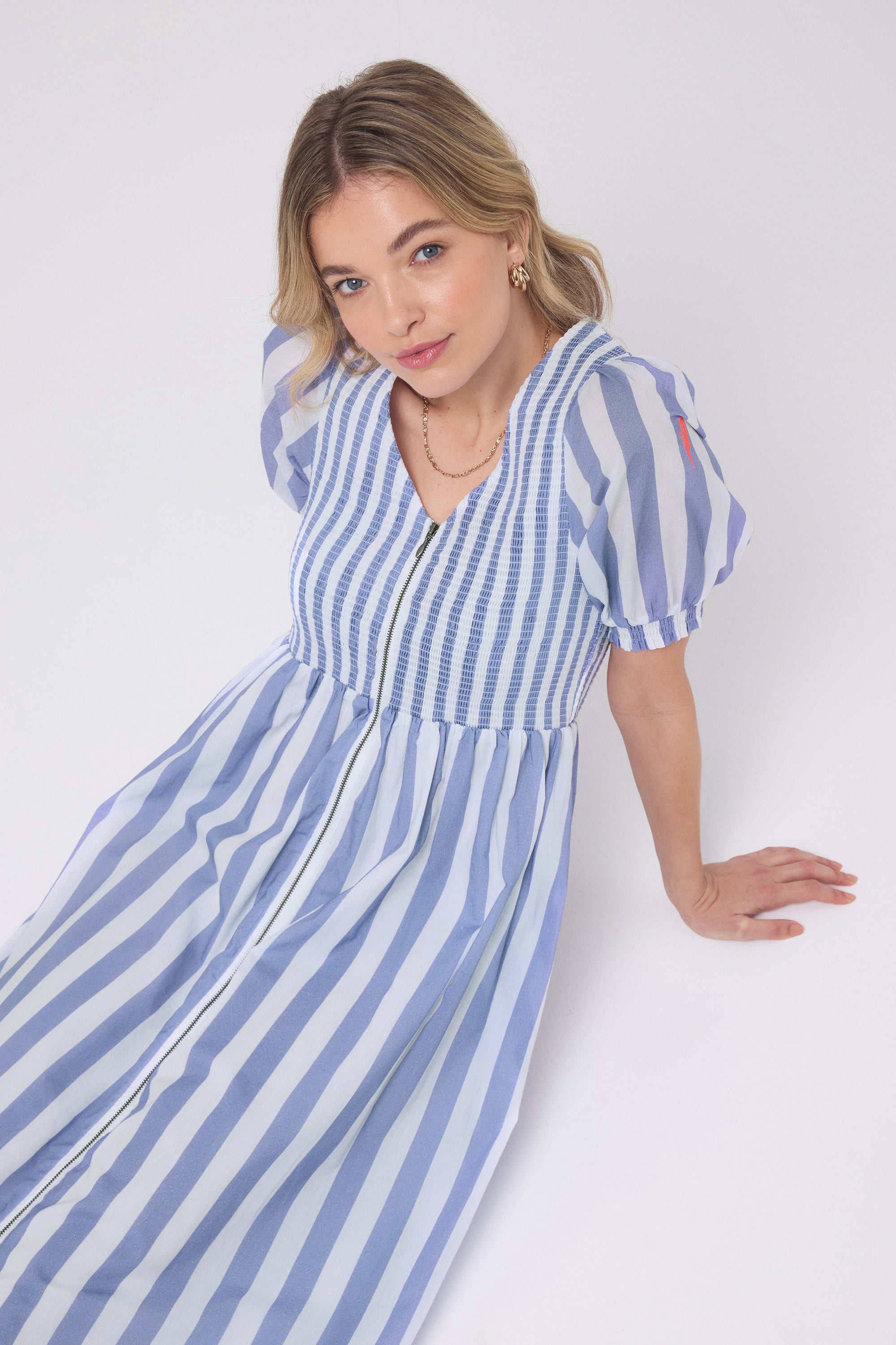 Blue with White Stripe Shirred Zip Detail Midi Dress