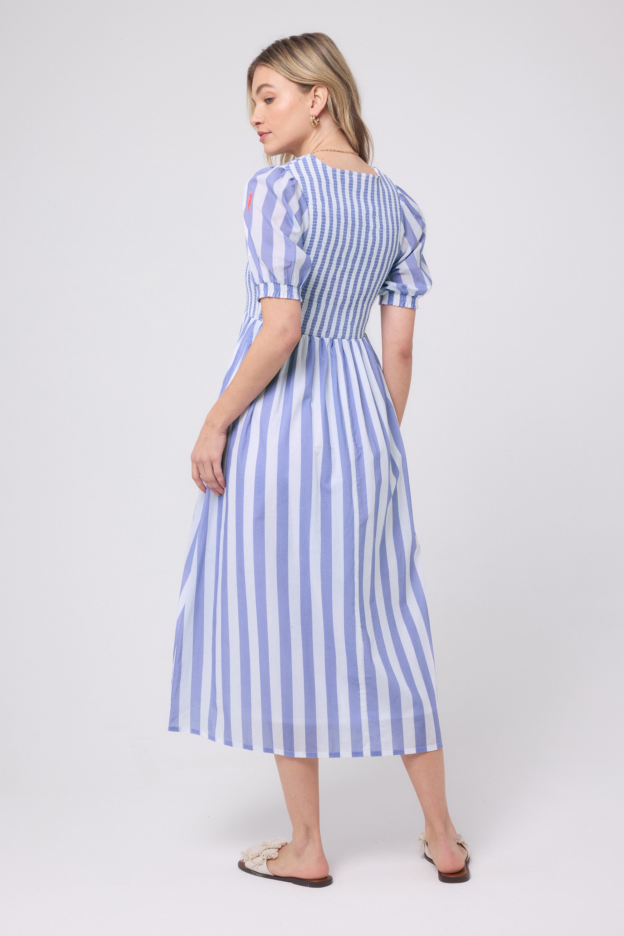 This blue with white stripe midi dress is destined to be a favourite in your wardrobe. It's finished with pretty short blouson sleeves and a tiered skirt for an added touch of style.