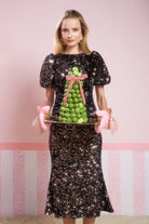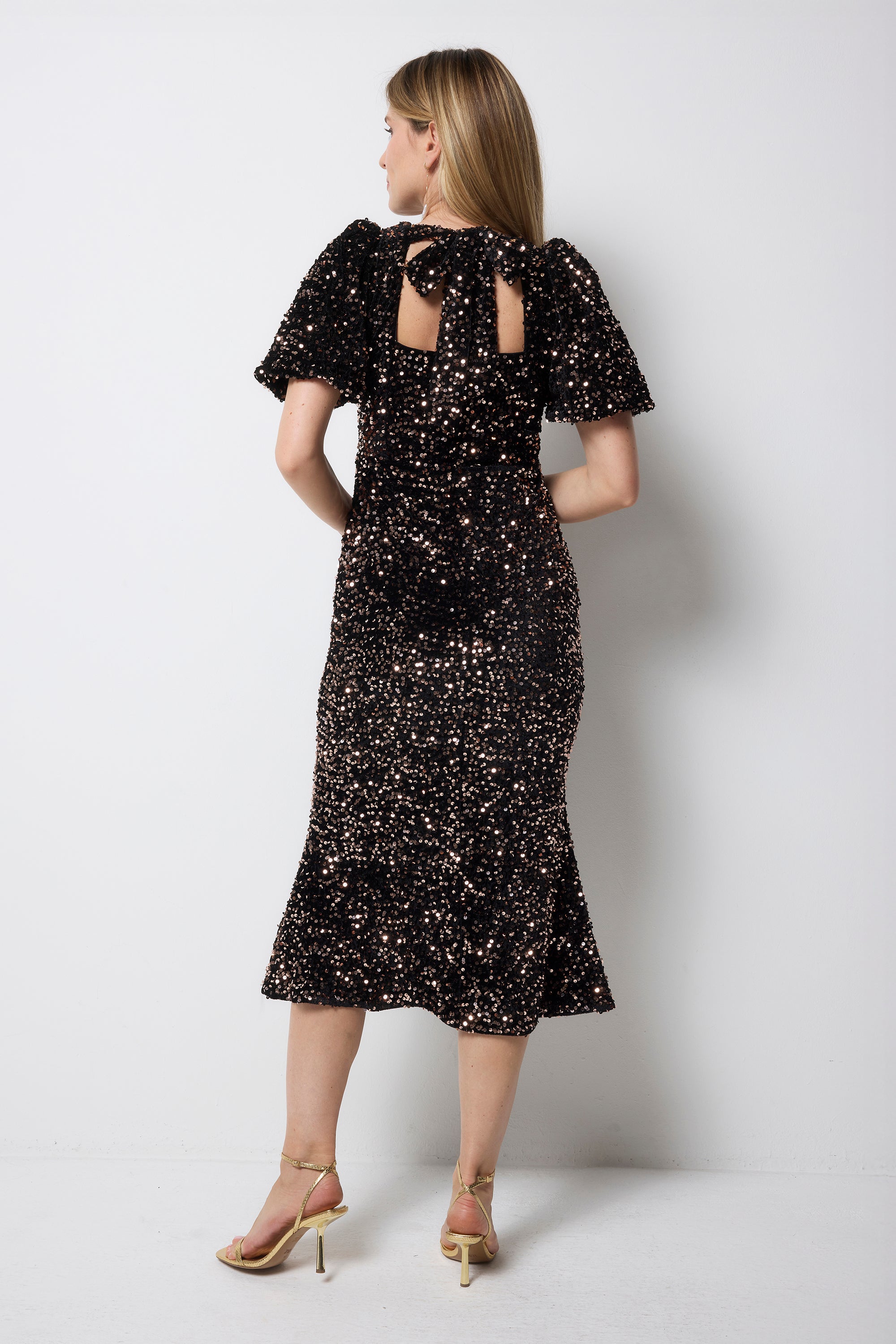 Bronze Sequin Tie Back Puff Sleeve Velvet Midi Dress